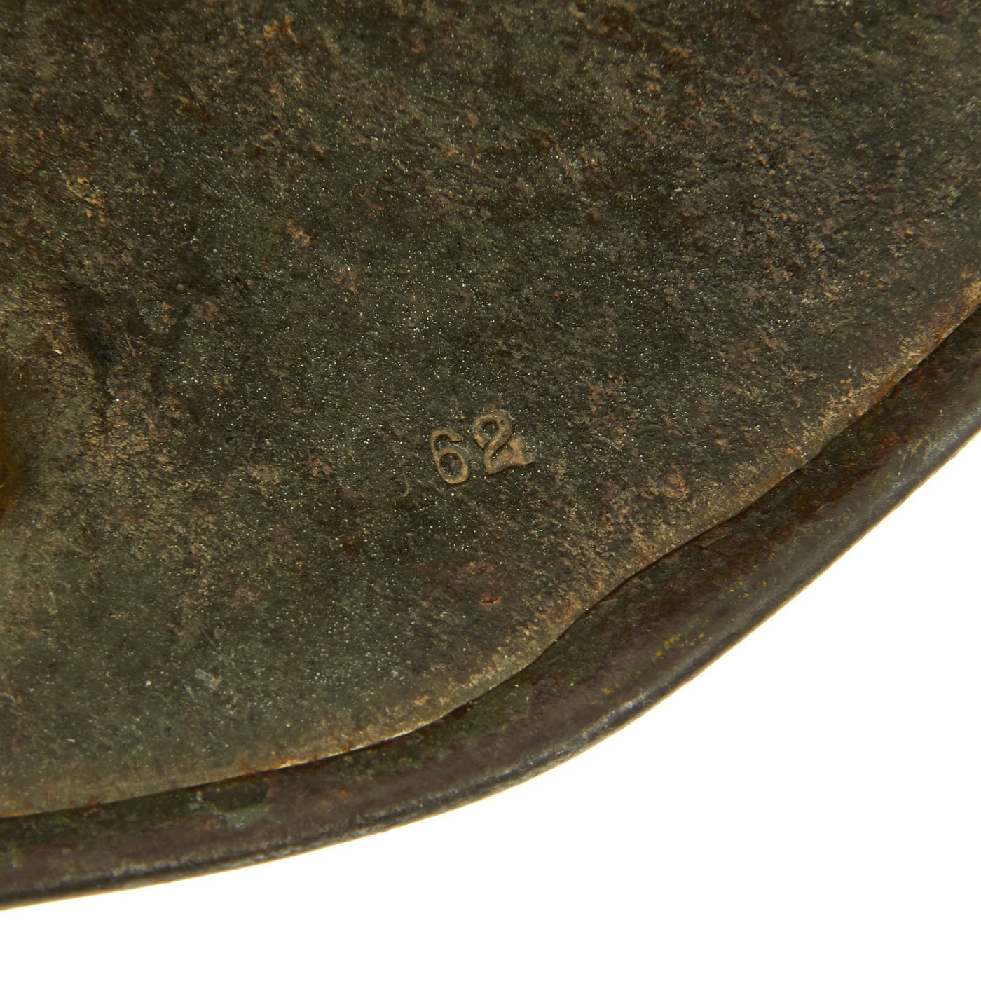 The shell is very faintly stamped N.J next to size 62 indicating that Vereinigte Deutsche Nickelwerke of Schwerte i/Westfalen manufactured it. This company made shells in size 62 ONLY for the war effort. Size 62 is a smaller size that can accommodate liners from 54cm to 55cm or US 6 3/4 to 6 7/8. There is also dome stamp R / 692 stamped into the interior crown, indicating the steel was rolled by Stahlwerk Röchling in Volkingen.