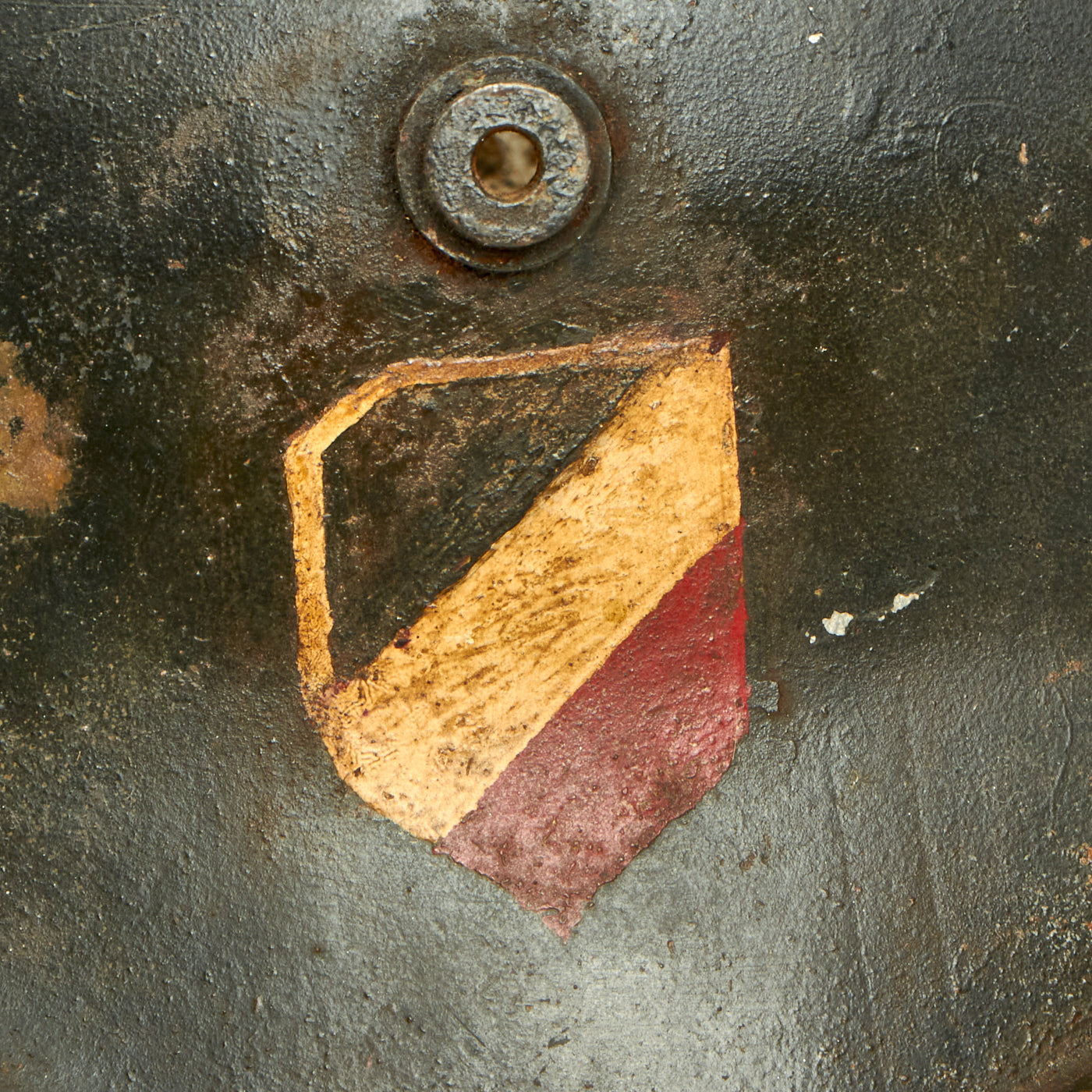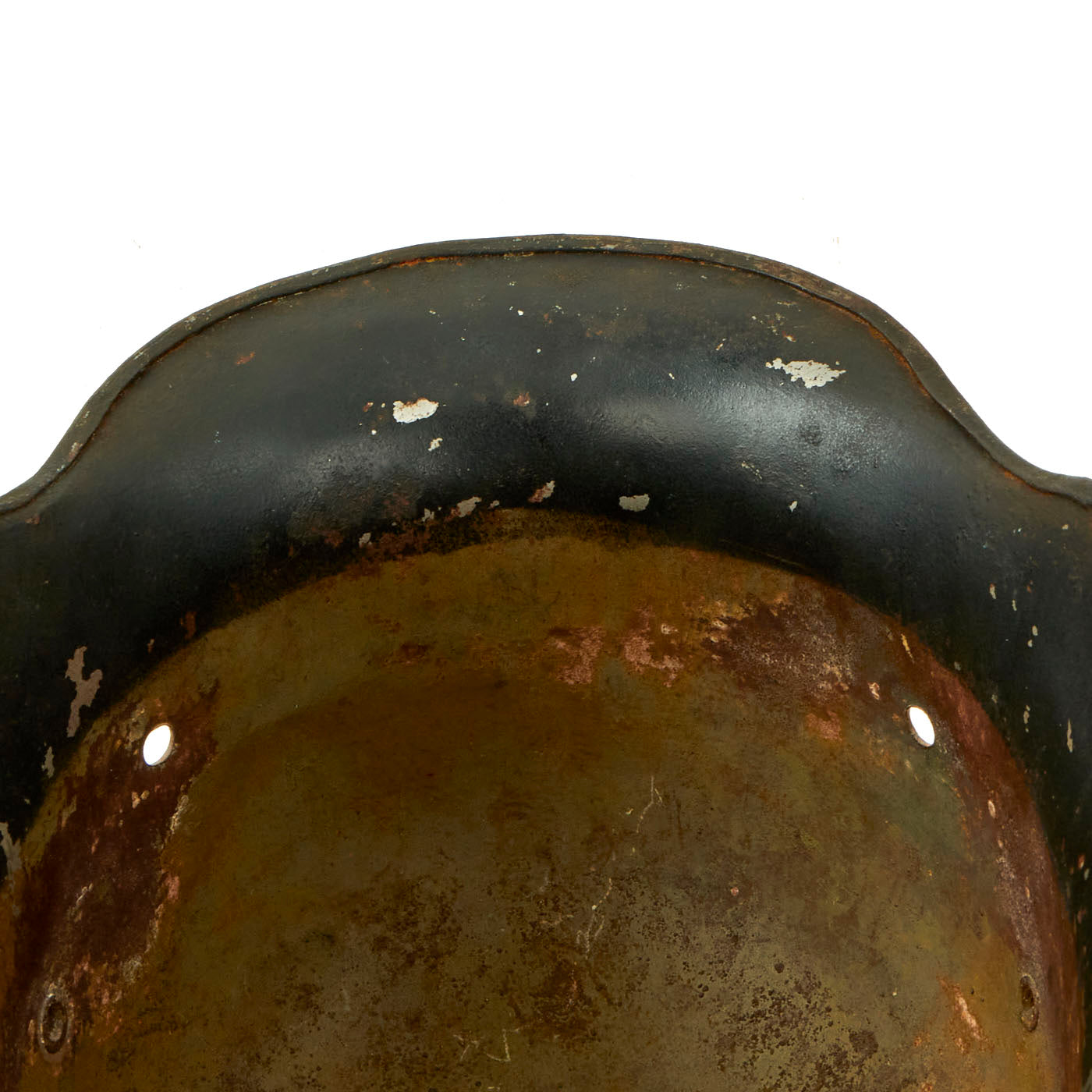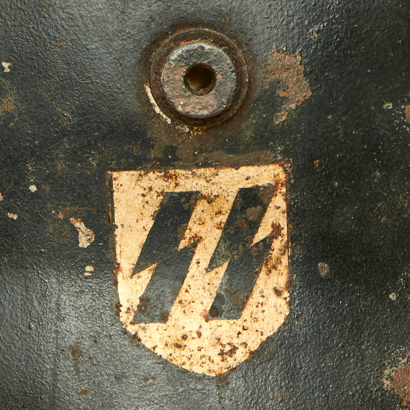 After the modifications, the exterior and bottom of the interior were painted black in "field repaint" style, and then had a painted tri-color added on the left side, along with a Genuine surplus SS decal being added on the right side. These decals were relatively common on the market during the immediate post war years, as stocks of original decals were discovered during the occupation era. Condition of the shell is very good, showing service wear and some oxidation, though we do not know if is original period, added by the collector, or occurred since. Definitely an interesting piece, meant to look like a WWII SS Reissue of an extremely rare helmet type.