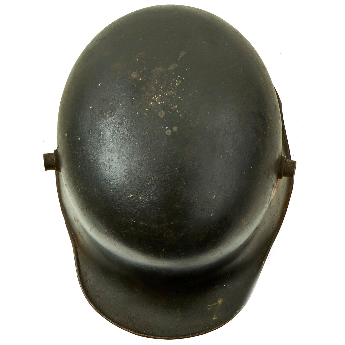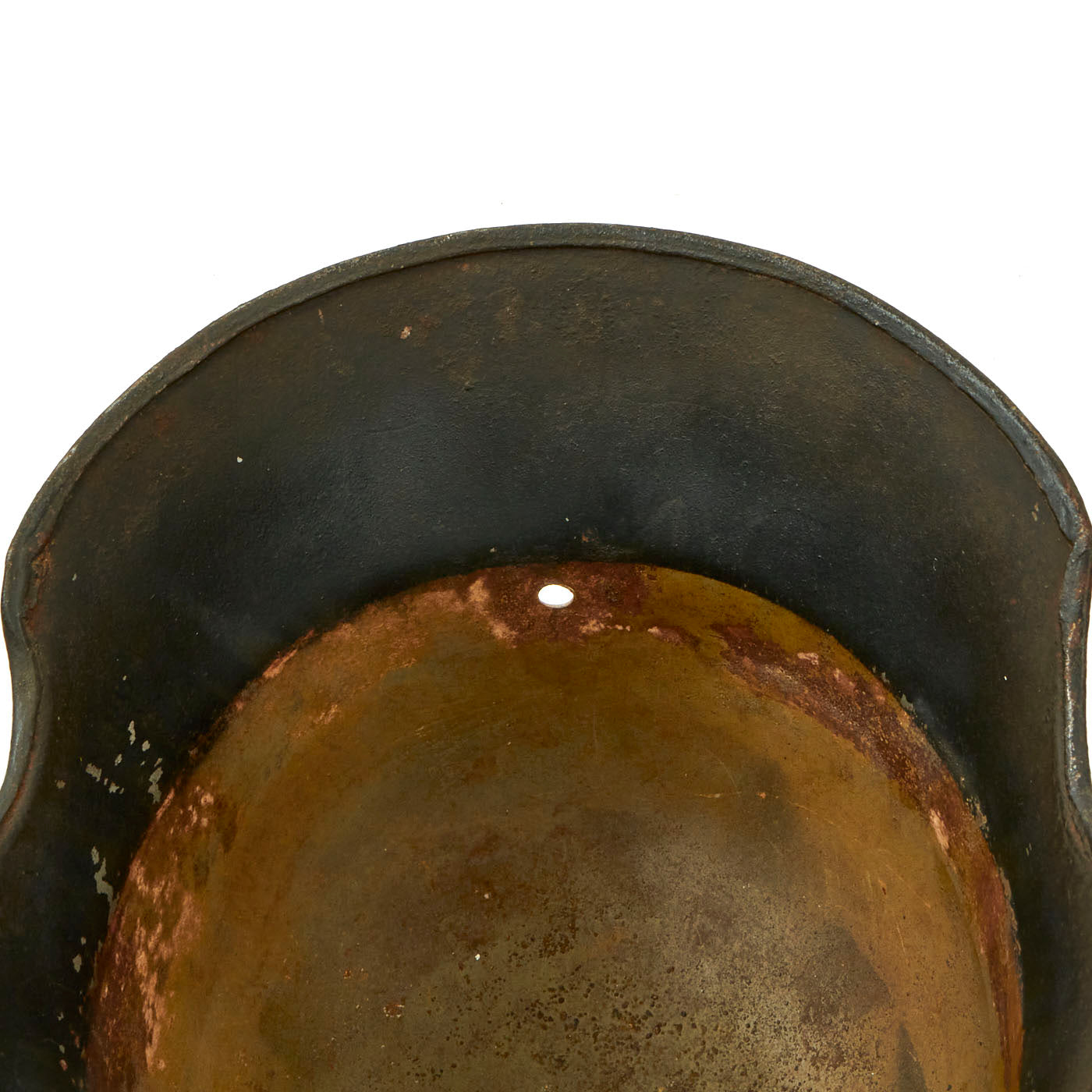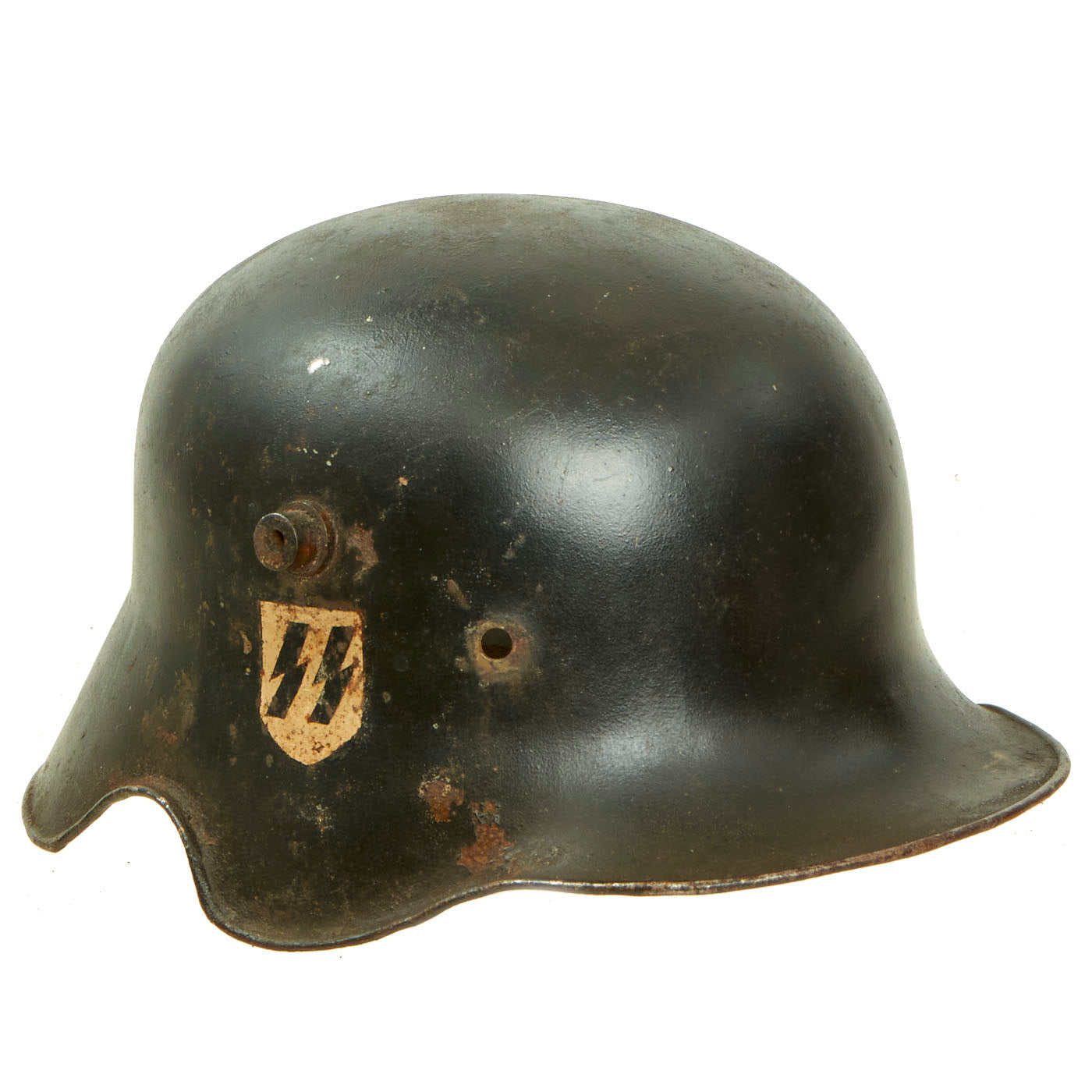 After the modifications, the exterior and bottom of the interior were painted black in "field repaint" style, and then had a painted tri-color added on the left side, along with a Genuine surplus SS decal being added on the right side. These decals were relatively common on the market during the immediate post war years, as stocks of original decals were discovered during the occupation era. Condition of the shell is very good, showing service wear and some oxidation, though we do not know if is original period, added by the collector, or occurred since. Definitely an interesting piece, meant to look like a WWII SS Reissue of an extremely rare helmet type.