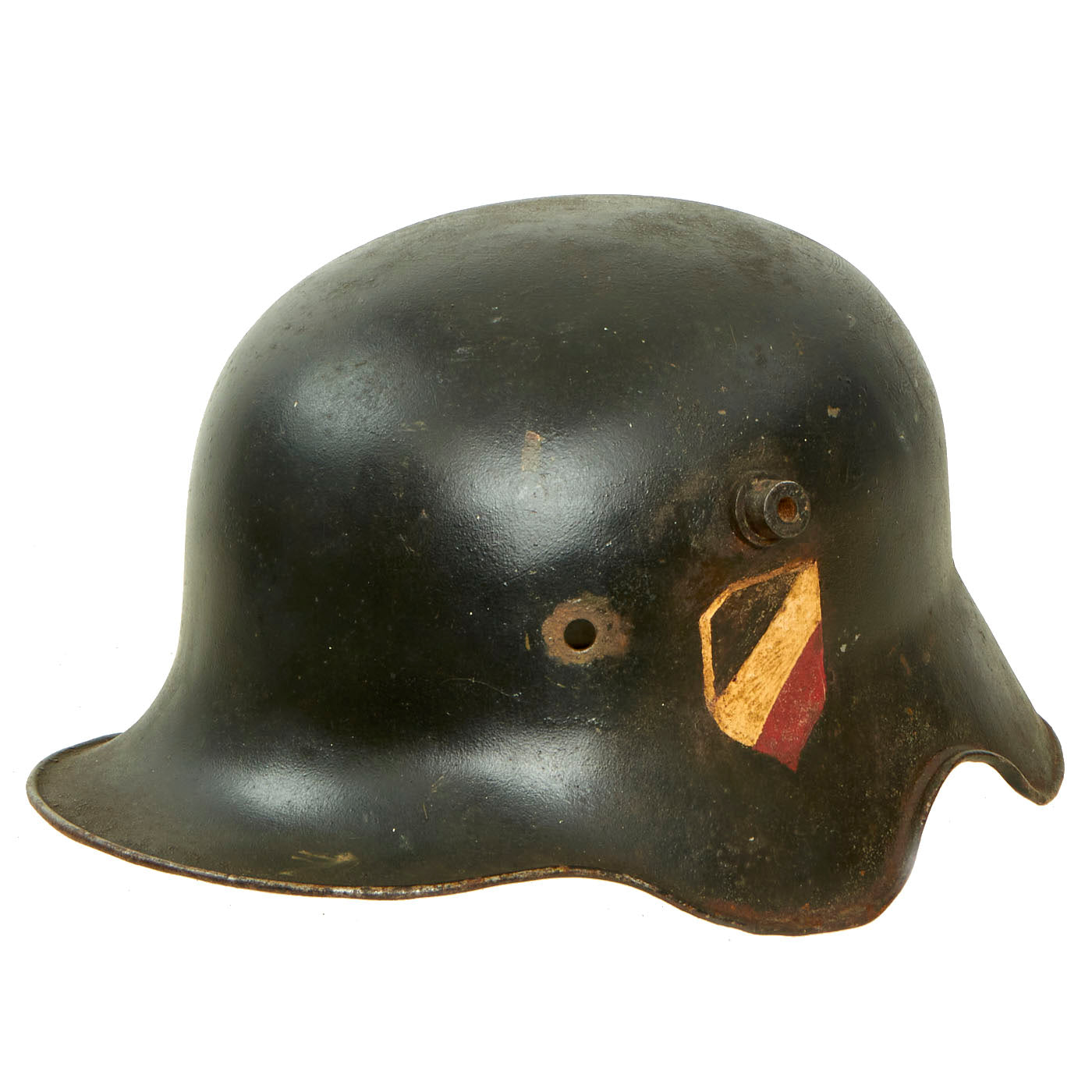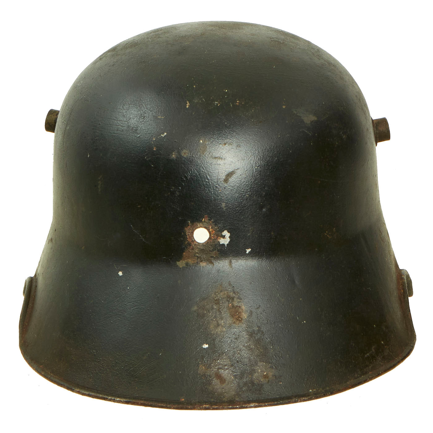 Original Item: Only One Available. This is a very interesting example of an original WWI German M18 Helmet shell, which was collector modified after being brought home, most likely after WWII. It looks like the exterior paint was stripped, as well as the interior paint below the liner area. The sides of the helmet were changed to look like a rare M18 "cut out" helmet, which were originally made to accommodate headphones. There is however no maker mark, and the rolled edge in those cut out areas is not nearly as neat as the rest of the helmet. The edge is also flared out more than it should be, so it definitely looks to have been modified to produce a nice "collector's" helmet.