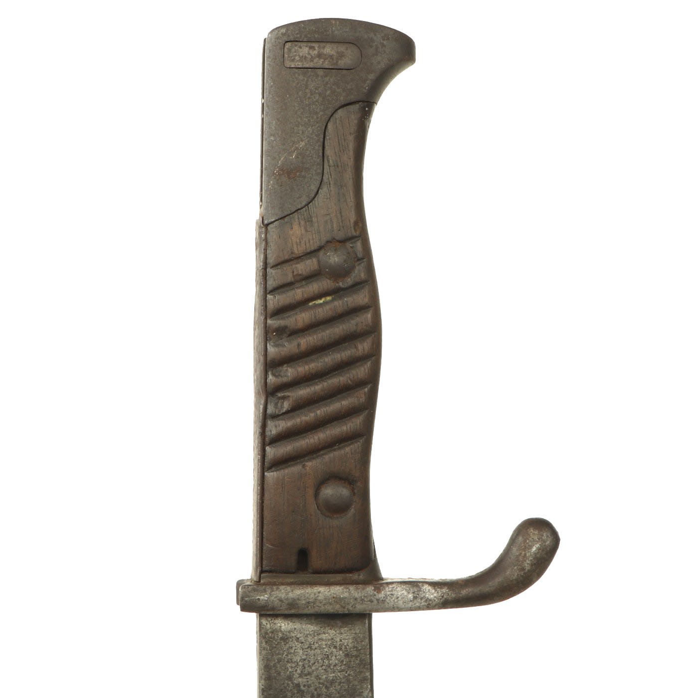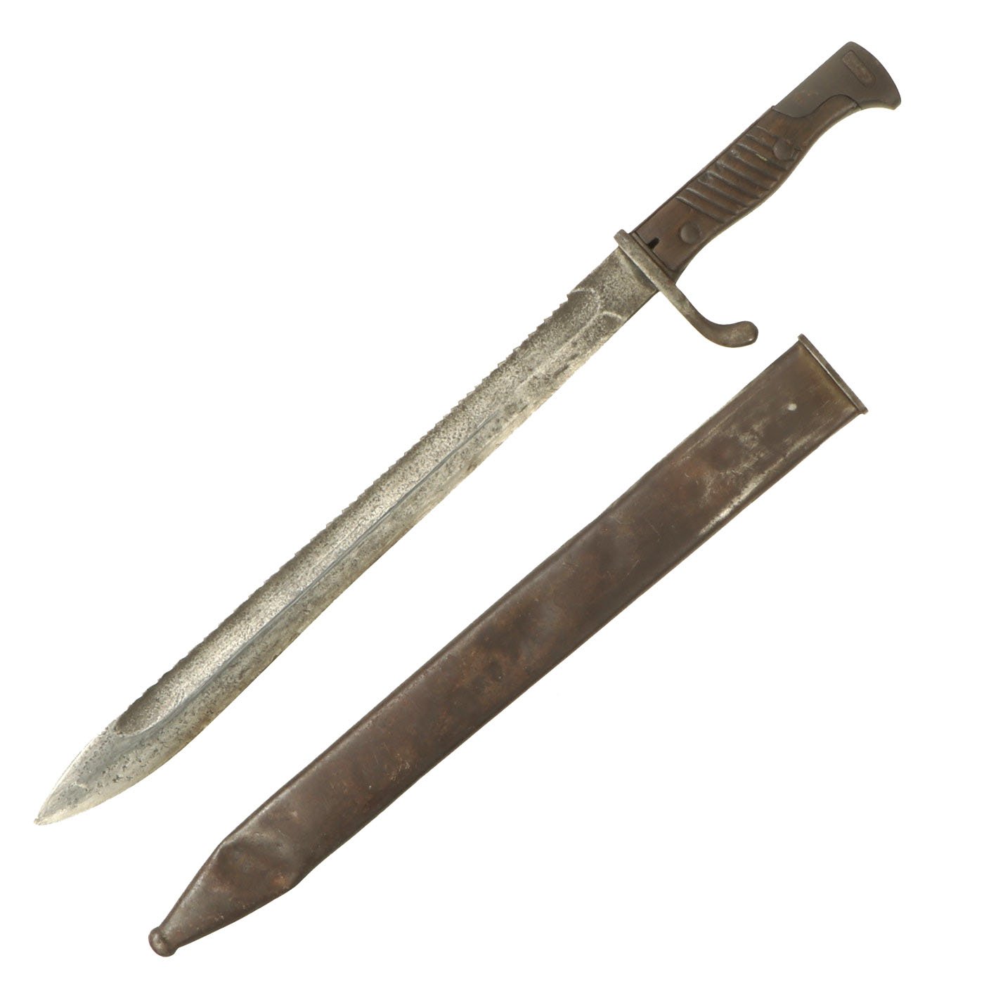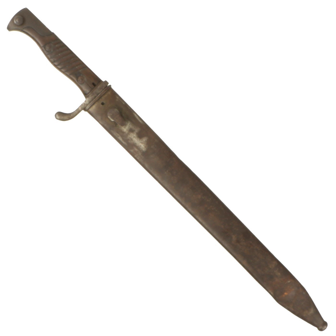Original Item: Only One Available. This is a good service used example of the M-1898/05 Bayonet (Seitengewehr), which was the most common German Bayonet of the First World War. It was intended for use on the standard issue service rifle of Imperial Germany: the Mauser-designed Gewehr 98 (GEW 98). It features a heavy 14.5-inch steel blade with distinct bulge toward the point, giving extra weight and power to the business end, known as a "butcher blade". This version is known as n/A (neuer Art = newer model). This second pattern lacks the first pattern's vestigial muzzle ring (or 'ears') and has a flashguard on the back of the grip.