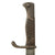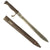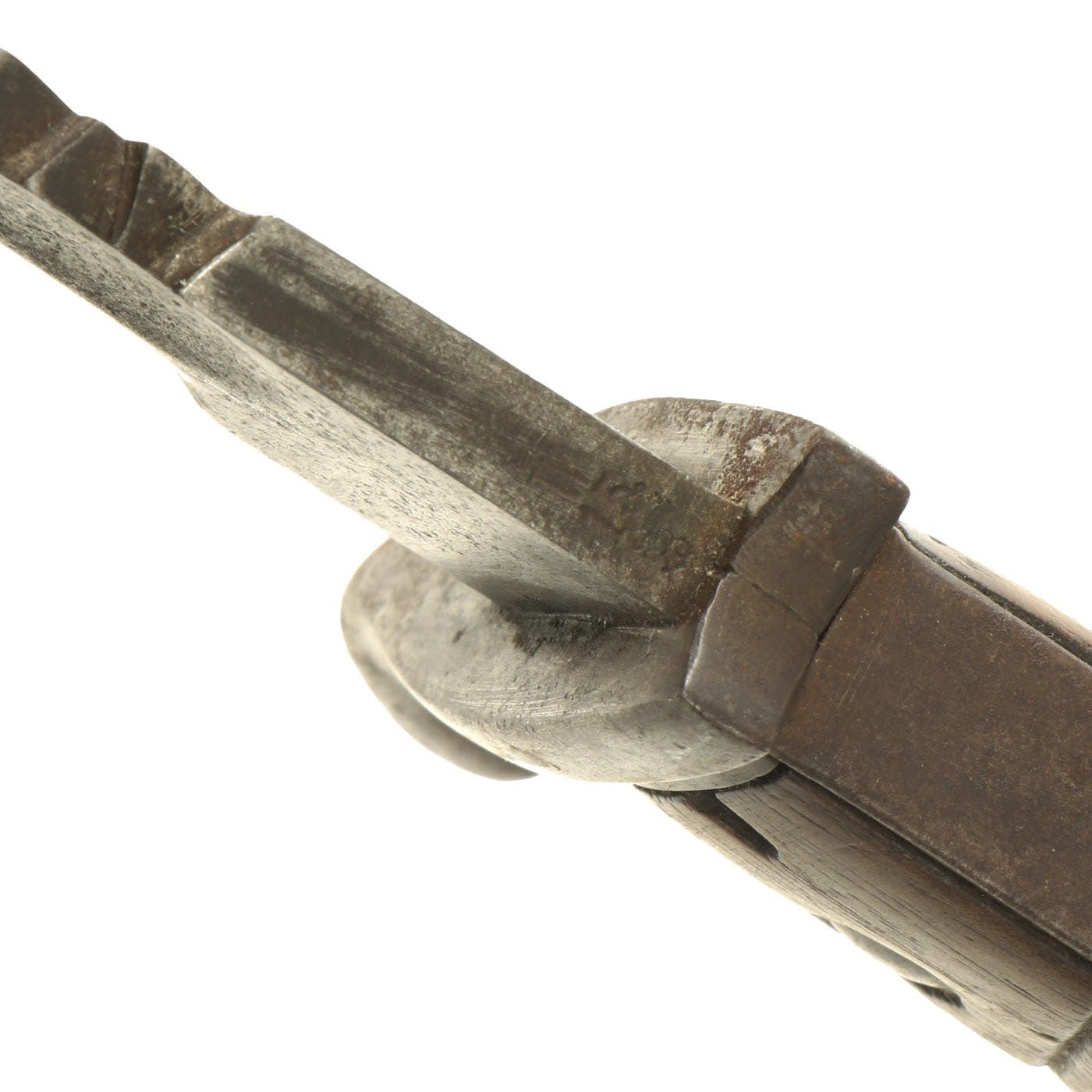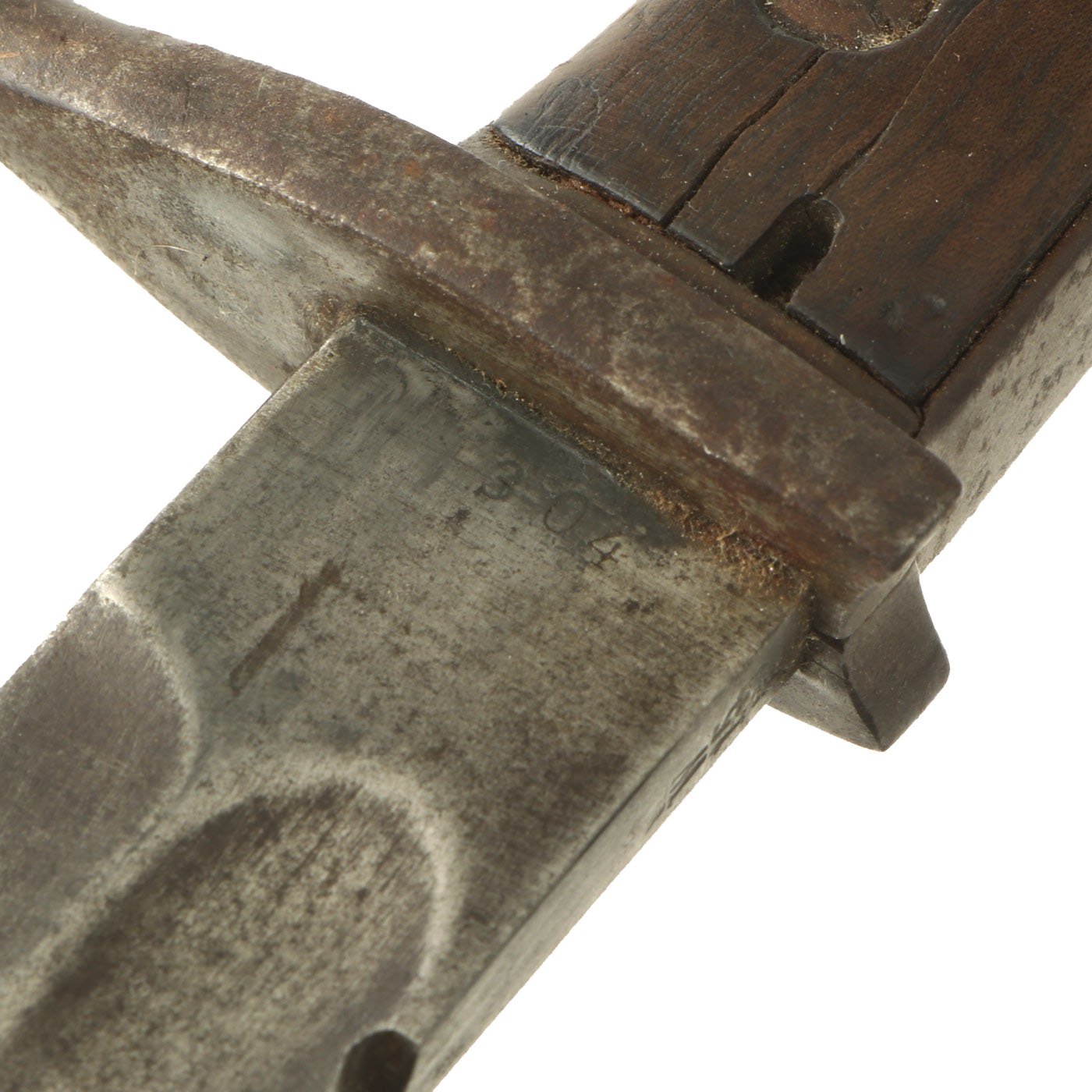 The hilt has a nice set of original grooved wood grips, which have a lovely aged brown color, and some scratches and small dents. They do show age and light cracking, as well as denting near the flashguard, which also has dents in it. The metal of the hilt has an oxidized brown patina over most surfaces, however the bayonet lock is fully functional. The blade is dated on the blade's spine 15 under a proof mark of a Crown over W., for Kaiser Wilhelm II, and indicating the date it was accepted into service.