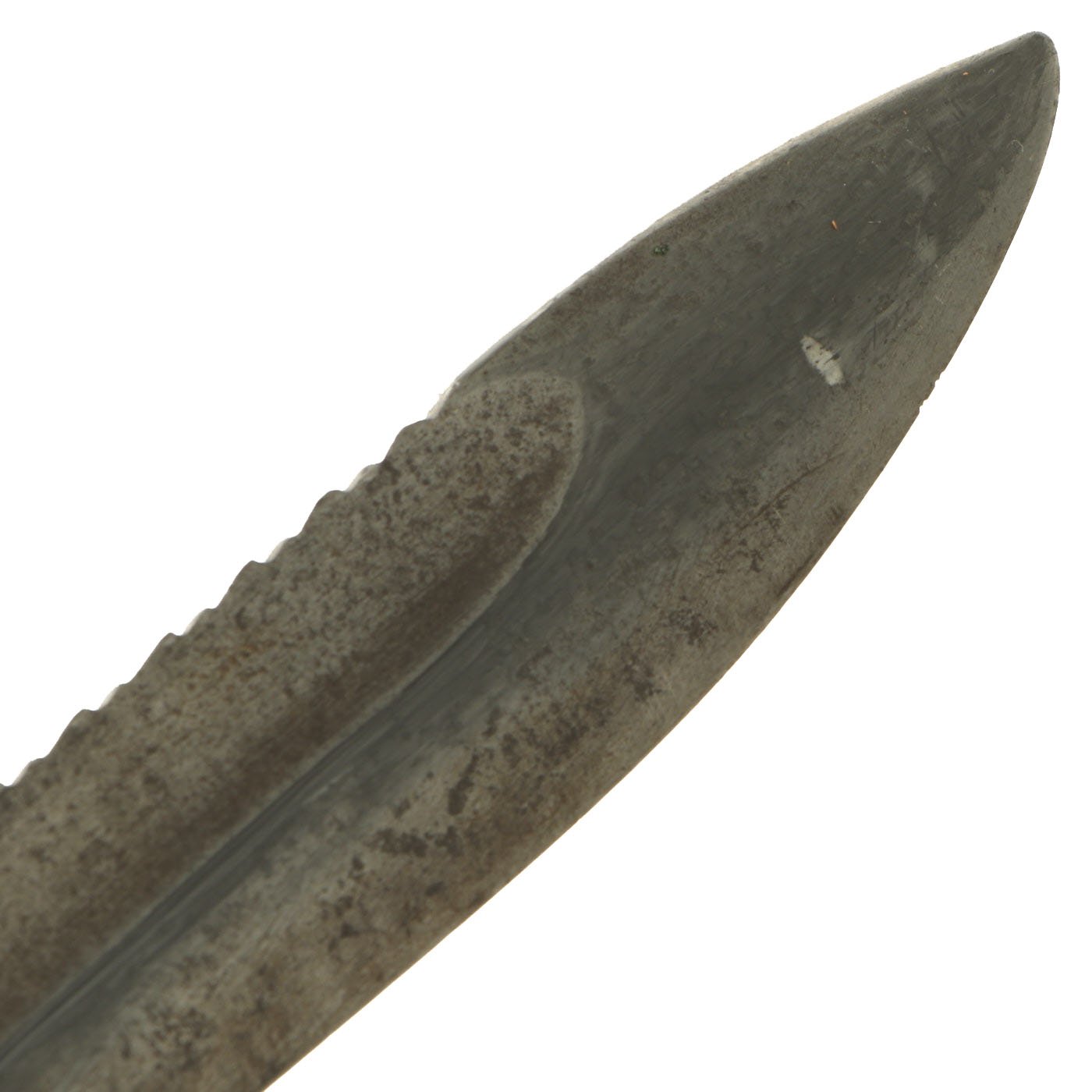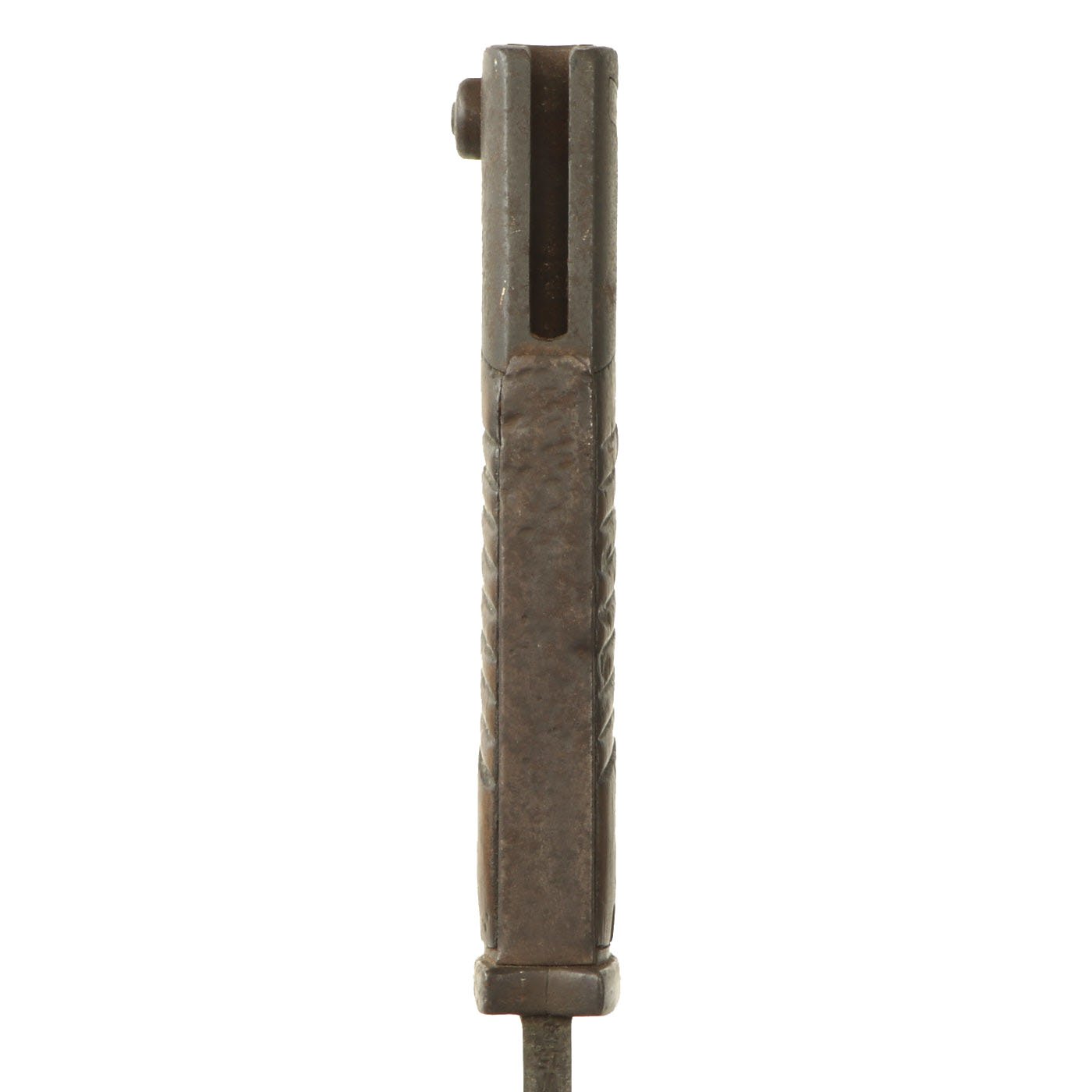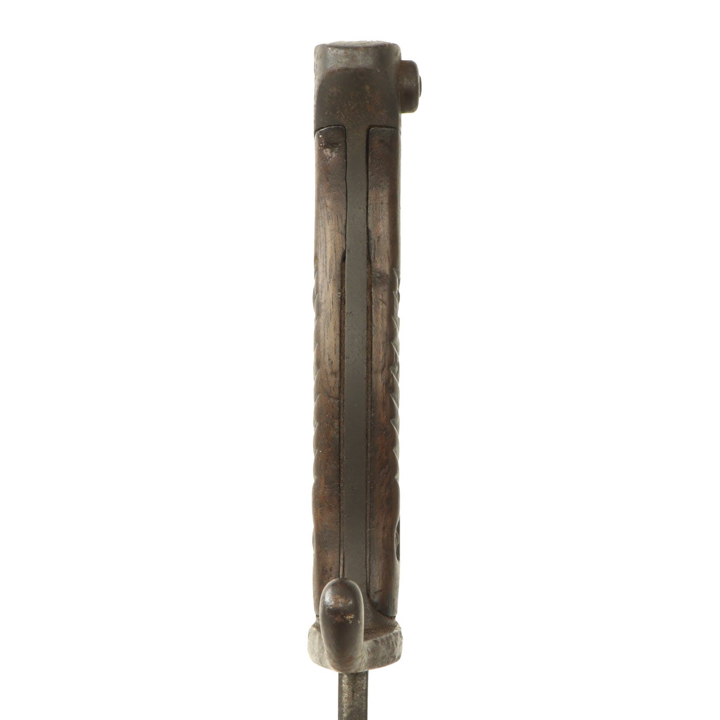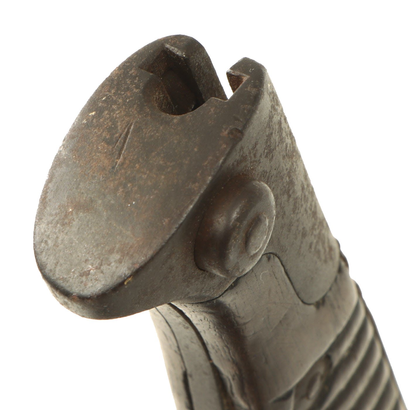 This example has a very desirable "sawback" blade, which was intended for use by pioneers to saw through brush and obstacles. Unfortunately a rumor got out that it was intended to inflict grievous harm on enemies, so a lot of the sawback bayonets had this feature removed, making them hard to find. This example has a blade in good service used condition. The blade finish has speckling, and definitely shows that this bayonet was used extensively while in service, and possibly afterwards. The main edge has been sharpened several times, and the tip is a bit rounded. The sawback is still intact, but also shows wear from use, and possibly contact with the scabbard.