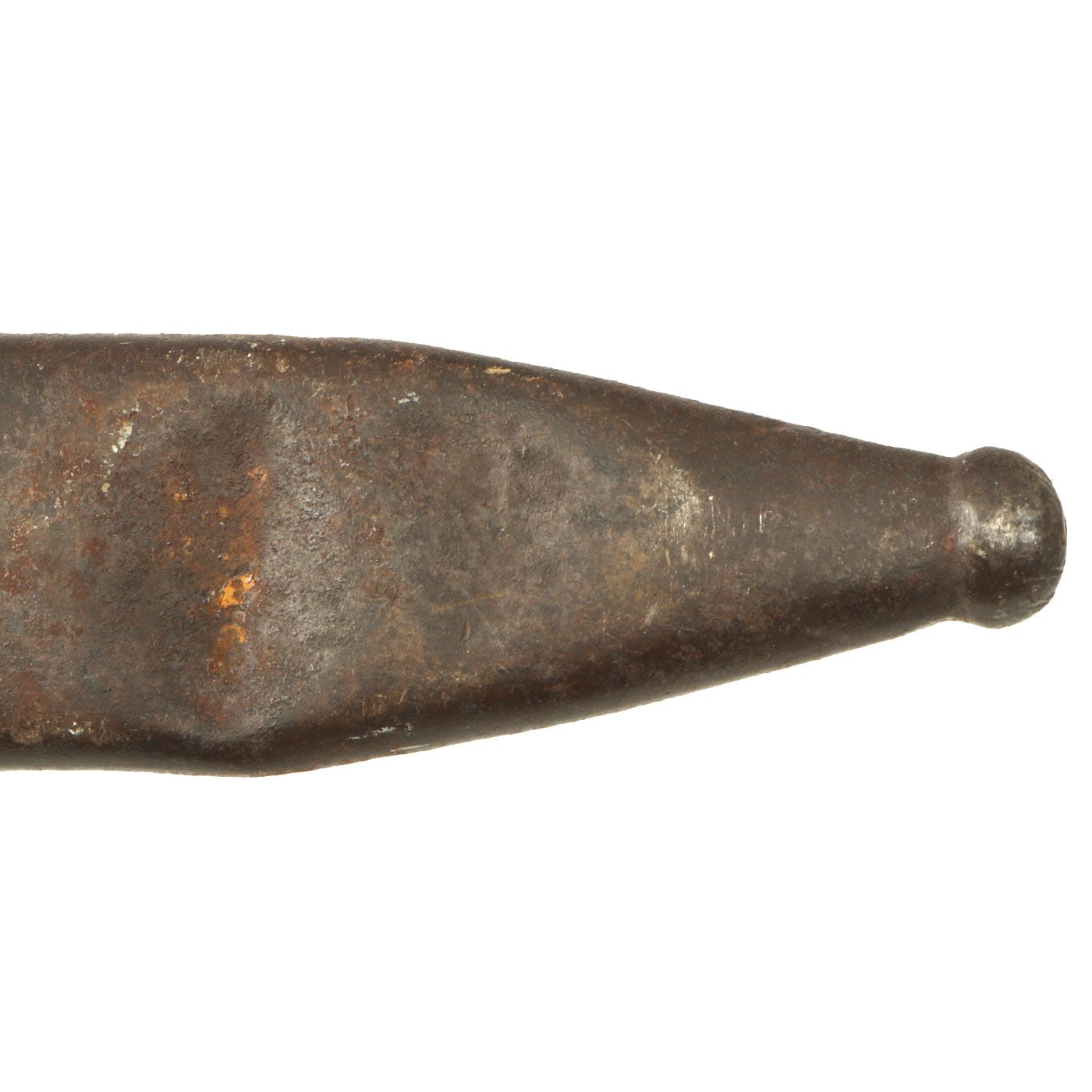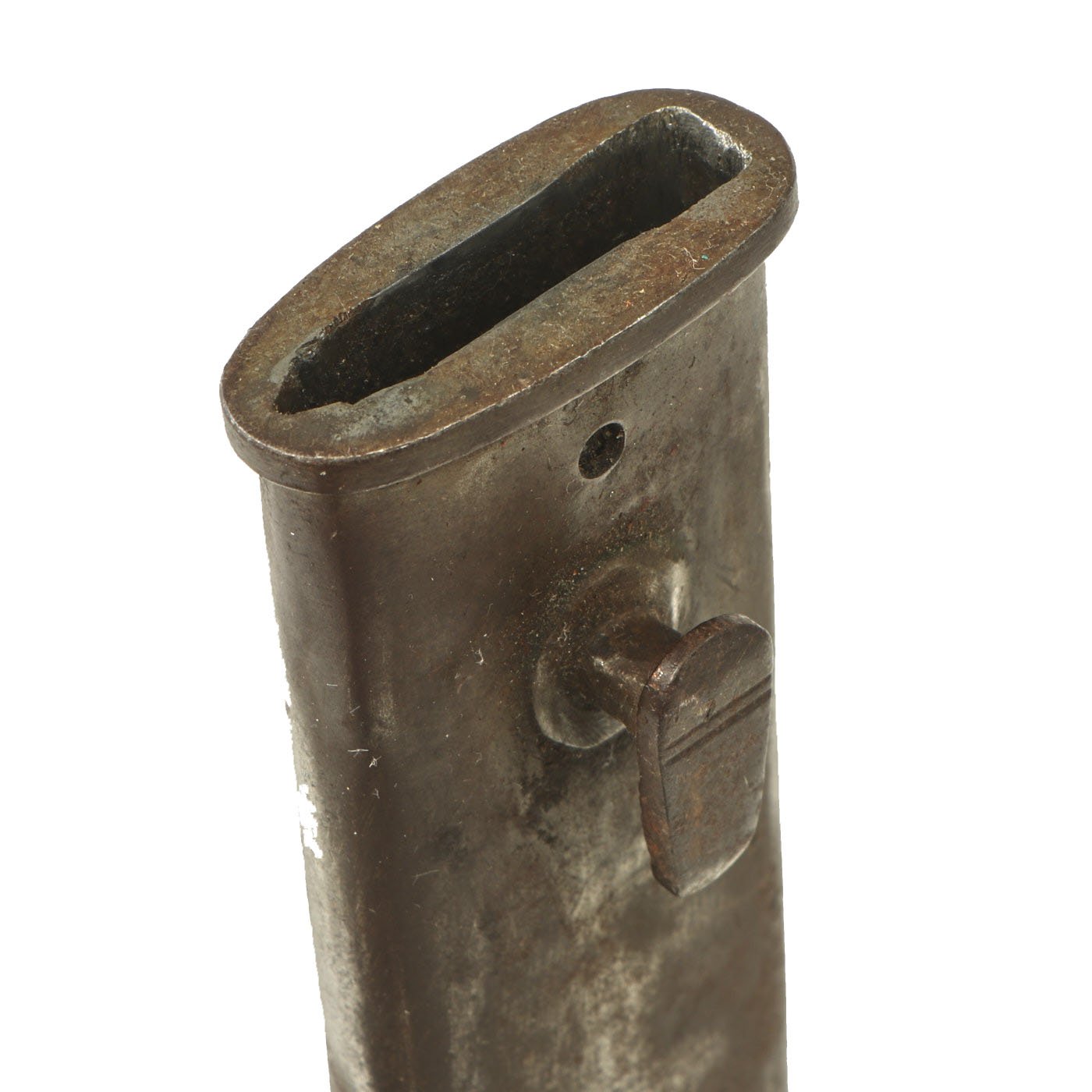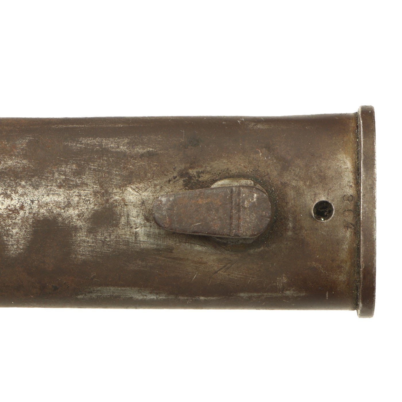 The steel scabbard is in good condition, though it is missing the screw that retains the throat, and has some significant dents near the bottom. Overall the finish shows some of the original bluing, with the rest worn and showing light oxidation.