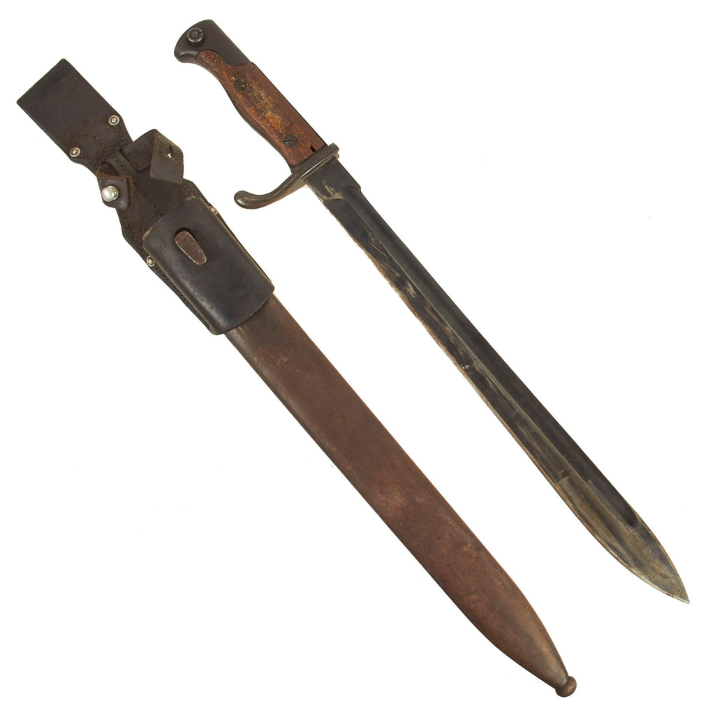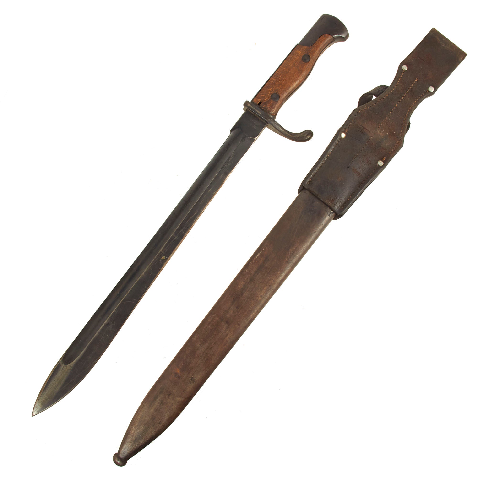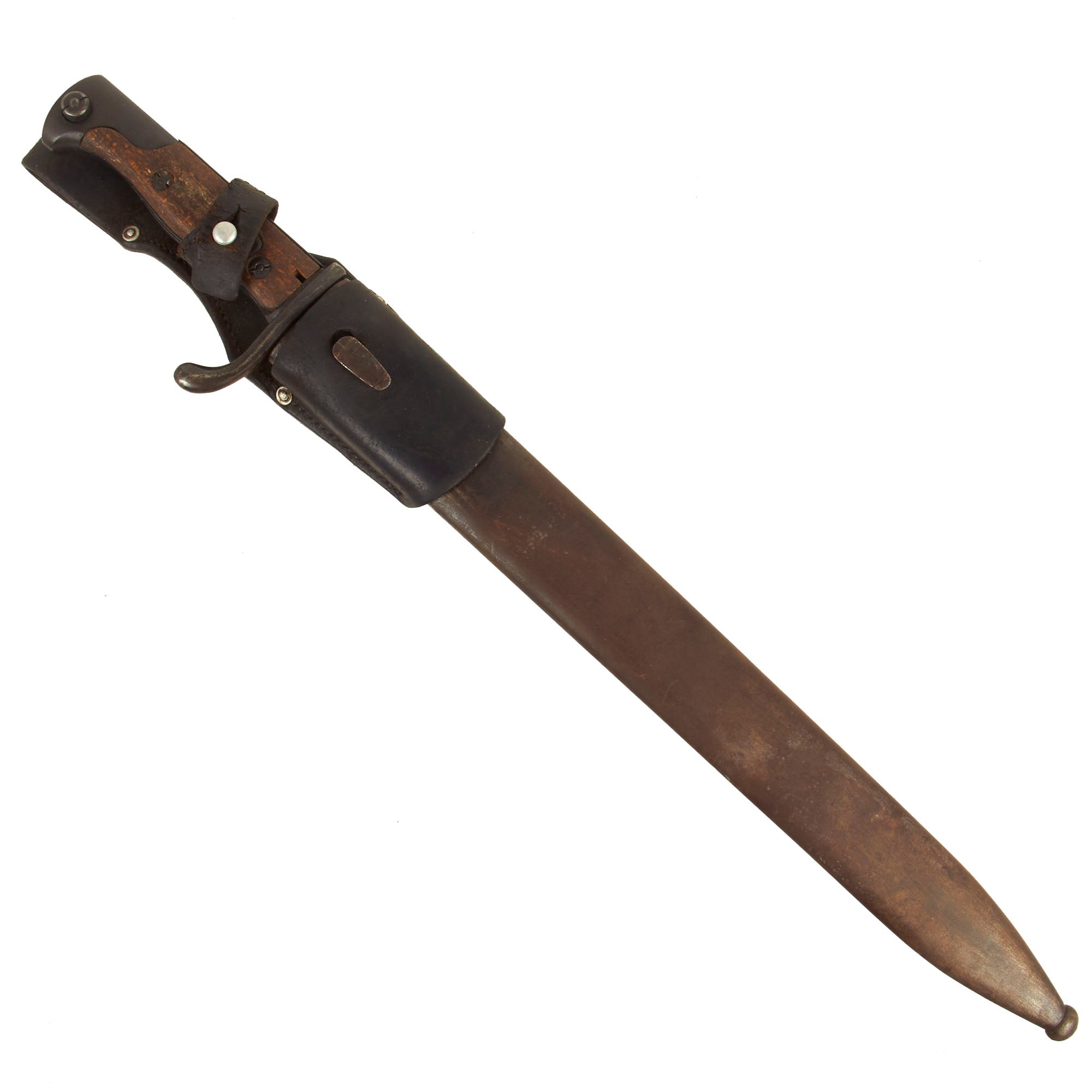 Original Item: Only One Available. This is a very good example of the M-1898/05 Bayonet (Seitengewehr), which was the most common German Bayonet of the First World War. It was intended for use on the standard issue service rifle of Imperial Germany: the Mauser-designed Gewehr 98 (GEW 98). It features a heavy 14.5-inch steel blade with distinct bulge toward the point, giving extra weight and power to the business end, known as a "butcher blade". This version is known as n/A (neuer Art = newer model). This second pattern lacks the first pattern's vestigial muzzle ring (or 'ears') and has a flashguard on the back of the grip.