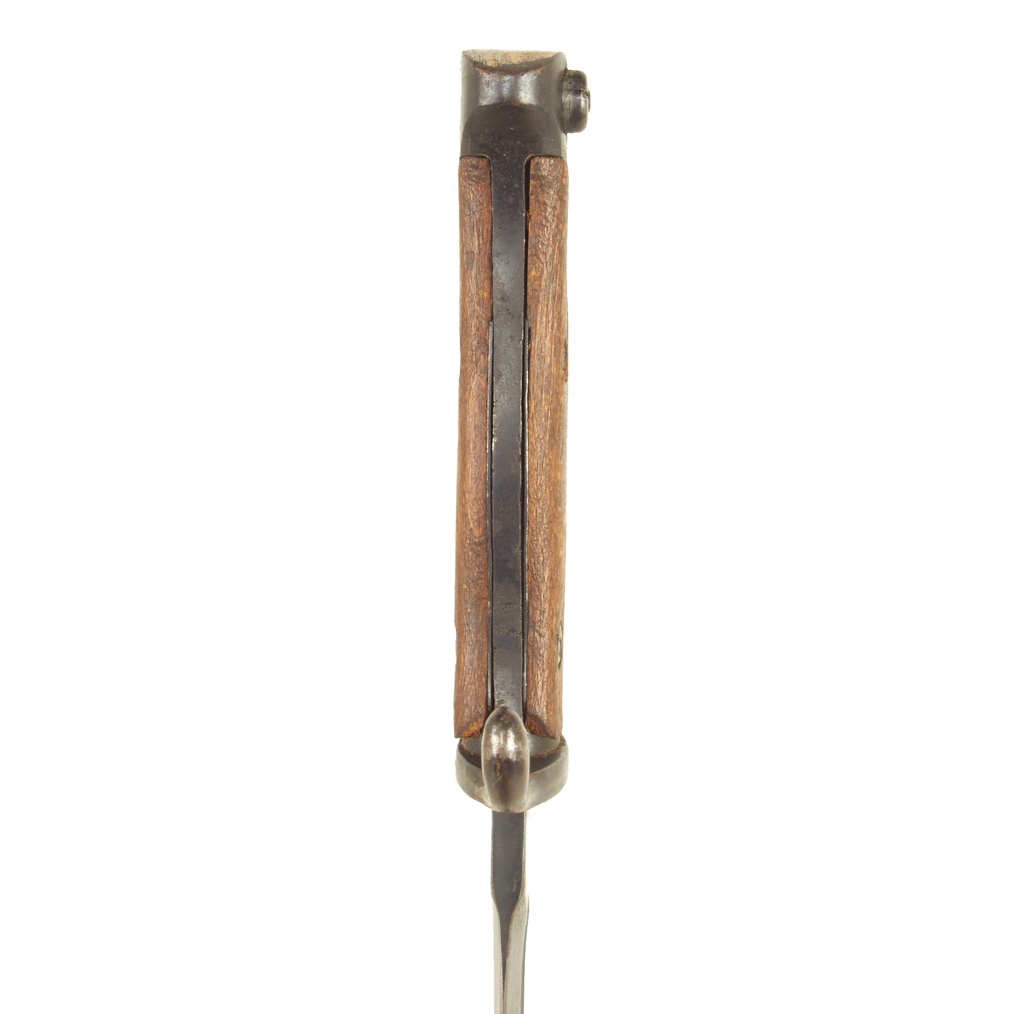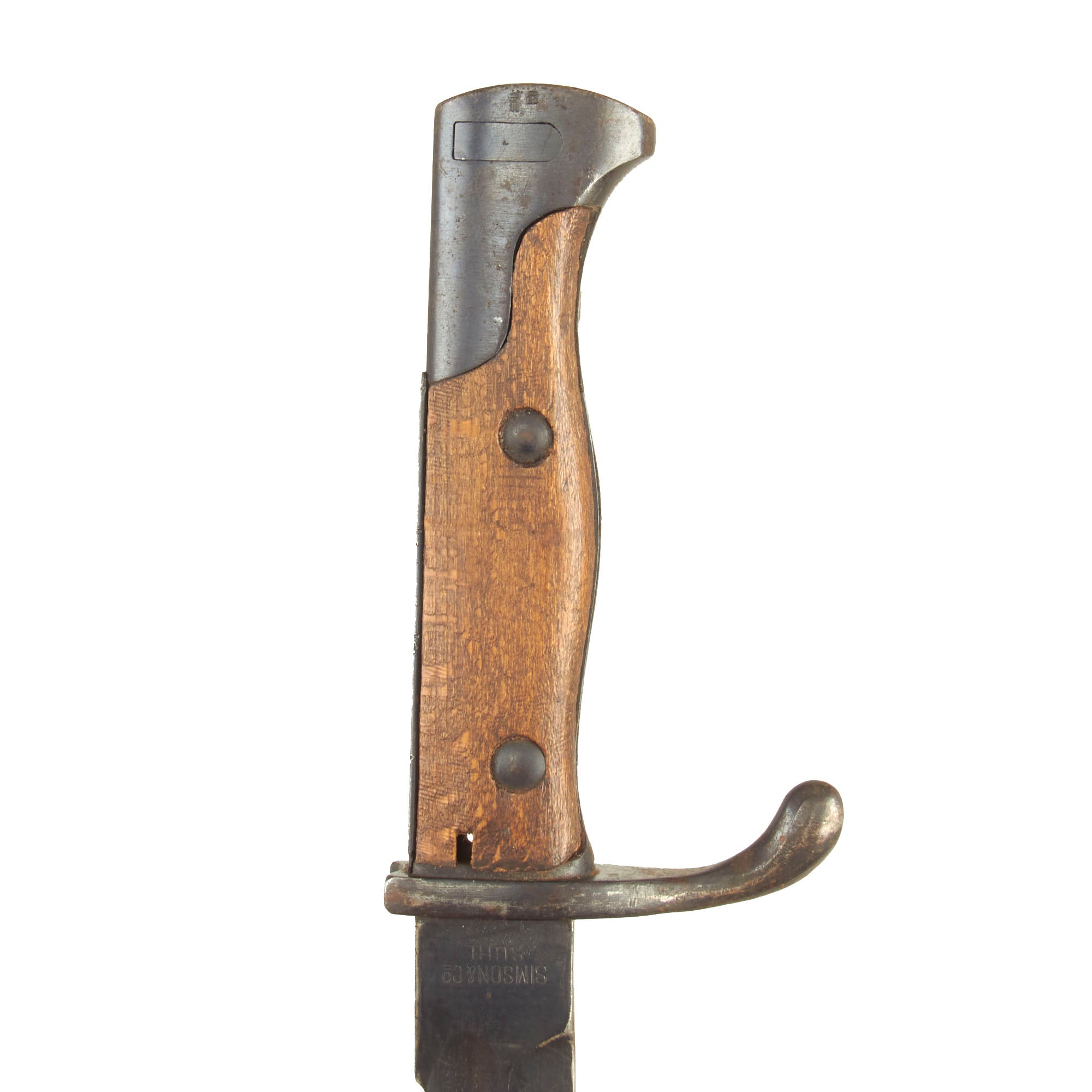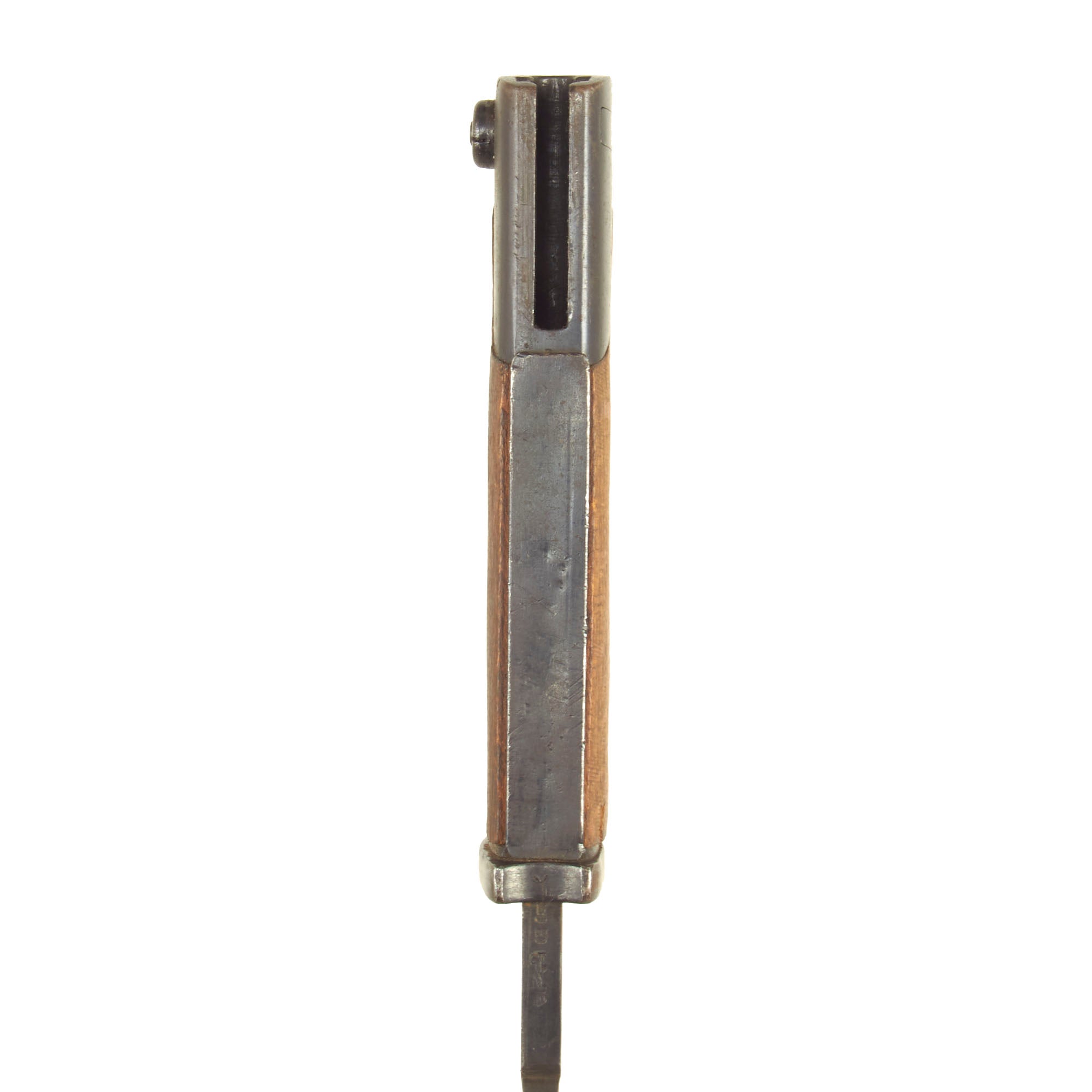 This example was originally produced with a "sawback" blade, which was intended for use by pioneers to saw through brush and obstacles. Unfortunately a rumor got out that it was intended to inflict grievous harm on enemies. It got to the point that many Germans believed that the British summarily executed all Germans found carrying sawback bayonets when captured, so a lot of the sawback bayonets had this feature removed. This would have been quite ironic, since the sawback bayonet was originally first a British development. While this example no longer has the "saw back", it can clearly be seen that it originally did have one, now ground away, thankfully leaving the markings on the spine intact.