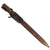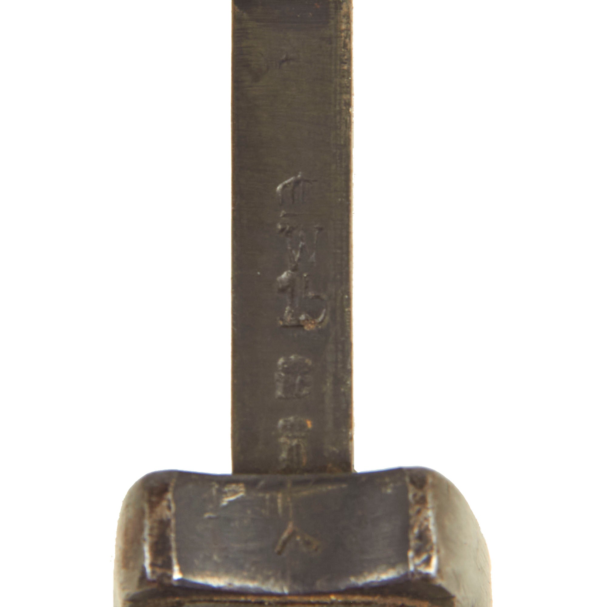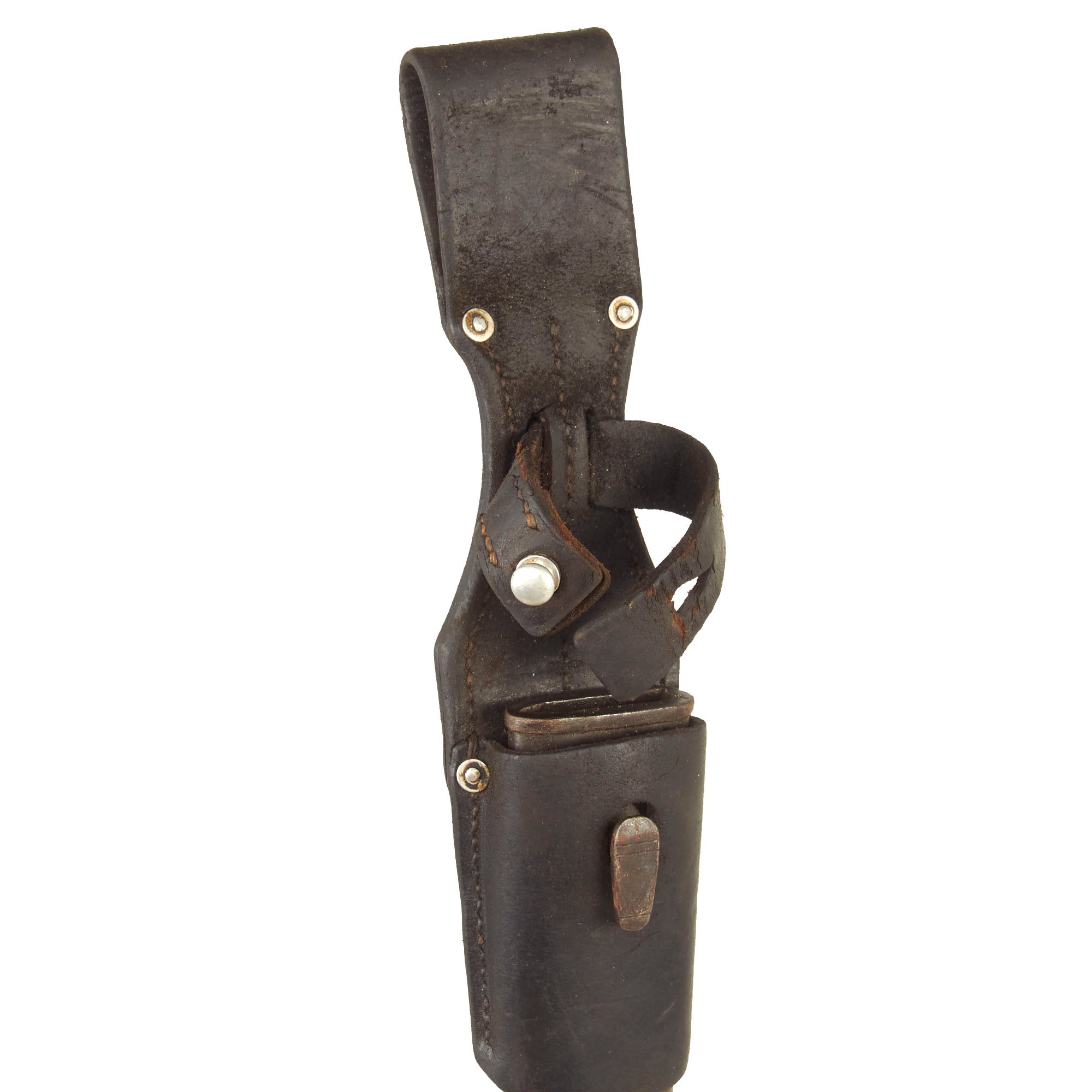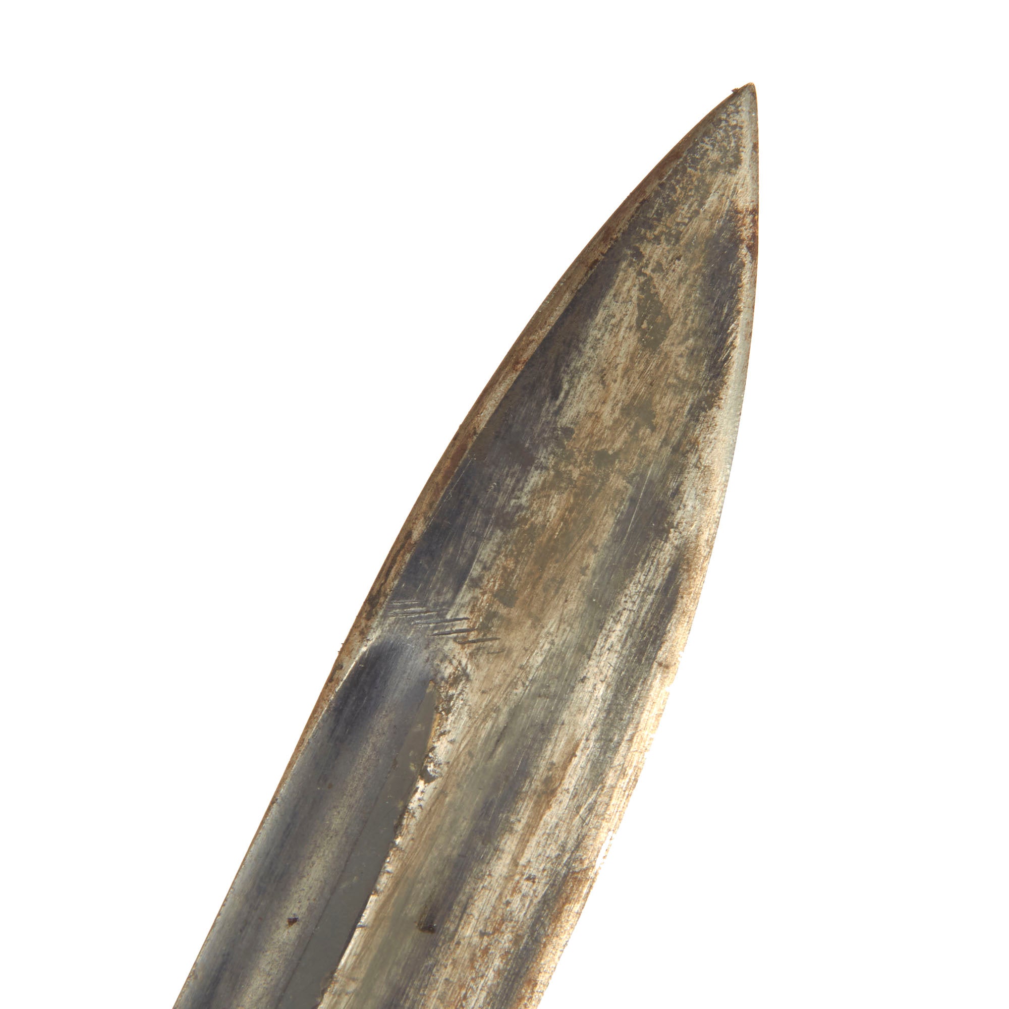 This example was originally produced with a "sawback" blade, which was intended for use by pioneers to saw through brush and obstacles. Unfortunately a rumor got out that it was intended to inflict grievous harm on enemies. It got to the point that many Germans believed that the British summarily executed all Germans found carrying sawback bayonets when captured, so a lot of the sawback bayonets had this feature removed. This would have been quite ironic, since the sawback bayonet was originally first a British development. While this example no longer has the "saw back", it can clearly be seen that it originally did have one, now ground away, thankfully leaving the markings on the spine intact.