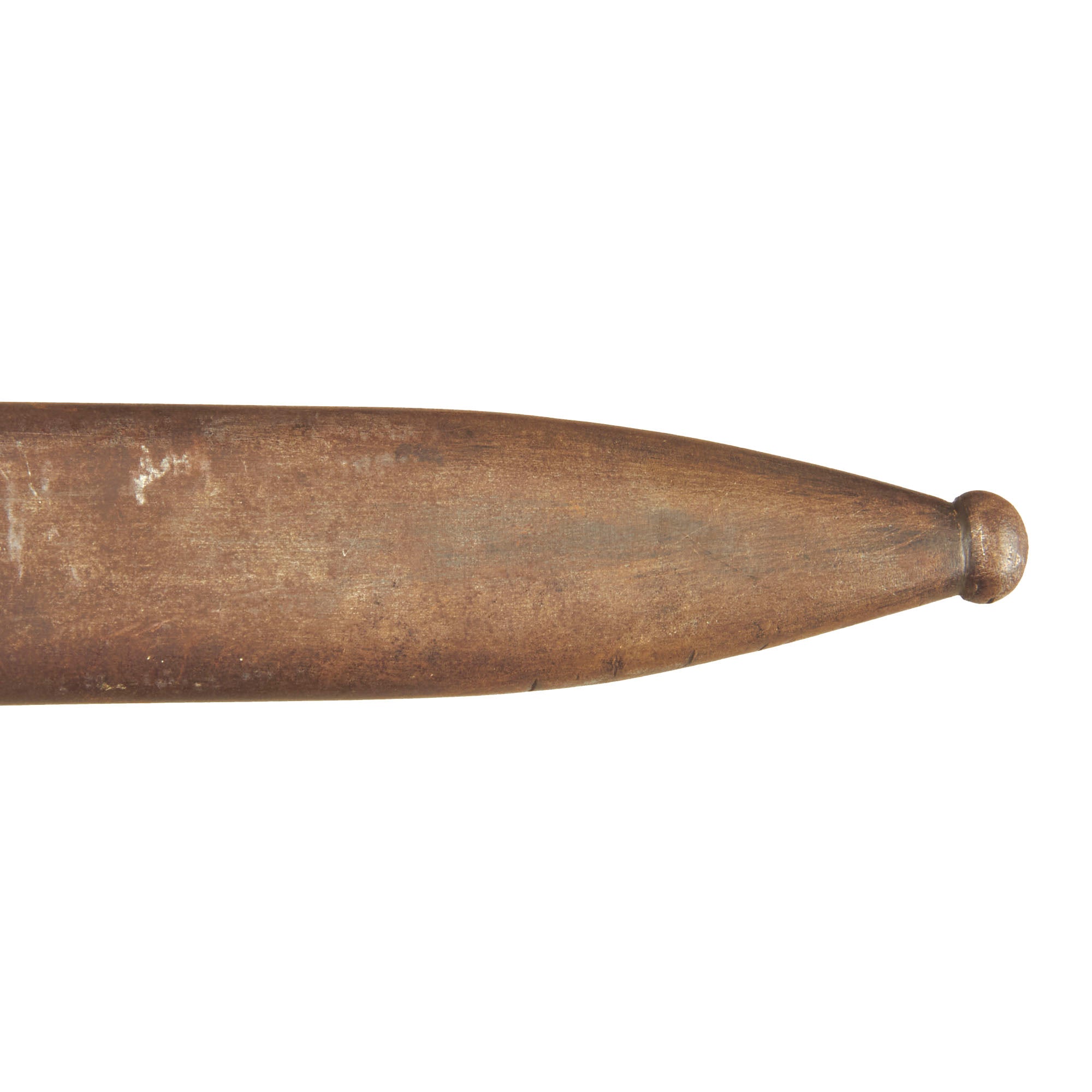The blade is in very good condition, except for the missing saw back. It has a nice arsenal refinish, which has worn through in some places, but still looks quite nice. The steel scabbard is in very good condition, not arsenal refinished, with a few dents that do not interfere with sheathing the blade.