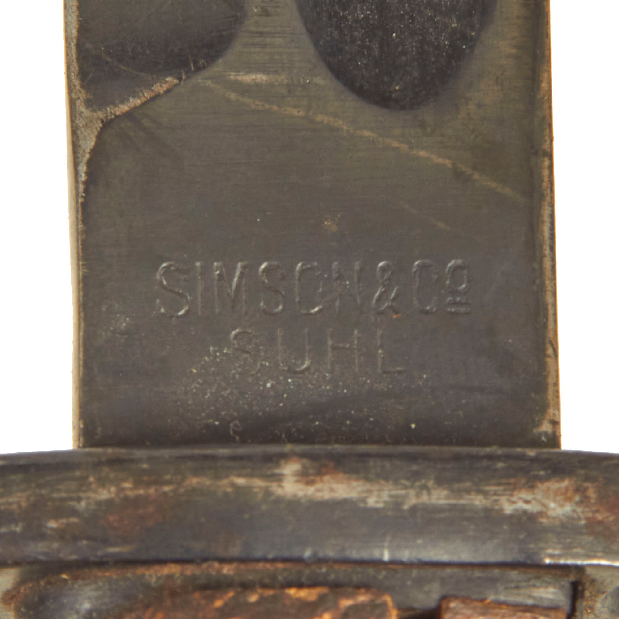 The blade ricasso is maker marked SIMSON & Co / SUHL, indicating manufacture by Gebrüder Simson (Simson Brothers) in Suhl, Thuringia, Germany. This company, later known as Simson & Cie, was a major manufacturer in the Suhl Area, and later began production of bicycles and other items in addition to edged weapons. At the onset of WWI, the company had 3500 employees, however in the post war depression, they had to fire 2/3 of their workforce. The company continued trading and was again successful, however since the Simson family were Jewish, they found the company headquarters occupied by the SA in 1933. The company was then forcibly renamed BSW, and pressed into service making small arms. Thankfully, the Simson family was able to emigrate to the U.S.A. in 1936. For more information please see J Anthony Carter's excellent work GERMAN KNIFE AND SWORD MAKERS.