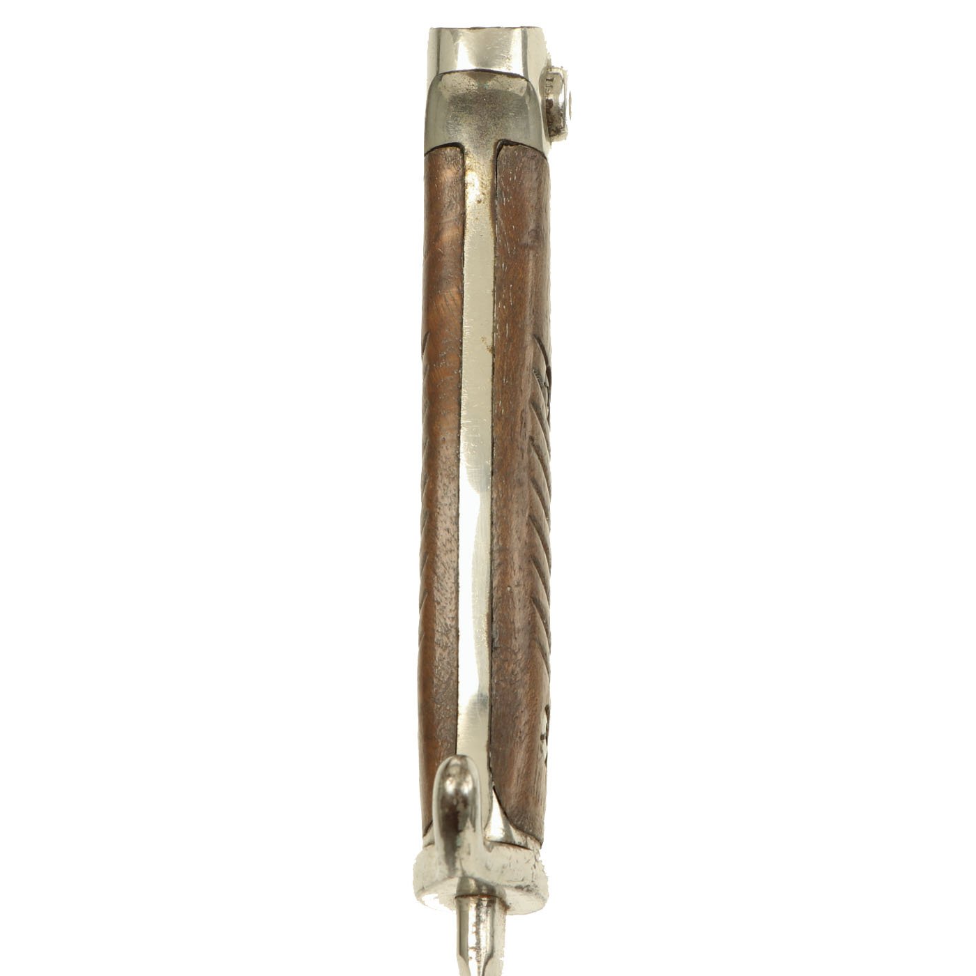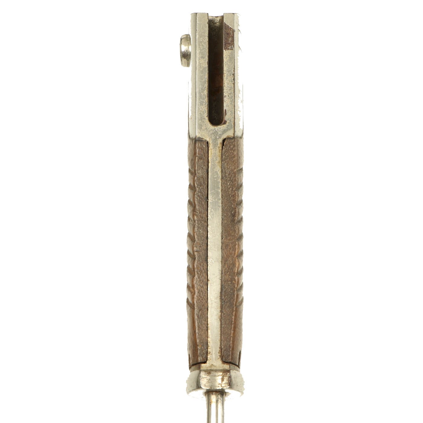 There is no maker marking on the blade, but this is typical for parade bayonets, as many retailers often purchased raw unmarked blades and would plate and fit the bayonets themselves. The grip plates are of wood, being the 2nd Style, and have grooves cut into them to afford a good grip and are retained by a rivet and spanner. Condition is very good, with no cracks or chips, just the usual wear from use and age. The blade is in great shape, with the nickel plate still retained well, with just a few areas of wear and flaking.