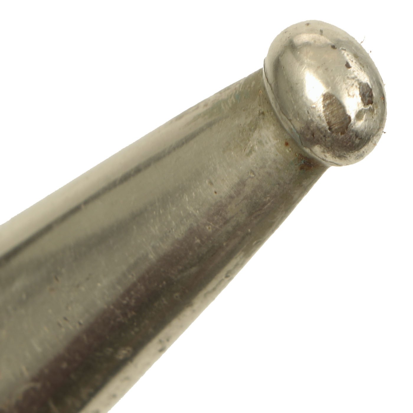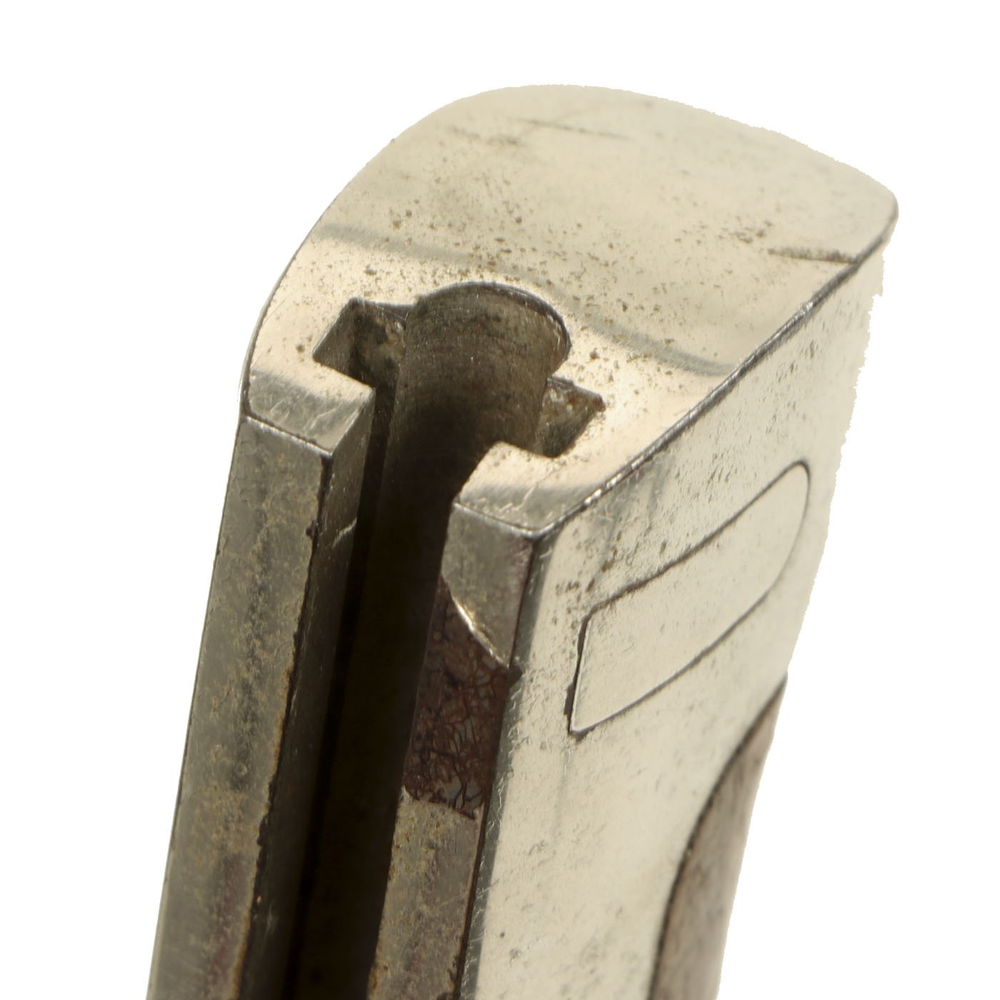 The scabbard is of fine leather that has been decorated with the usual pattern of twin lines. The stitching in the rear of the scabbard is still fully intact, though there is some space in the joint, so the stitching has stretched. The upper and lower scabbard mounts are nickel-plated and have scalloped edges. The lower mount is retained by staples on both sides, while the upper mount has but one. The leather on this example is in good condition, though the finish has started flaking off in areas as shown.