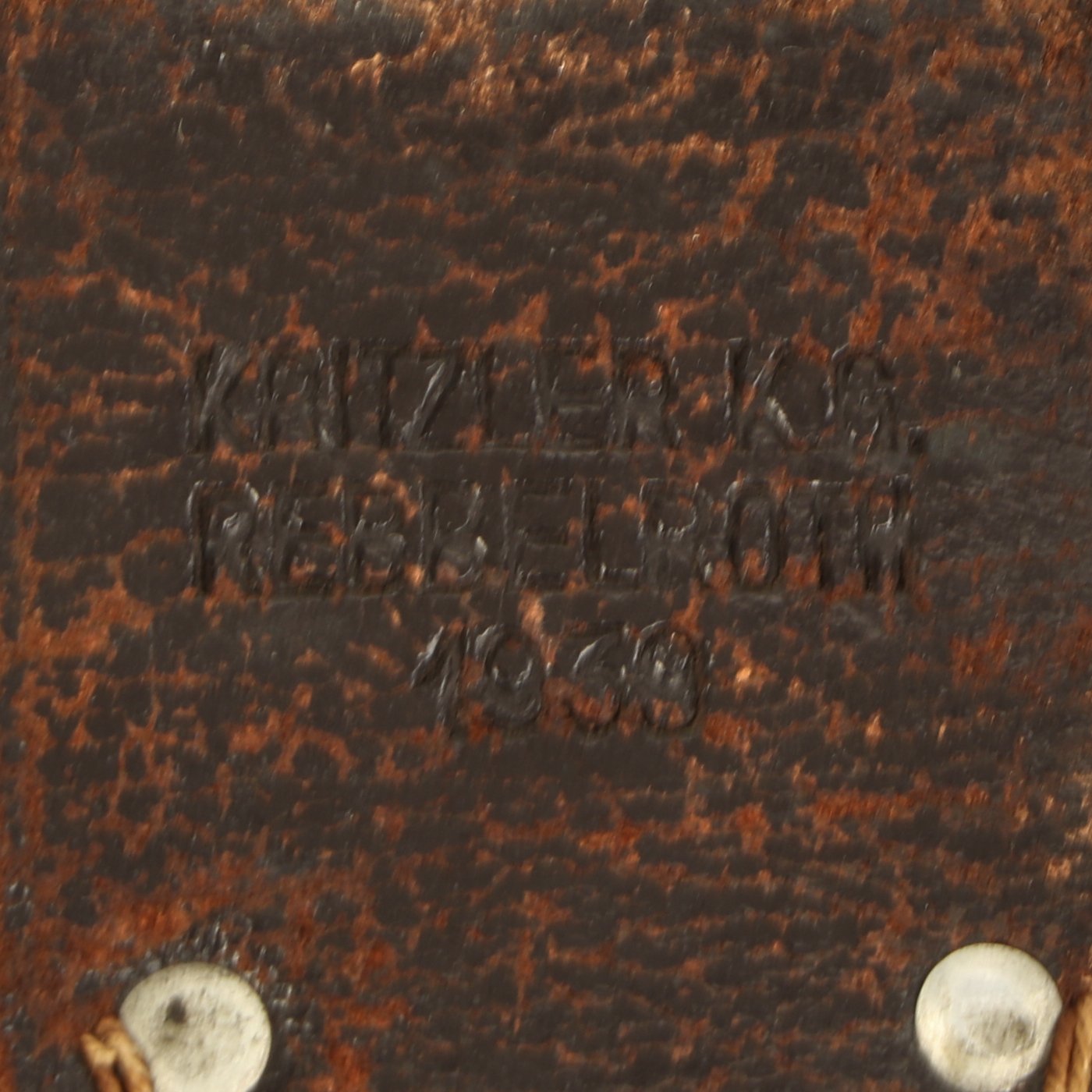 The scabbard is held in a brown leather frog with aluminum rivets, which is marked on the back KRITZLER K.G. / REBBELROTH / 1939. The frog is in good condition, though it is torn through at the top of the frog button slot. Most likely this bayonet was used during WWI and again in WWII, possibly passed down within a family.