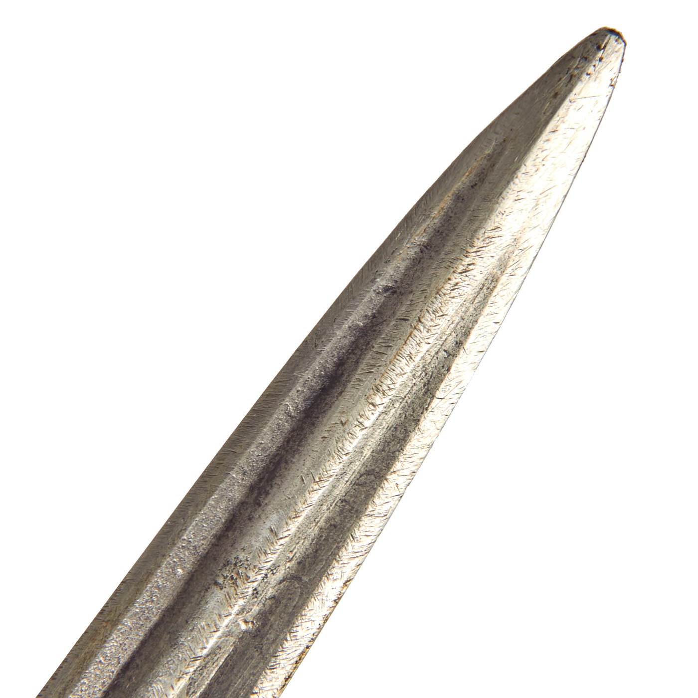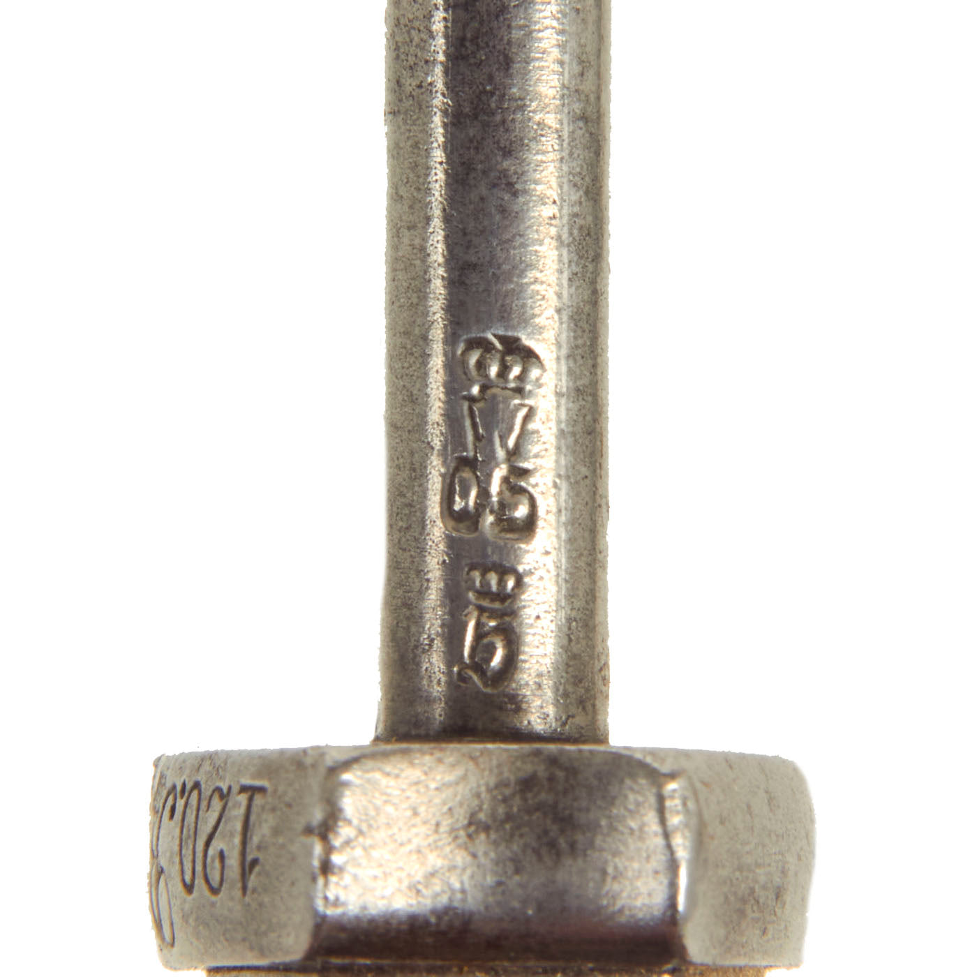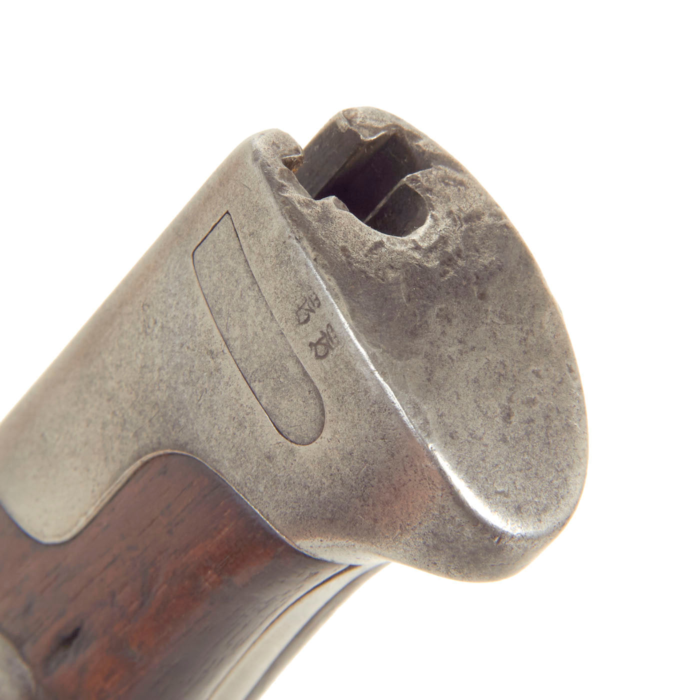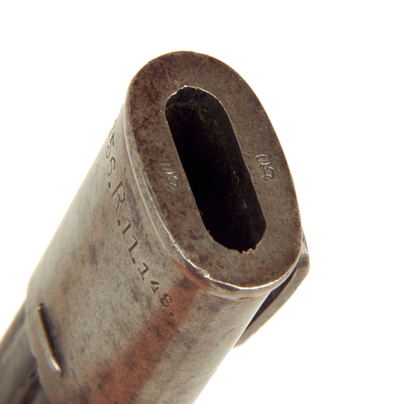 The bayonet shows some small areas of light corrosion on the blade, as well as signs of sharpening, however it is overall quite nice after years of service. The two piece grip is still in very good condition, with one small chip, and the carved ribs are still very clear. The hilt does have wear and some light corrosion, so this is definitely a bayonet that saw a lot of service. The bayonet comes complete with its original hard leather scabbard, which unfortunately is splitting along the seam on the back. Most were issued with metal fitted leather scabbards.