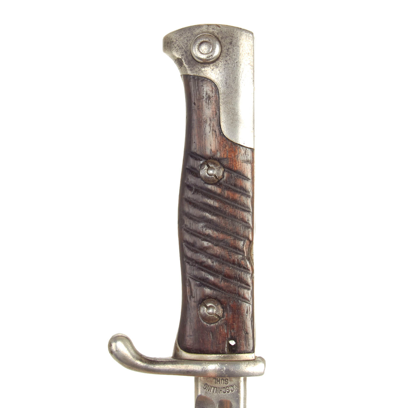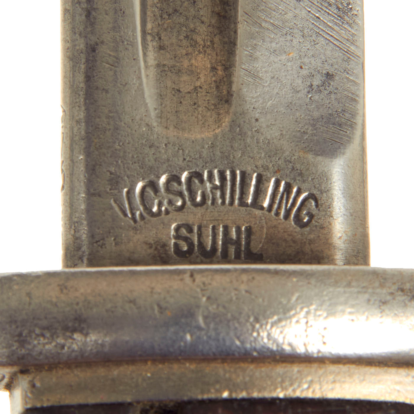 The blade ricasso is maker marked V.C. SCHILLING / SUHL, a well-known maker of bayonets during WWI and prior. The company also manufactured firearms, including the well-known Reichsrevolver of the late 19th century. It would continue manufacturing firearms and some years afterwards.