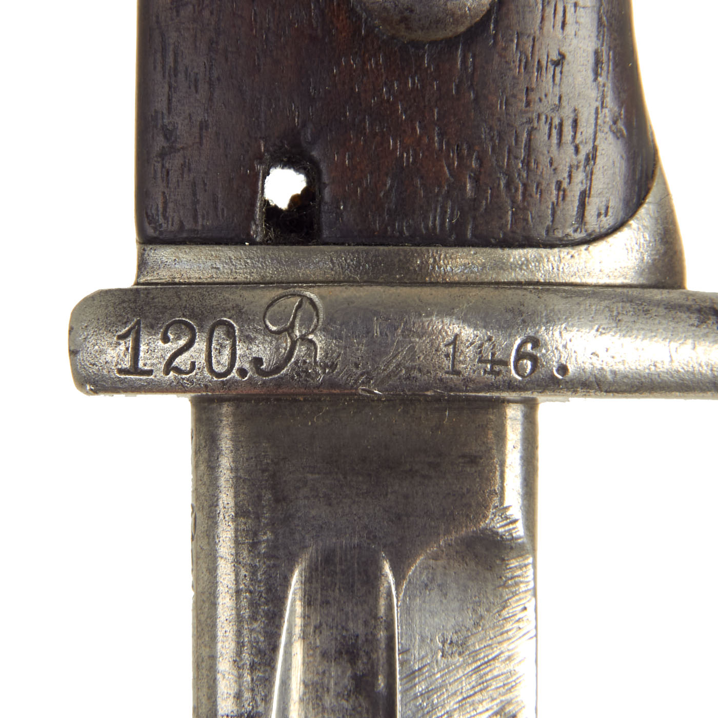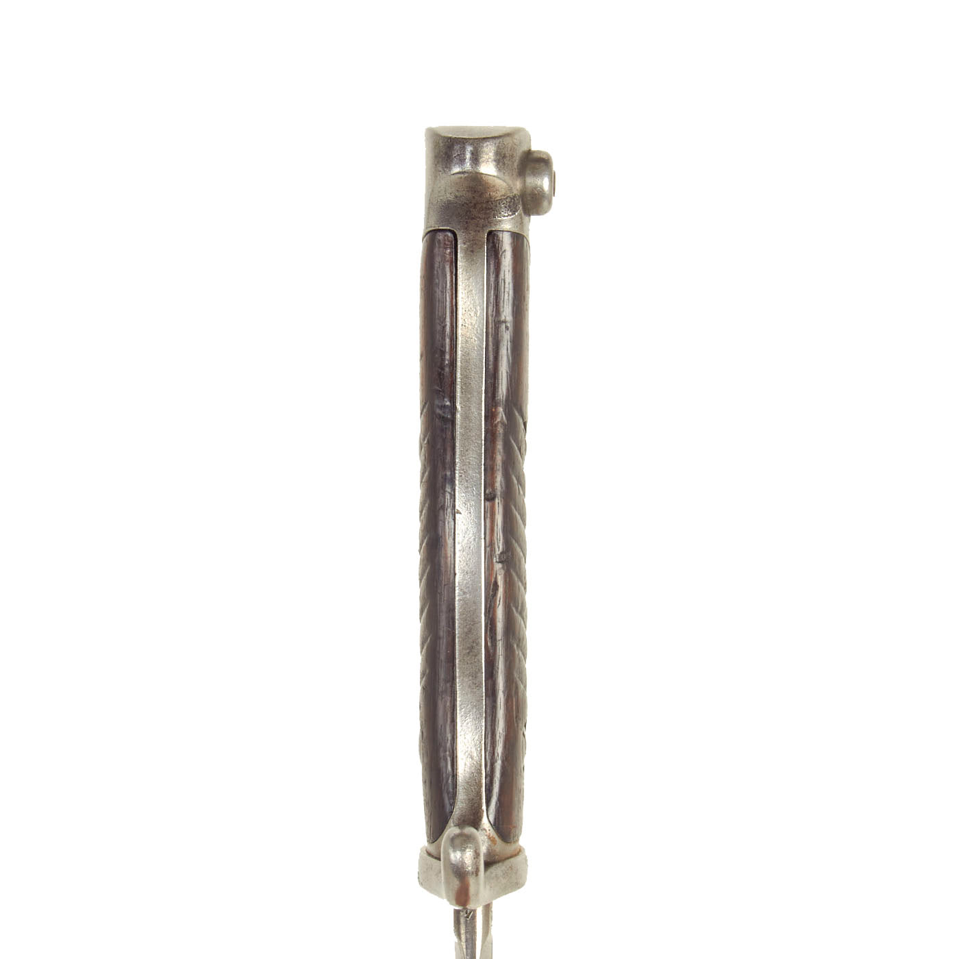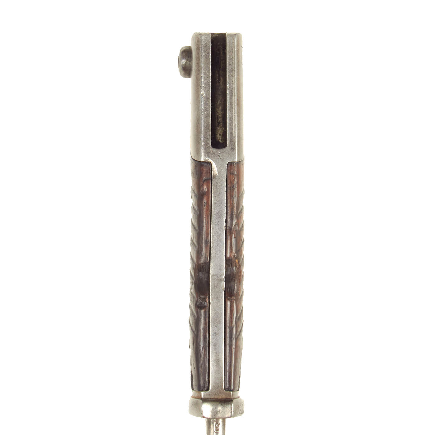 This bayonet is an example of the second model of this bayonet, the n.A. (neu Art) model introduced in 1902, and the grip is made of two halves from wood. After the turn of the century the Germans simplified and strengthened their bayonet grips. The original "alter Art" (old type) bayonet had a grip made of one single piece of wood, which was wrapped around the tang.