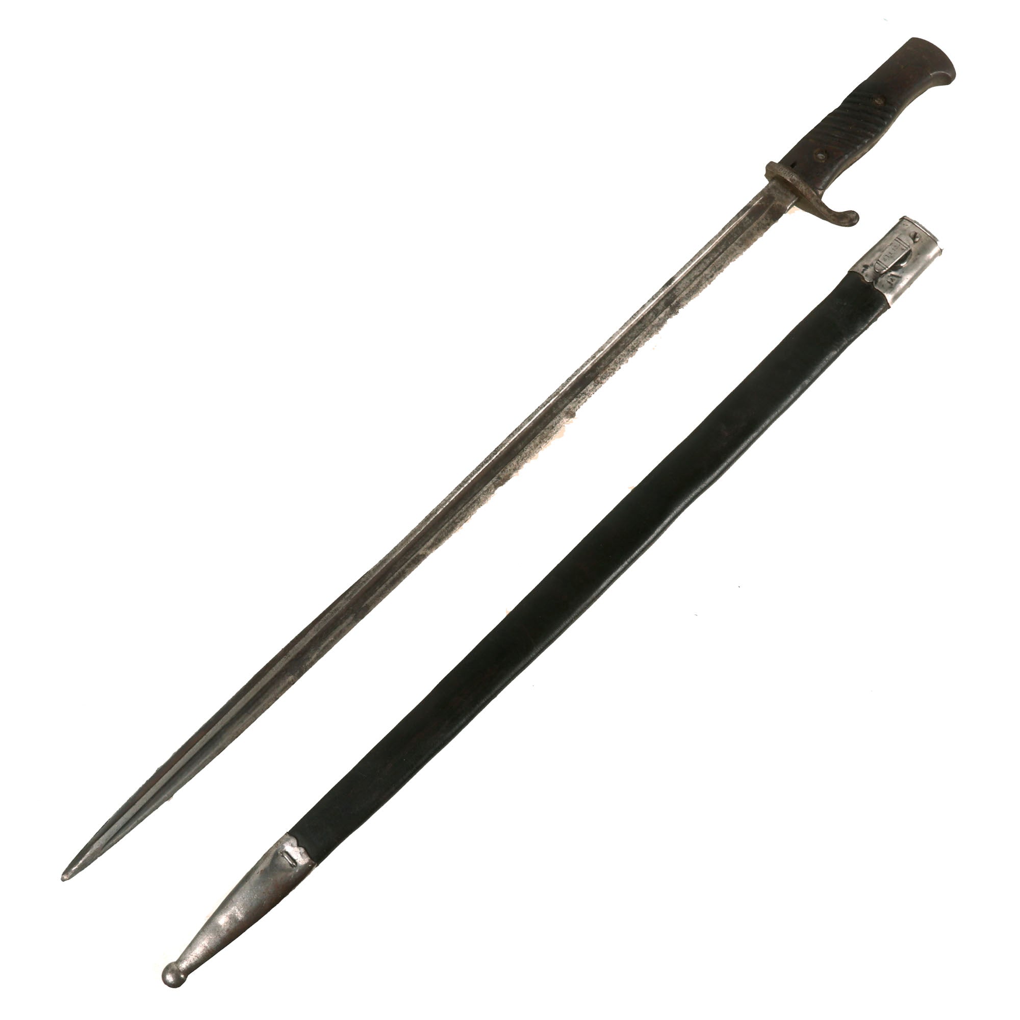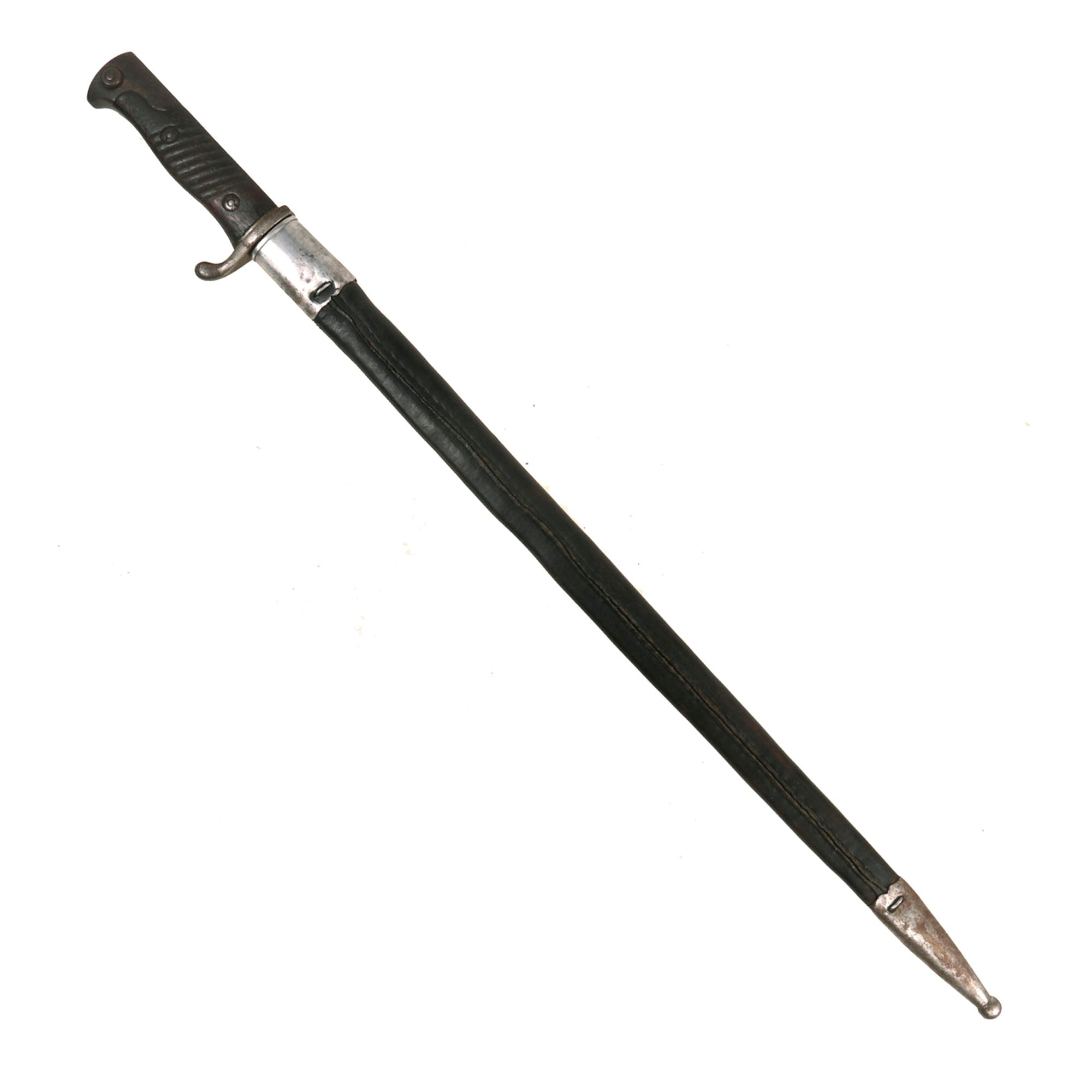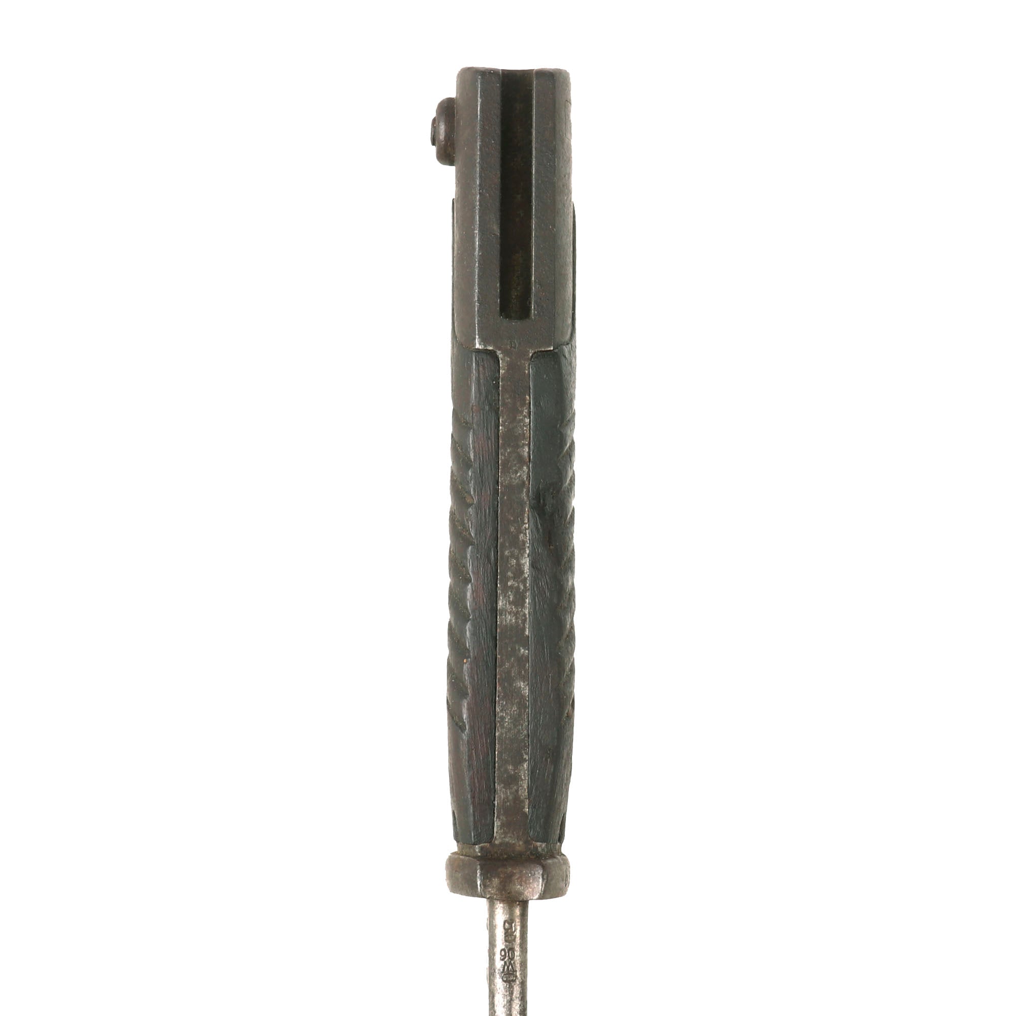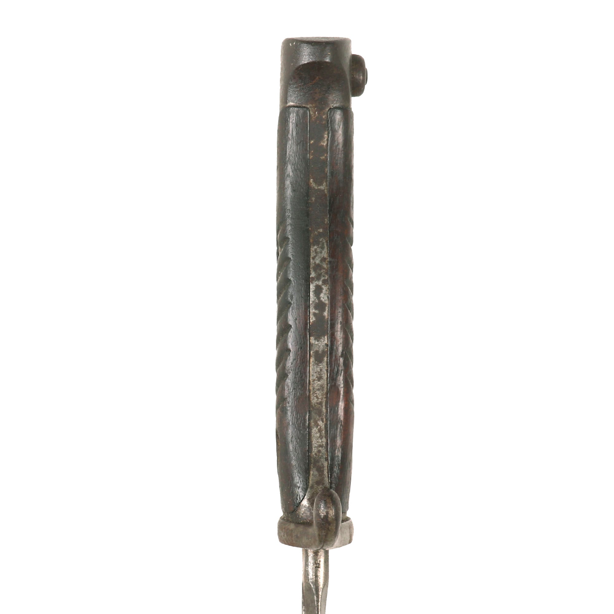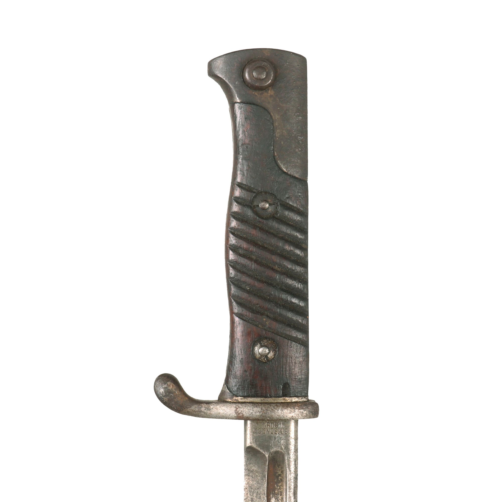 This bayonet is an example of the second model of this bayonet, the n.A. (neu Art) model introduced in 1902, and the grip is made of two halves from wood. After the turn of the century the Germans simplified and strengthened their bayonet grips. The original "alter Art" (old type) bayonet had a grip made of one single piece of wood, which was wrapped around the tang. For more information please see Watts & White, The Bayonet Book, page 120, Item 257.