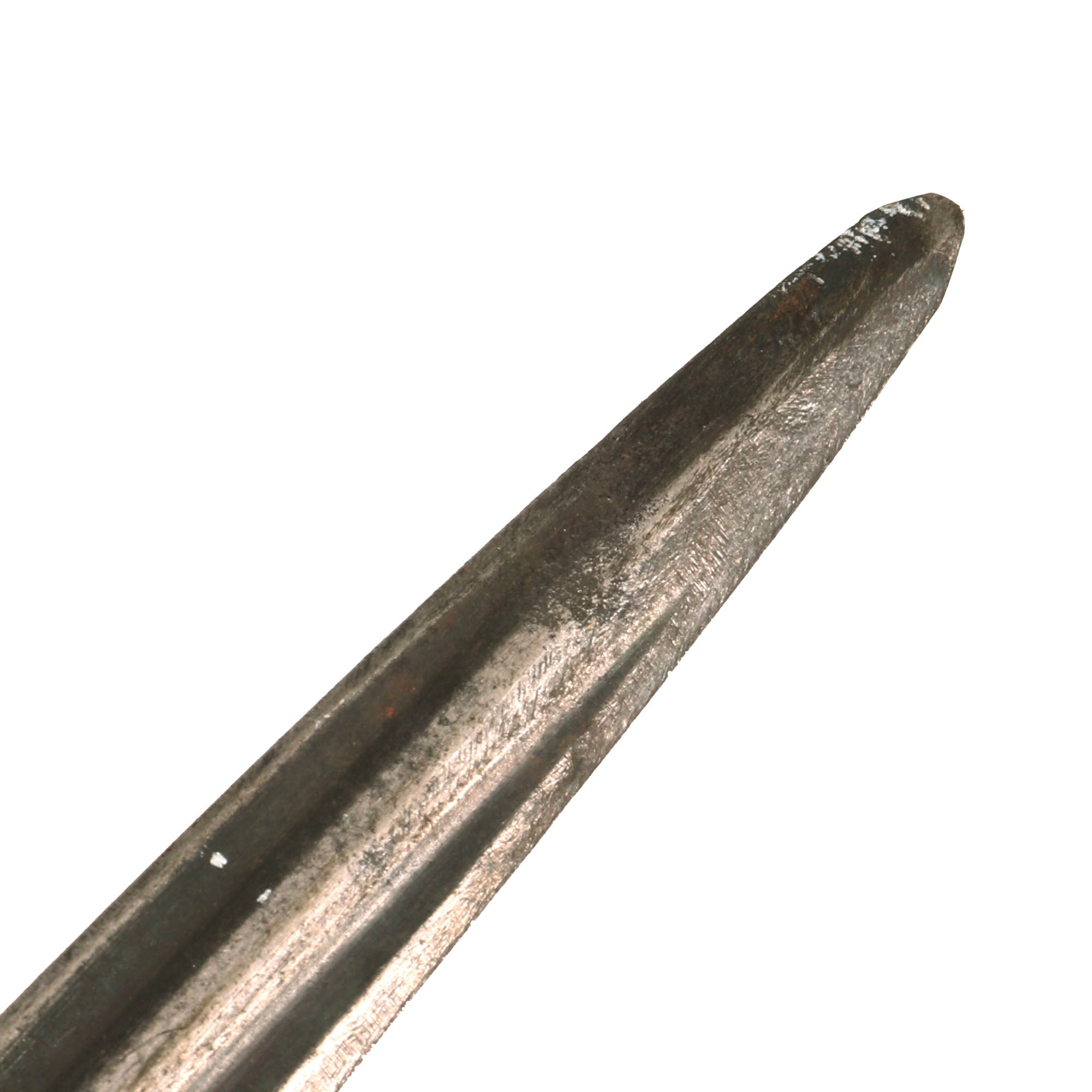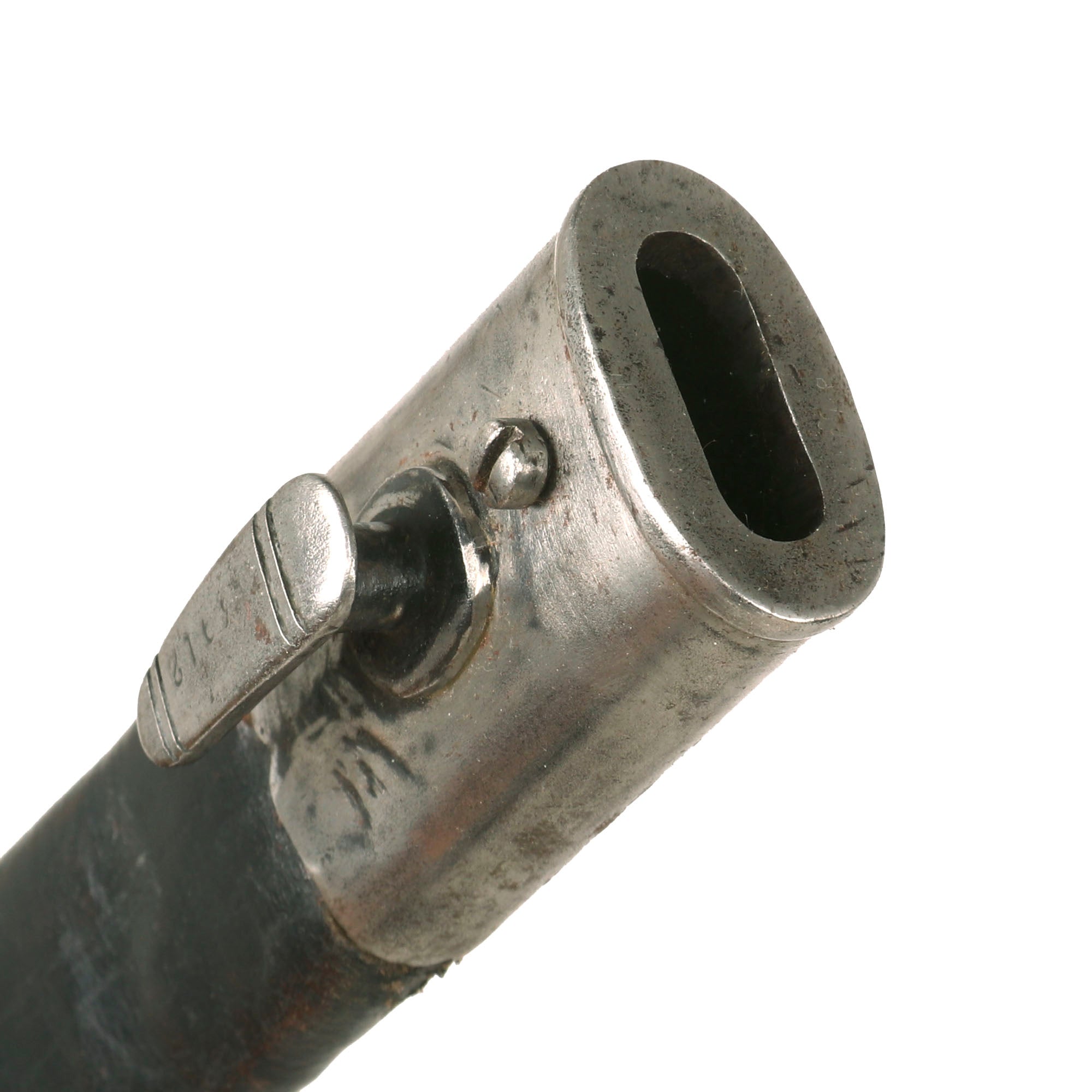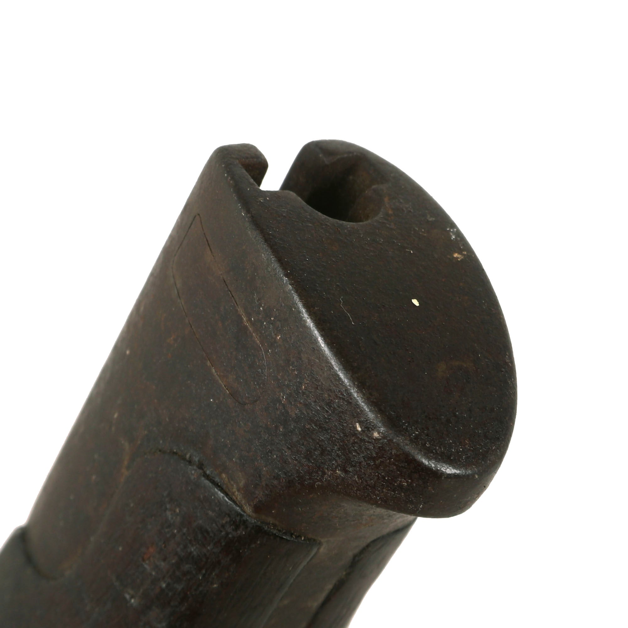 The bayonet shows minor staining on the blade, as well as signs of sharpening, however it is overall quite nice after years of service. The grip scales are in very good condition, with no cracks, and the carved ribs still very clear and have a lovely color. There are a few scratches and small dents. The bayonet comes complete with its original Steel Mounted leather scabbard, many of which were lost and replaced with "ersatz" emergency issue scabbards.