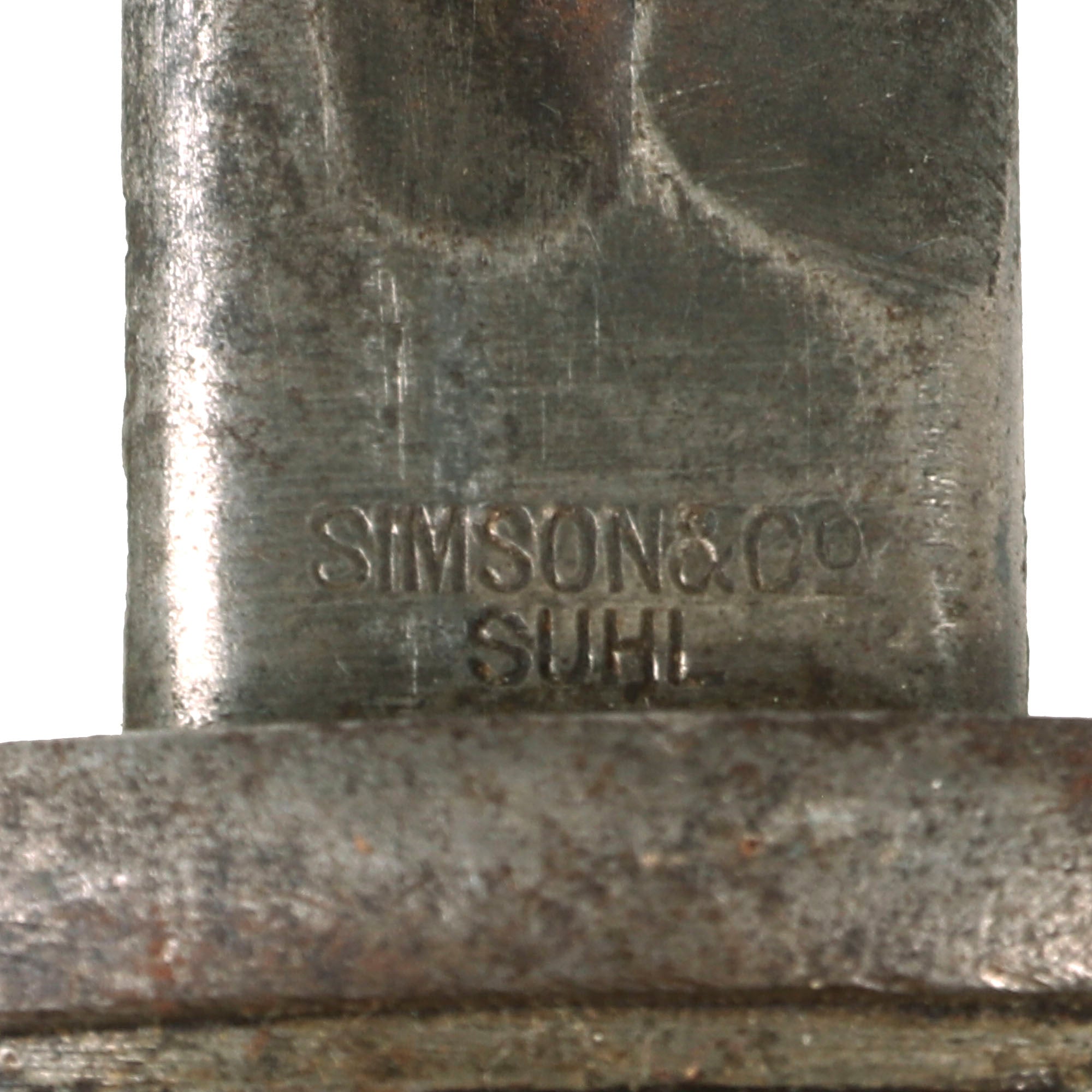 The blade ricasso is maker marked SIMSON & Co. / SUHL, a well-known maker of bayonets during WWI and prior. The company was owned by the Jewish Simson family, so unfortunately in the years leading to WWII, it was "Aryanized", eventually becoming Gustloff-Werke – Waffenwerk Suhl. The spine of the bayonet is dated 1906 with a Wilhelm mark and inspection mark underneath.