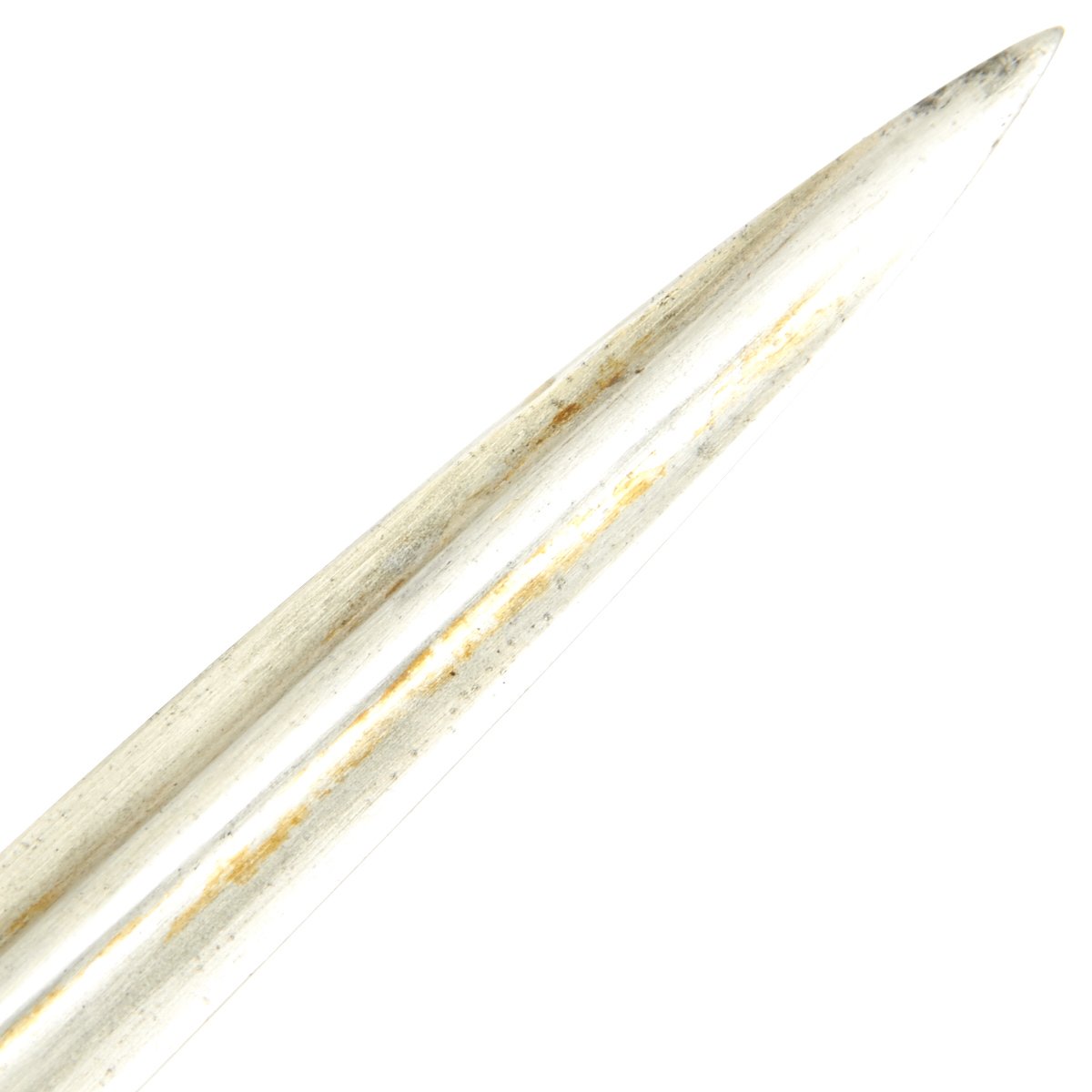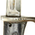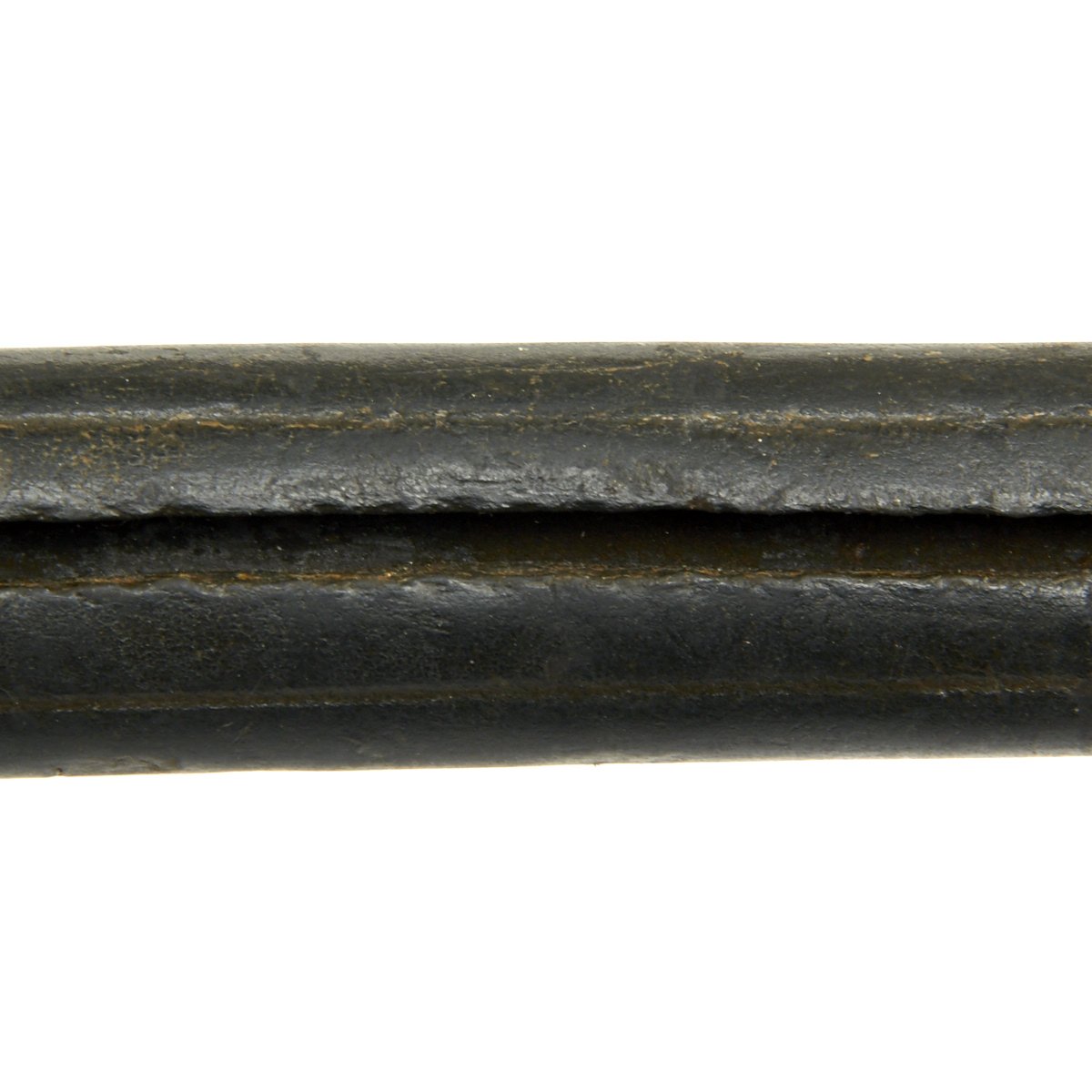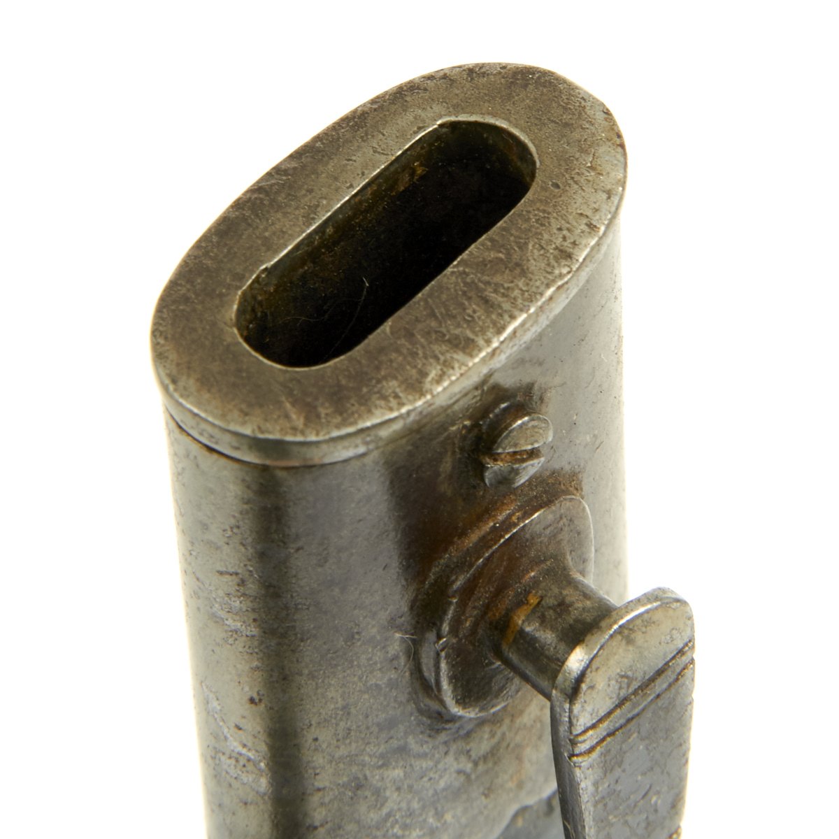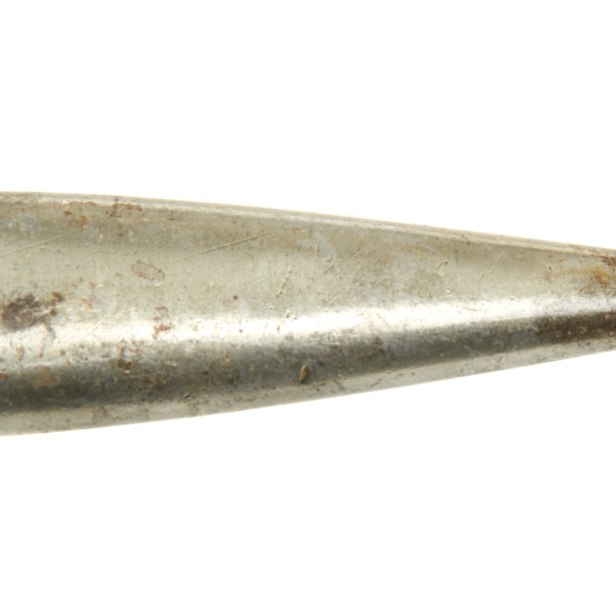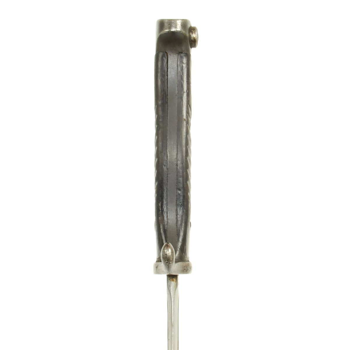 The bayonet shows some spots of corrosion and pitting on the blade, however the rest of the blade is very nice, with no sign of sharpening. As old as it is, the bayonet still has the factory unsharpened edge. There is however runner and throat wear, so while not used as a weapon, it definitely saw long servie. The grip scales are in good condition, with no cracks or major chips, and the carved ribs still clear. The grip does have wear and some light corrosion. The bayonet comes complete with its original Steel Mounted leather scabbard, though due to age the stitching has rotted out and the leather is very stiff.