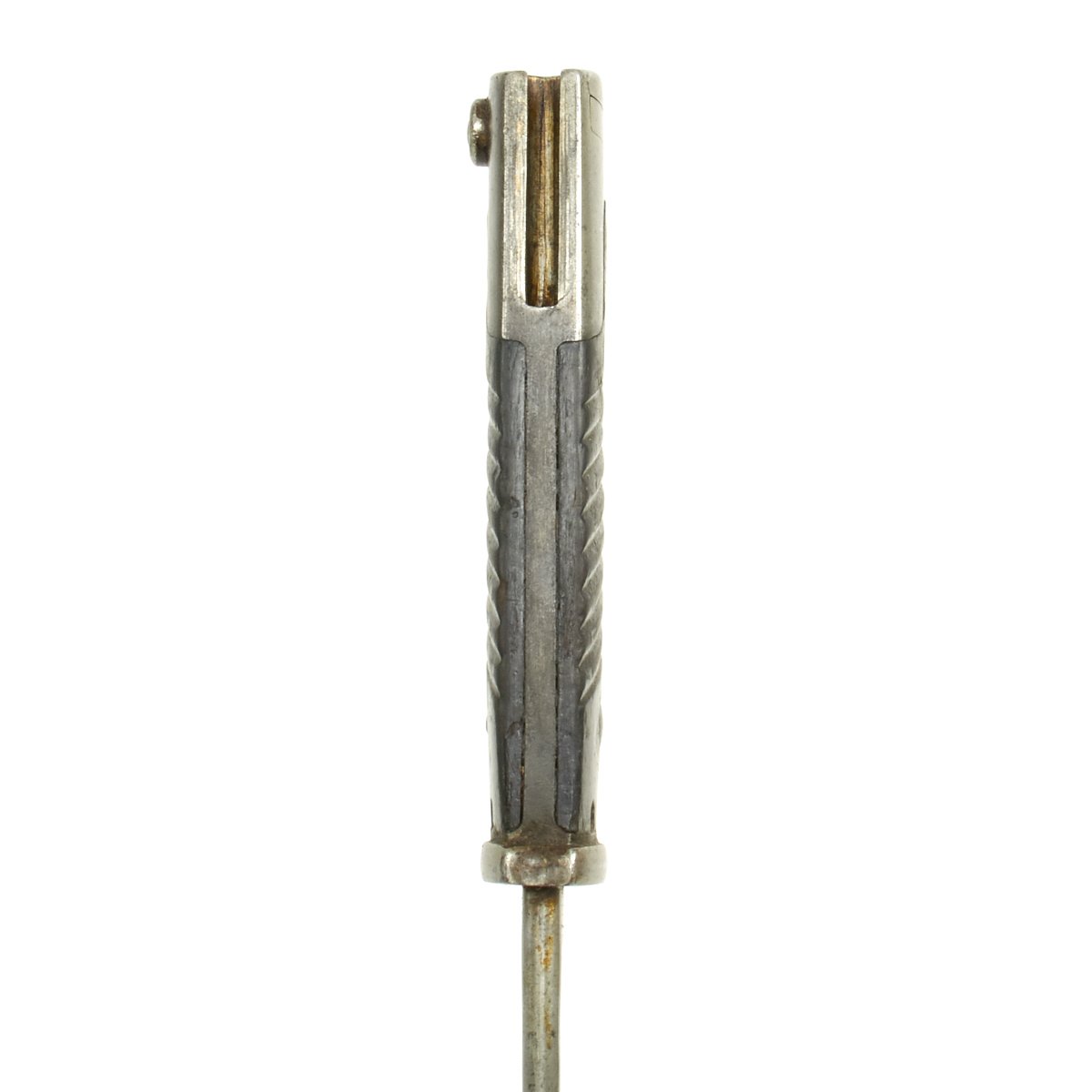 However, unlike a German-Issued bayonet, there are no proof marks on the spine of the blade, or regimental markings. Instead, there is a Peruvian Coat of arms on the pommel of the grip, and serial number 31631 on the cross guard. Many assume these are German issue, but the Coat of Arms is definitive.