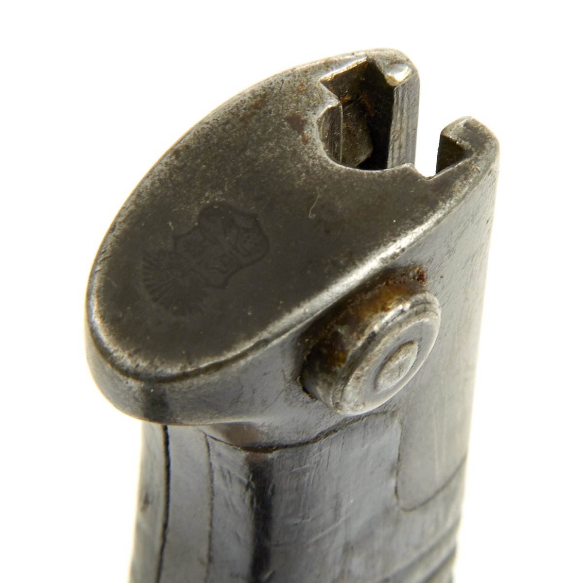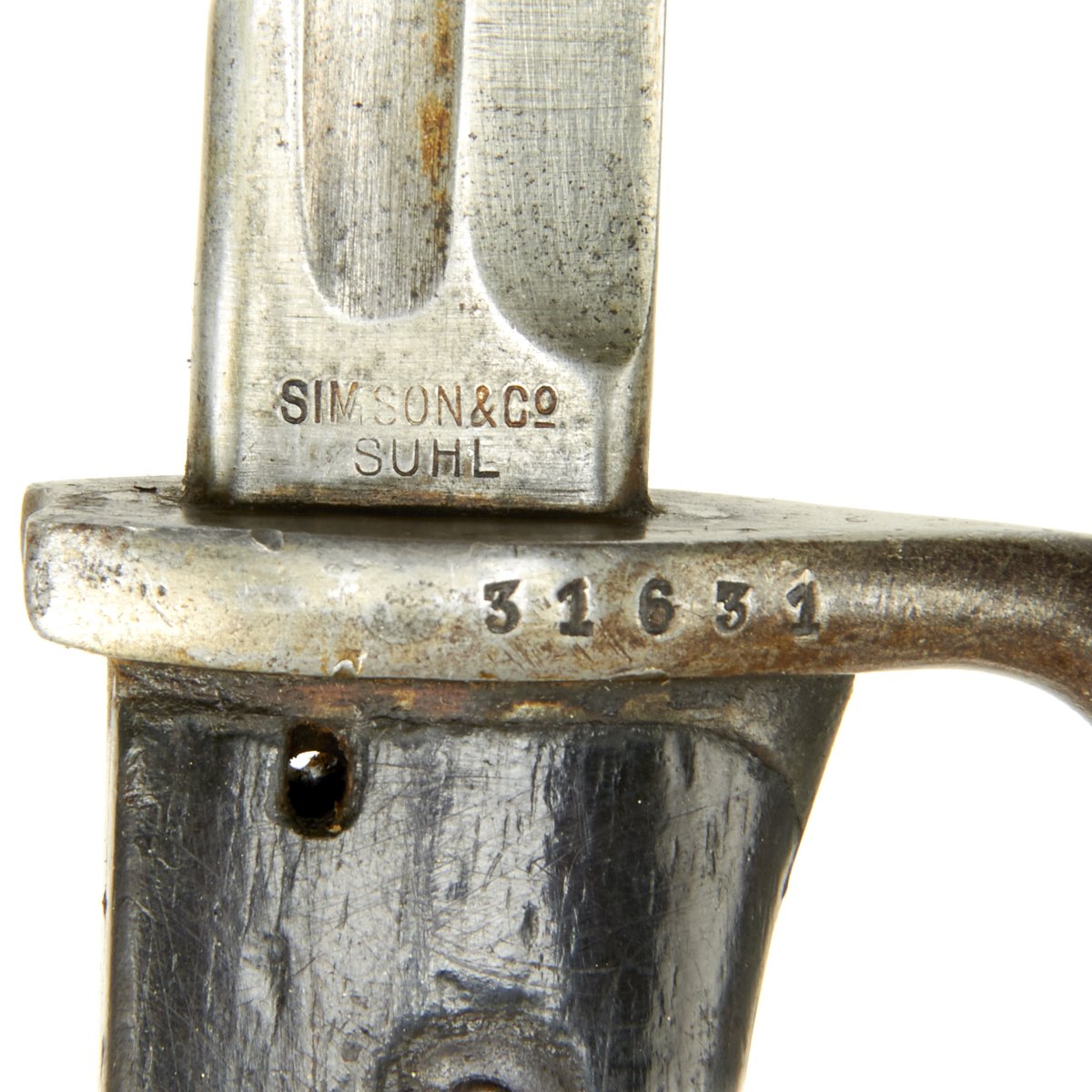 The bayonet has the typical long "pipe backed" 20 1/2" blade, also called a "quill back". The blade ricasso is maker marked SIMSON & CO / SUHL, a well known manufacturer of German bayonets. This bayonet is an example of the second model of this bayonet, the n.A. (neu Art) model introduced in 1902, and the grip is made of two halves from wood. After the turn of the century the Germans simplified and strengthened their bayonet grips. The original "alter Art" (old type) bayonet had a grip made of one single piece of wood, which was wrapped around the tang.