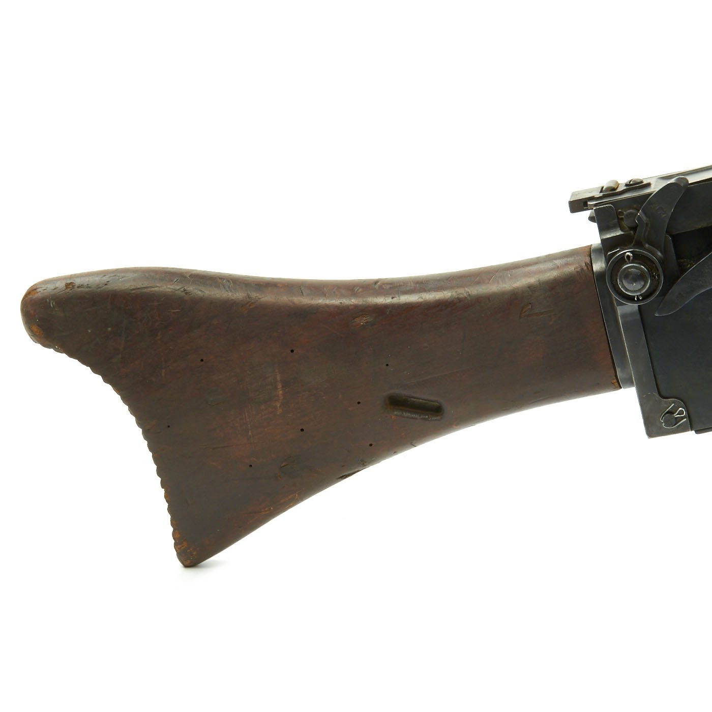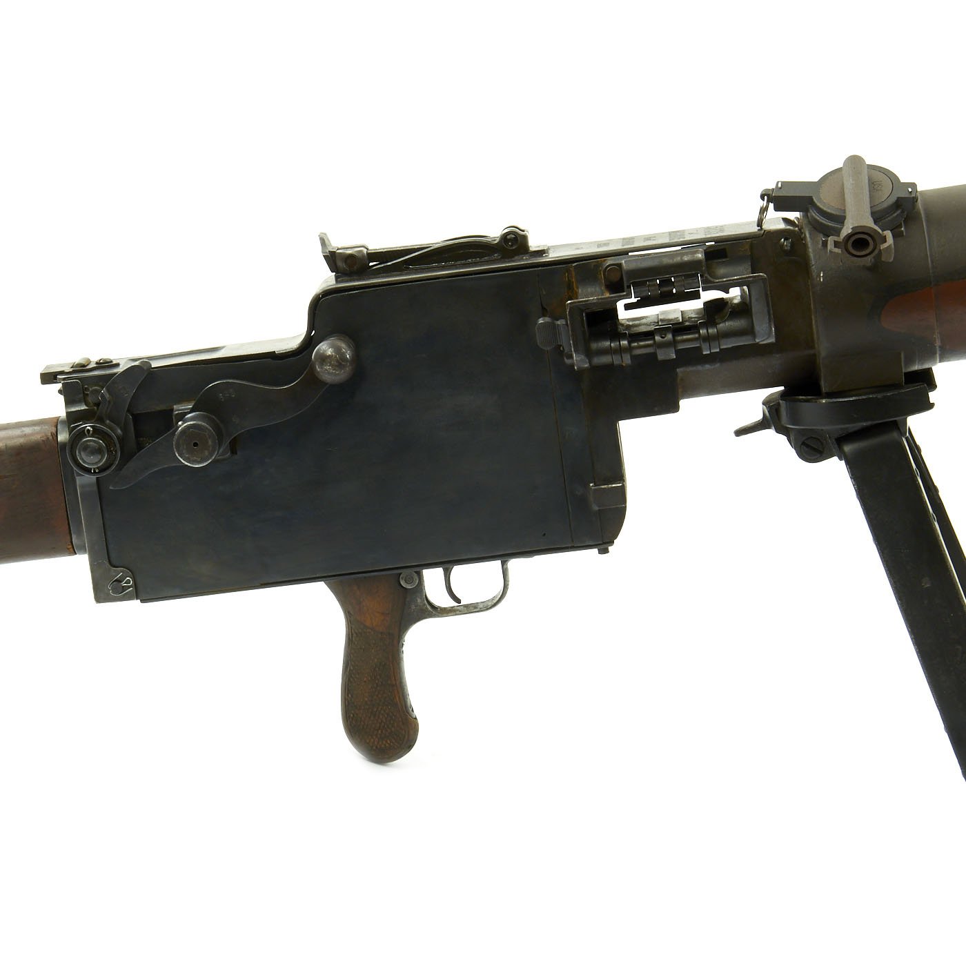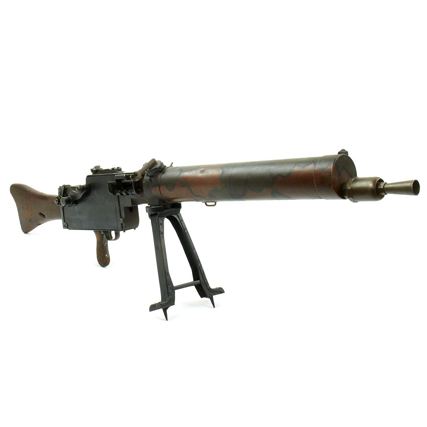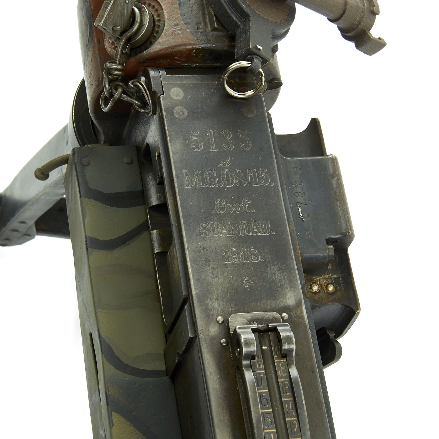 Original Item: Only One Available. This is a fine example of the legendary German Maxim Maschinengewehr (Machine Gun) 08/15, known as the MG 08/15, complete with a very rare original bipod. This gun became, by far, the most common German machine gun deployed in World War I (Dolf Goldsmith, 1989) since it reached a full allocation of six guns per company or 72 guns per regiment in 1918. By that time, there were four times as many MG 08/15 light machine guns than heavy MG 08 machine guns in each infantry regiment. This fine example is covered with markings and proofs, and is nicely marked on the top cover: