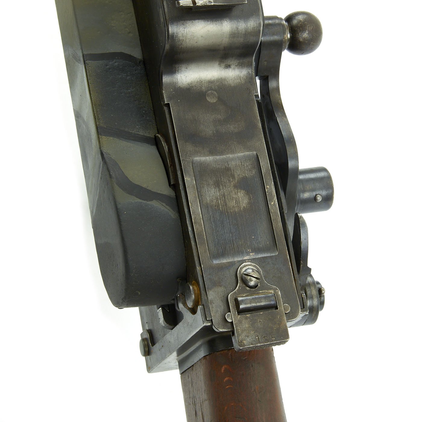 The top cover is marked with serial number 5135/d, and the top latch is matching, but the rest of the parts have different serial numbers. There are lot of markings and proofs on this example, typical of WWI German production. There is even a maker mark on the bottom of the bipod, which looks like interlocking letter "S"s. The fusee spring cover and water jacket have very nice camouflage paint jobs, though these were done post war. The camouflage is very well executed and certainly add to the display appeal.