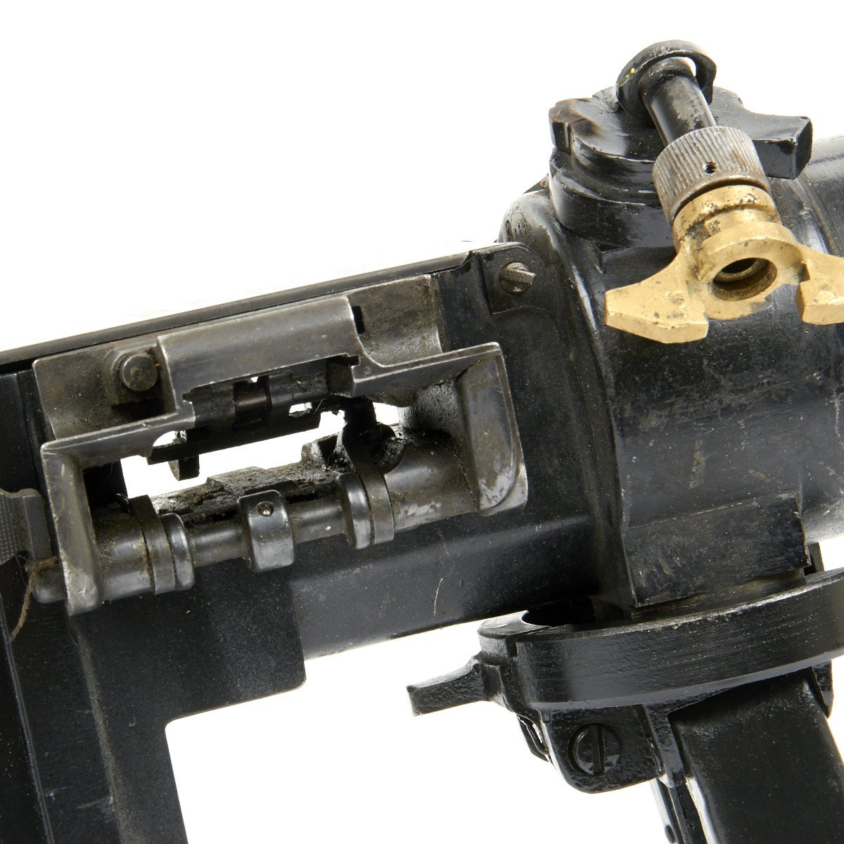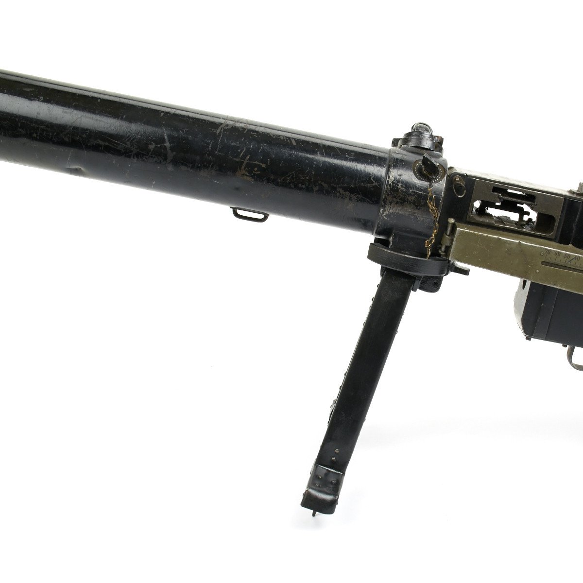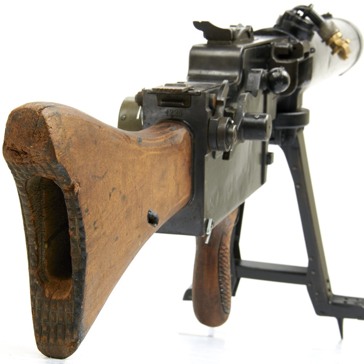 This is a complete and fully BATF approved inert non-firing display gun for the advanced collector. This fine example was built from all original parts and is offered in fine condition with multiple German markings and serial numbers. Only the bipod is reproduction. Please note that there are slight combat dents to the water jacket and fusee spring cover but overall a really nice Display piece from almost 100 years ago.