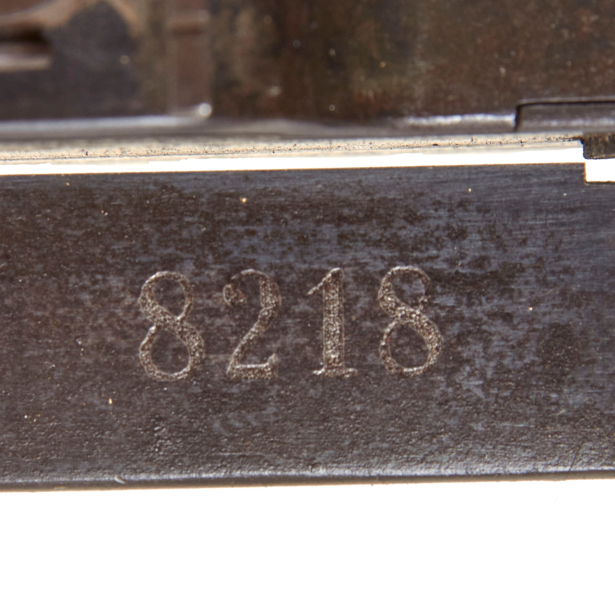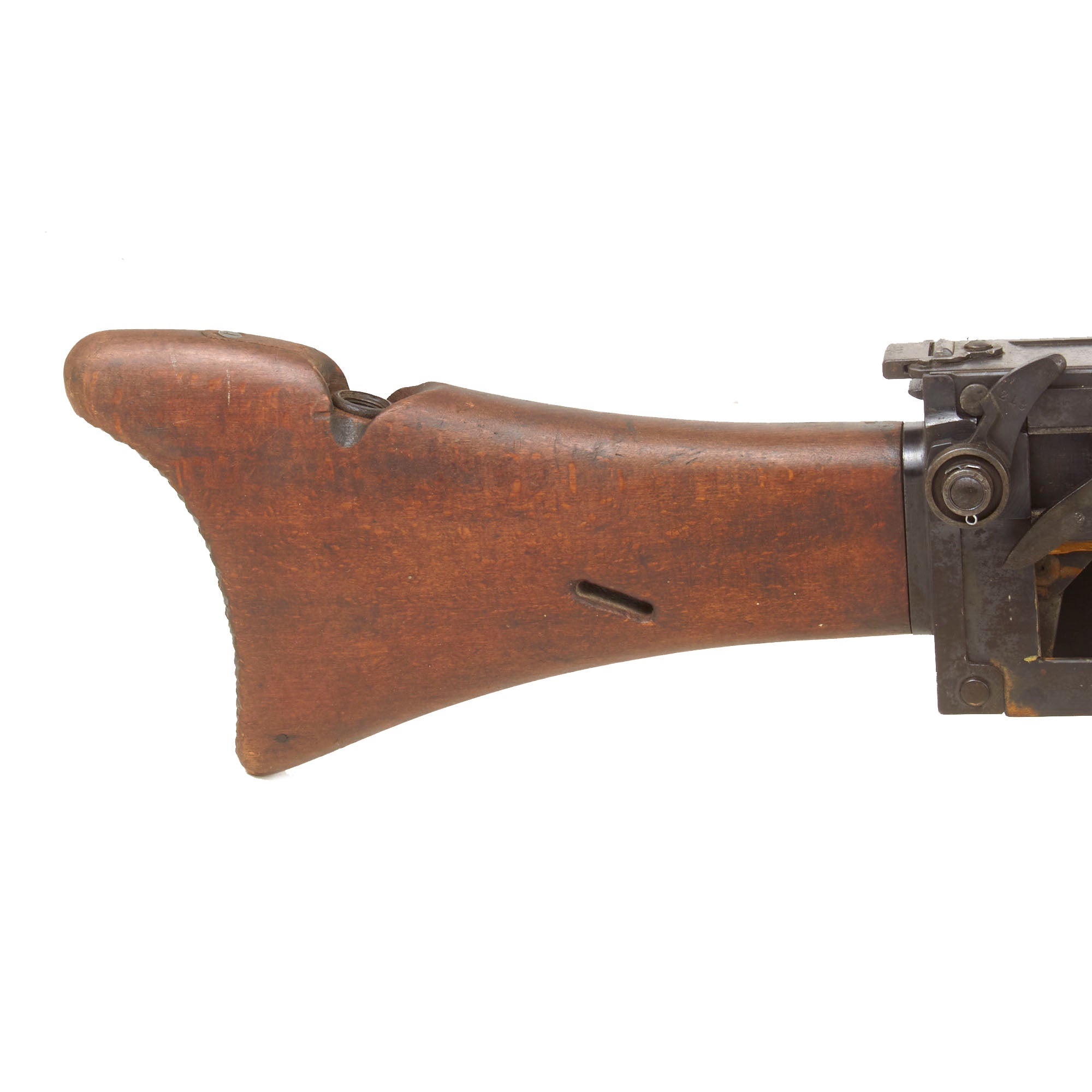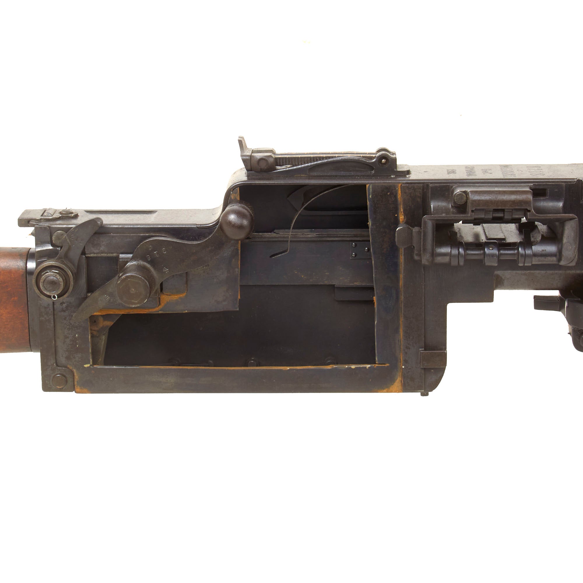 This is a complete and fully BATF compliant inert non-firing display non-gun built using a deactivated right side plate, which has been left open so that the interior can be seen. Please note that the lock is not included, which is almost always lost over the years. The exterior of the display gun shows a lot of the original blued finish, with other areas showing a worn oxidized patina. It looks to have seen light to moderate service during the war.