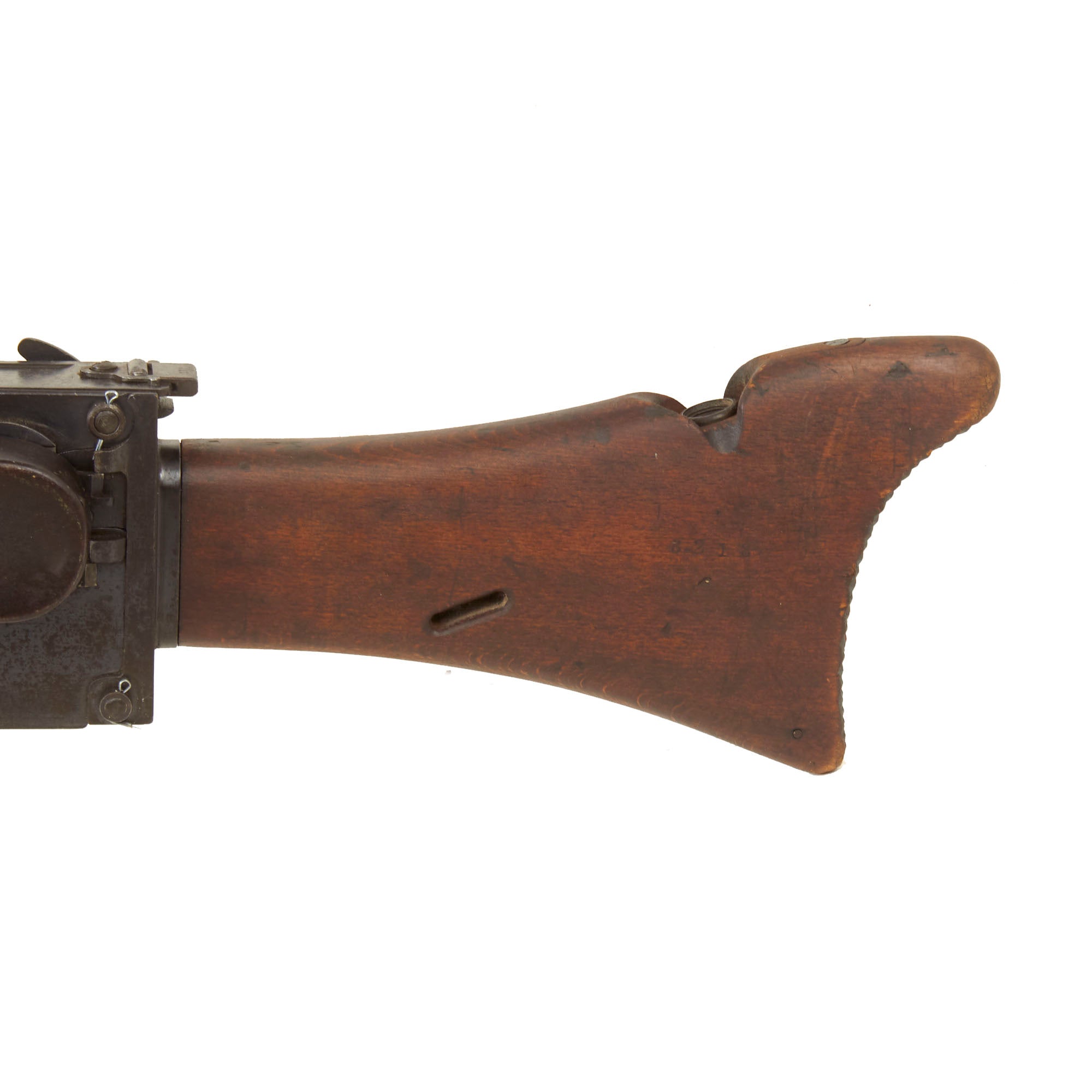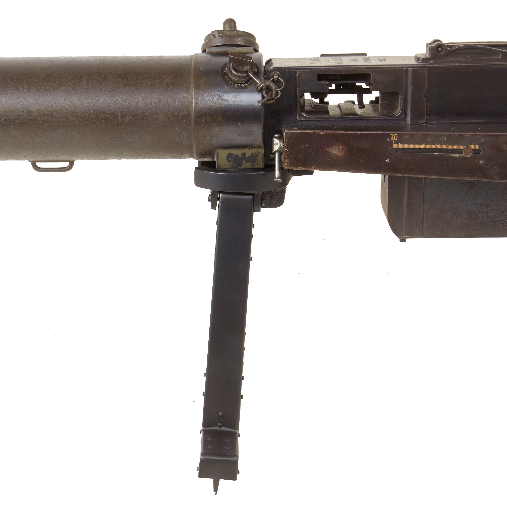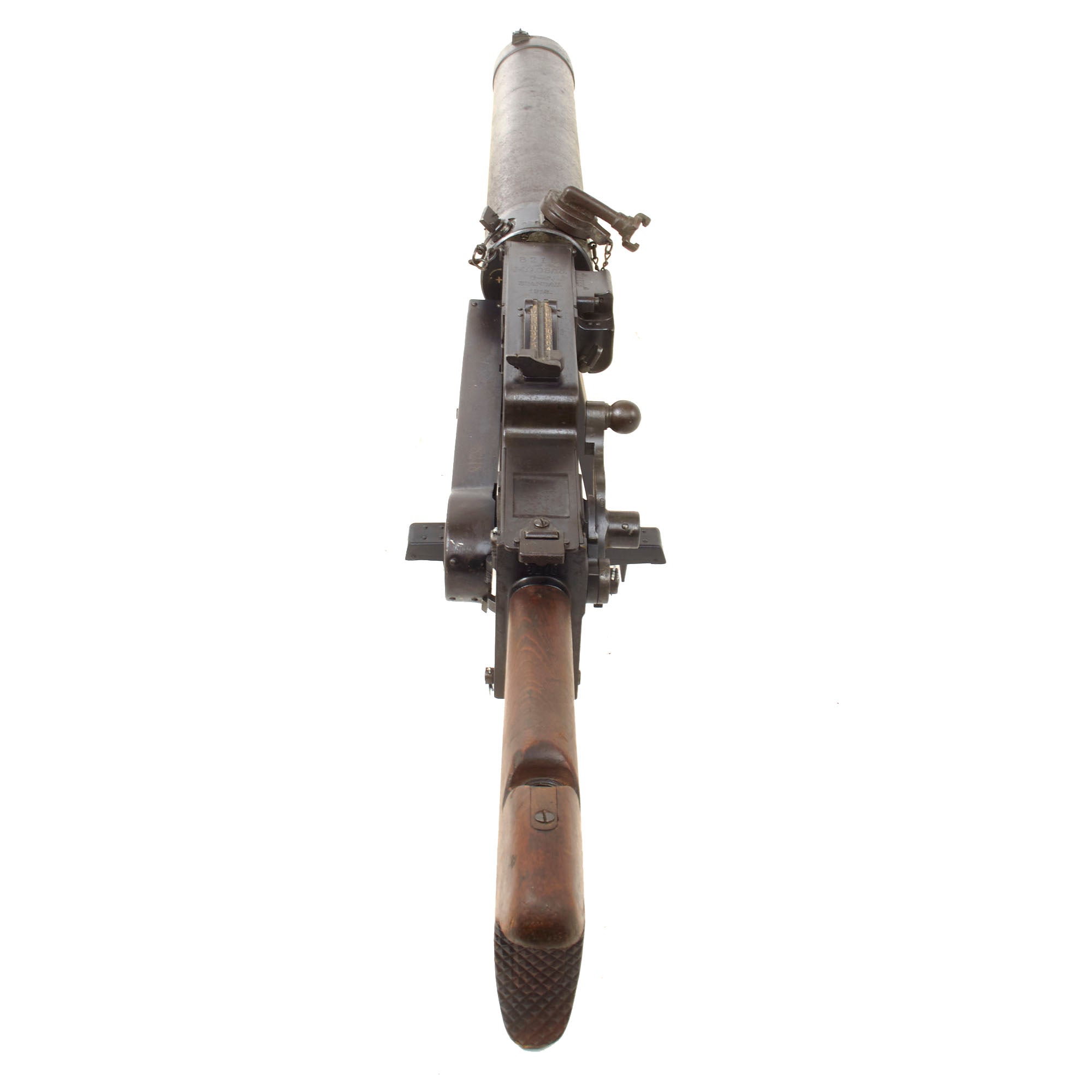 The top cover, feed block, fusee spring cover, left side plate, and barrel extension are marked with serial number 8218 / c, while the crank handle, top cover latch and other components all have the serial number 218 meaning this is a very rare matched numbered example! There are lot of markings and proofs on this example, typical of WW1 German production. All of the parts are original German WWI manufacture except for the bipod. Condition is very good, with the fusee spring assembly still intact under the cover. We did note that the lever on the feed block that engages the barrel extension unfortunately broke off at some point long ago.