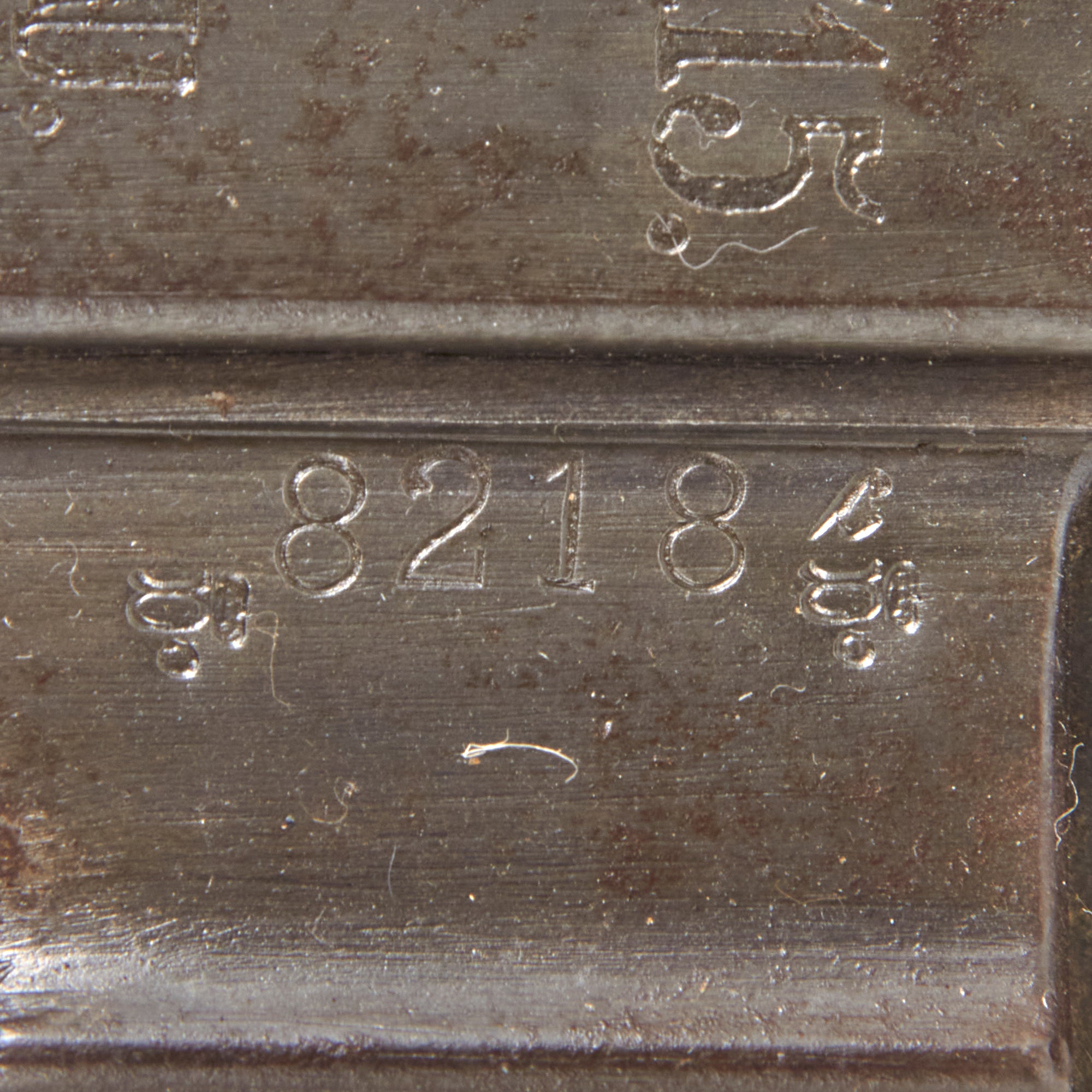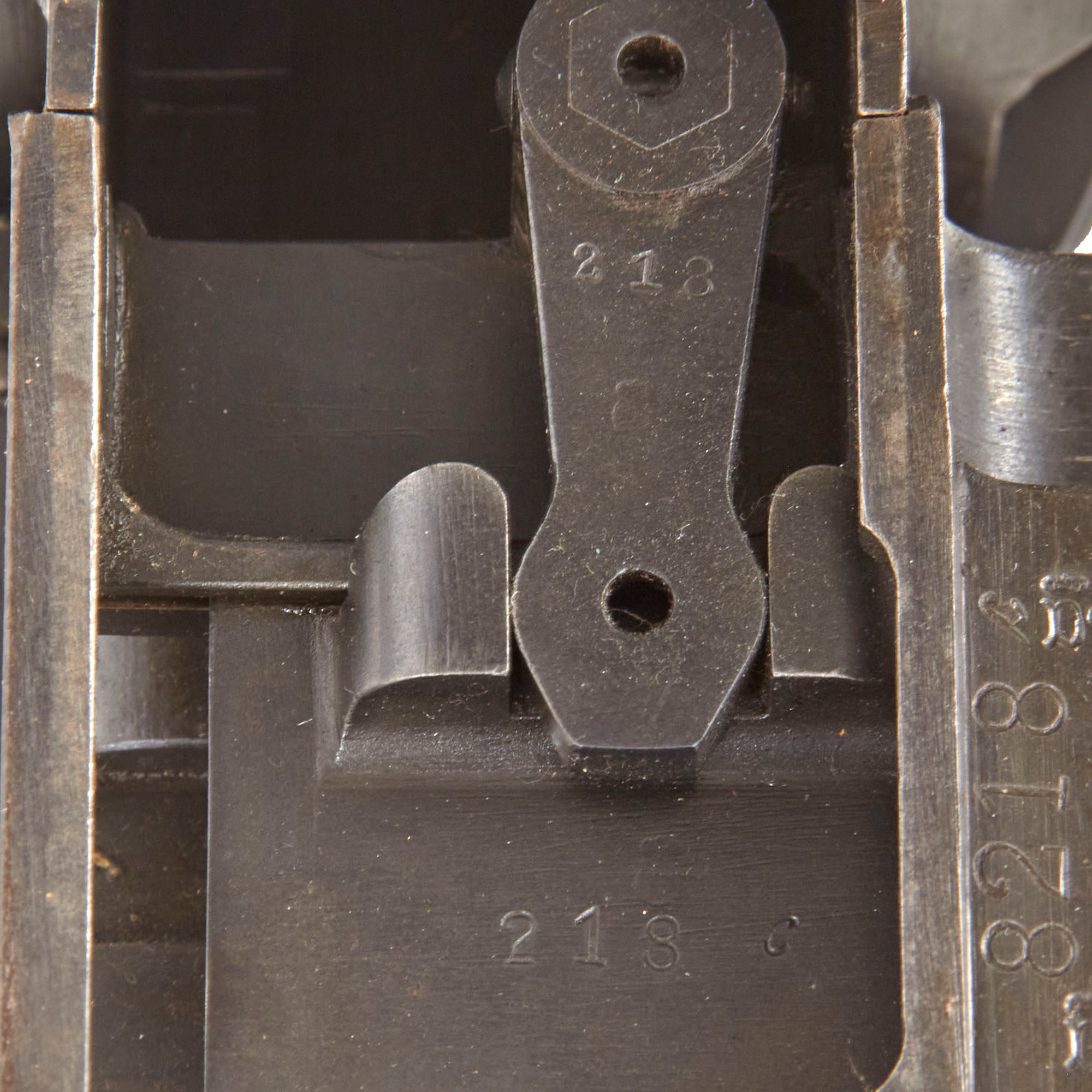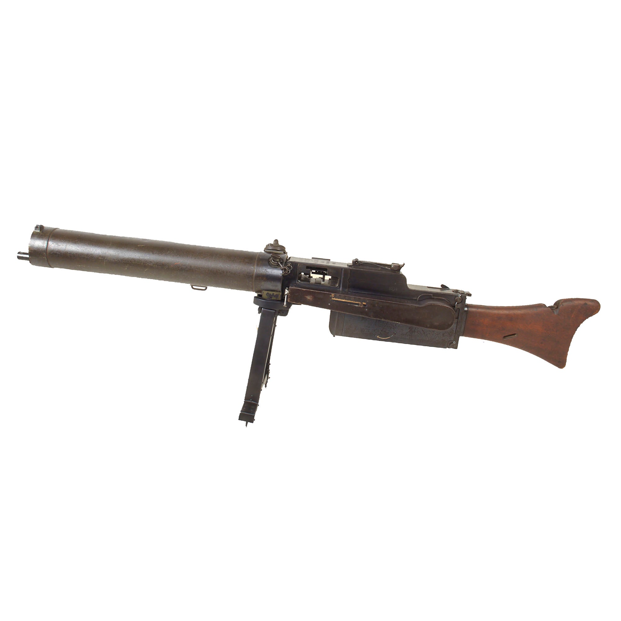 The top cover, feed block, fusee spring cover, left side plate, and barrel extension are marked with serial number 8218 / c, while the crank handle, top cover latch and other components all have the serial number 218 meaning this is a very rare matched numbered example! There are lot of markings and proofs on this example, typical of WW1 German production. All of the parts are original German WWI manufacture except for the bipod. Condition is very good, with the fusee spring assembly still intact under the cover. We did note that the lever on the feed block that engages the barrel extension unfortunately broke off at some point long ago.