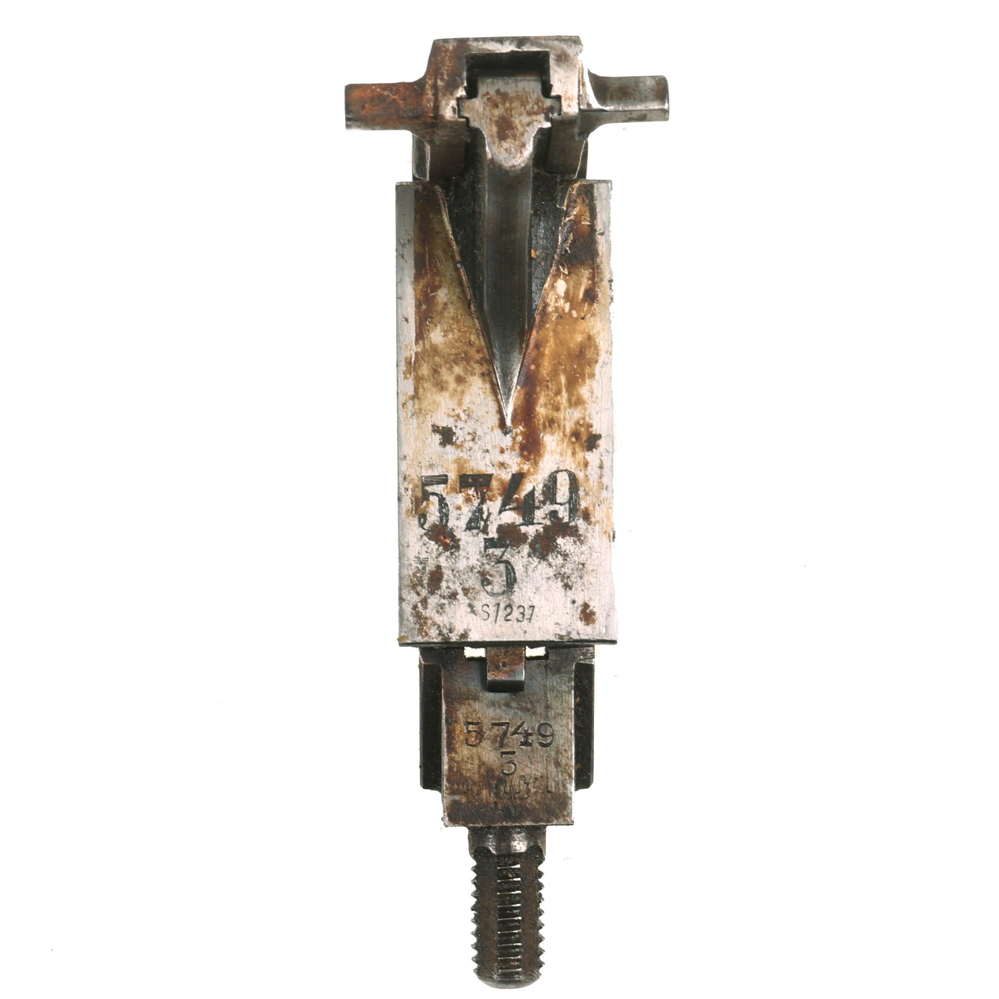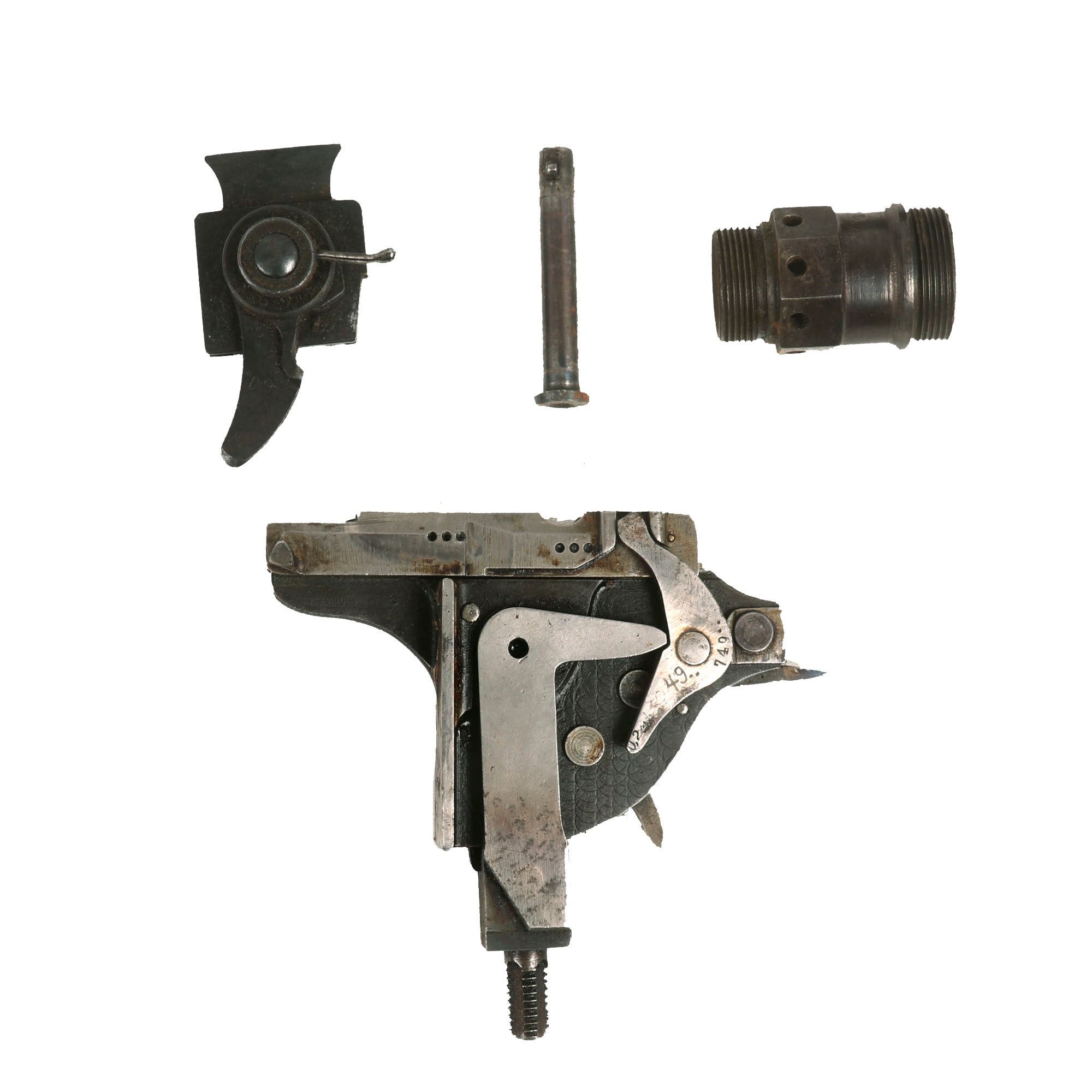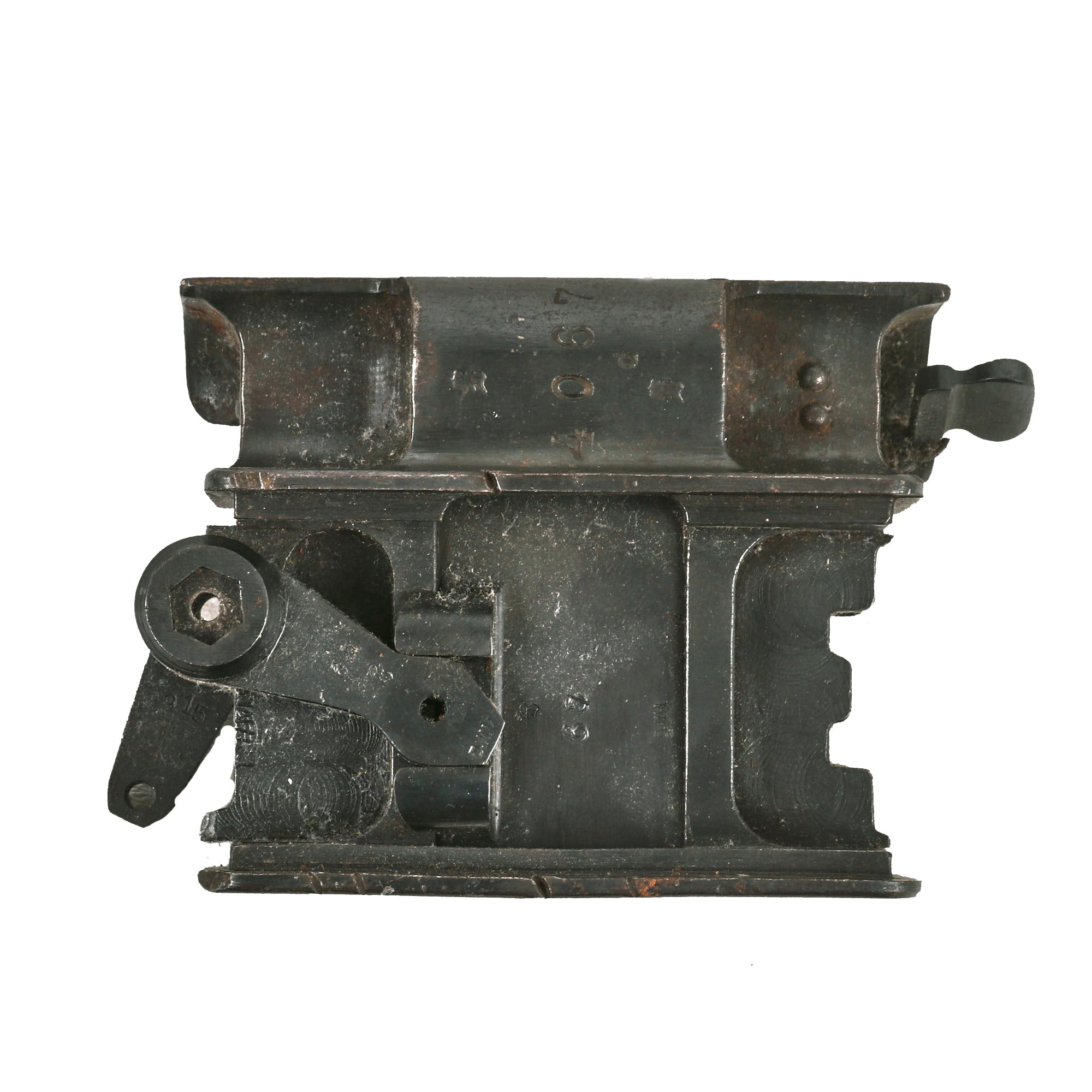 This parts set was made from parts matching machine gun, and almost all the components that would normally have the serial number are marked with 44067 d, 4067, or shortened number 67, in typical German fashion. The only notable non-matching part is the lock, which bears serial number 5749 / 3, probably swapped out during long service, as the barrel was. There are lot of markings and proofs on this example, typical of WW1 German production.