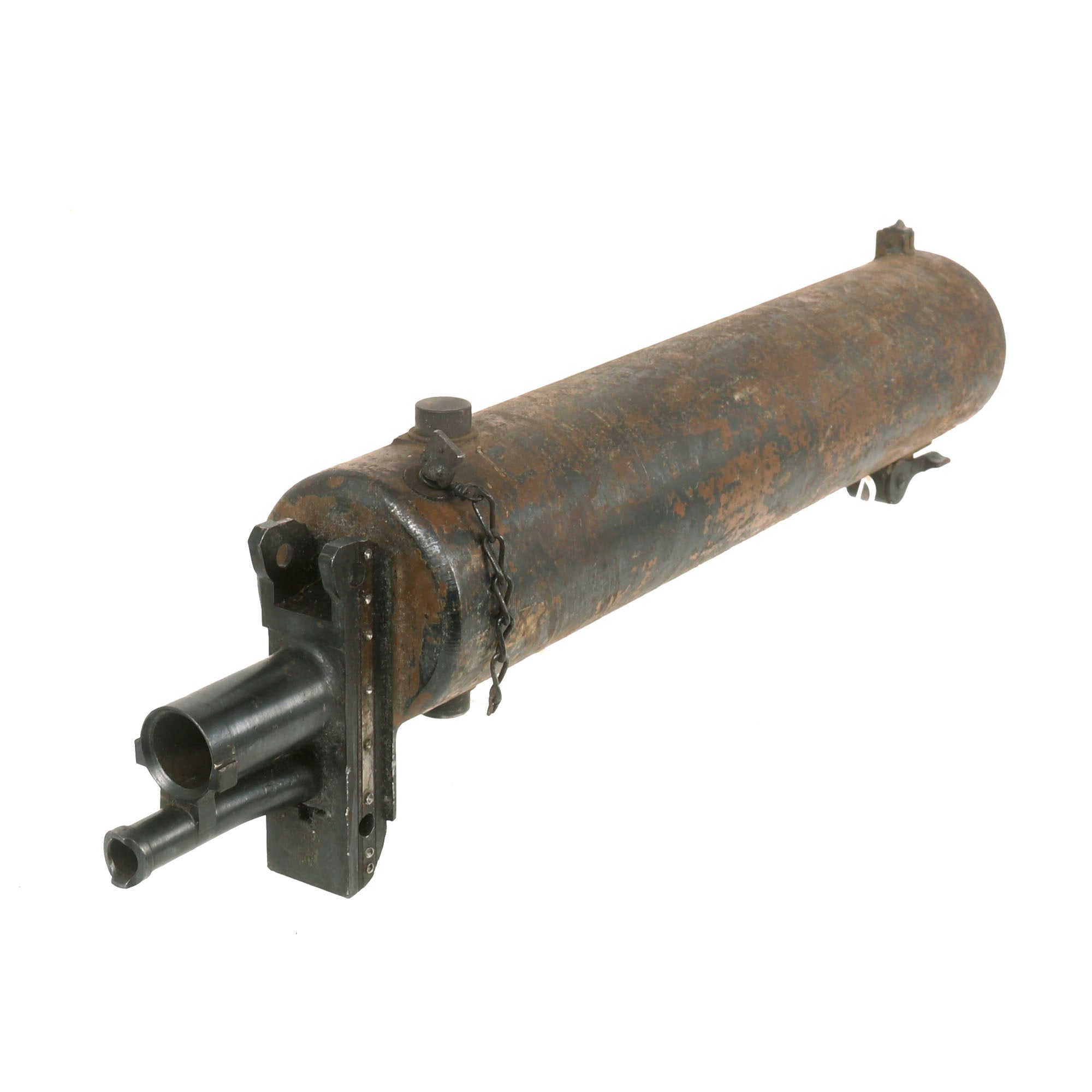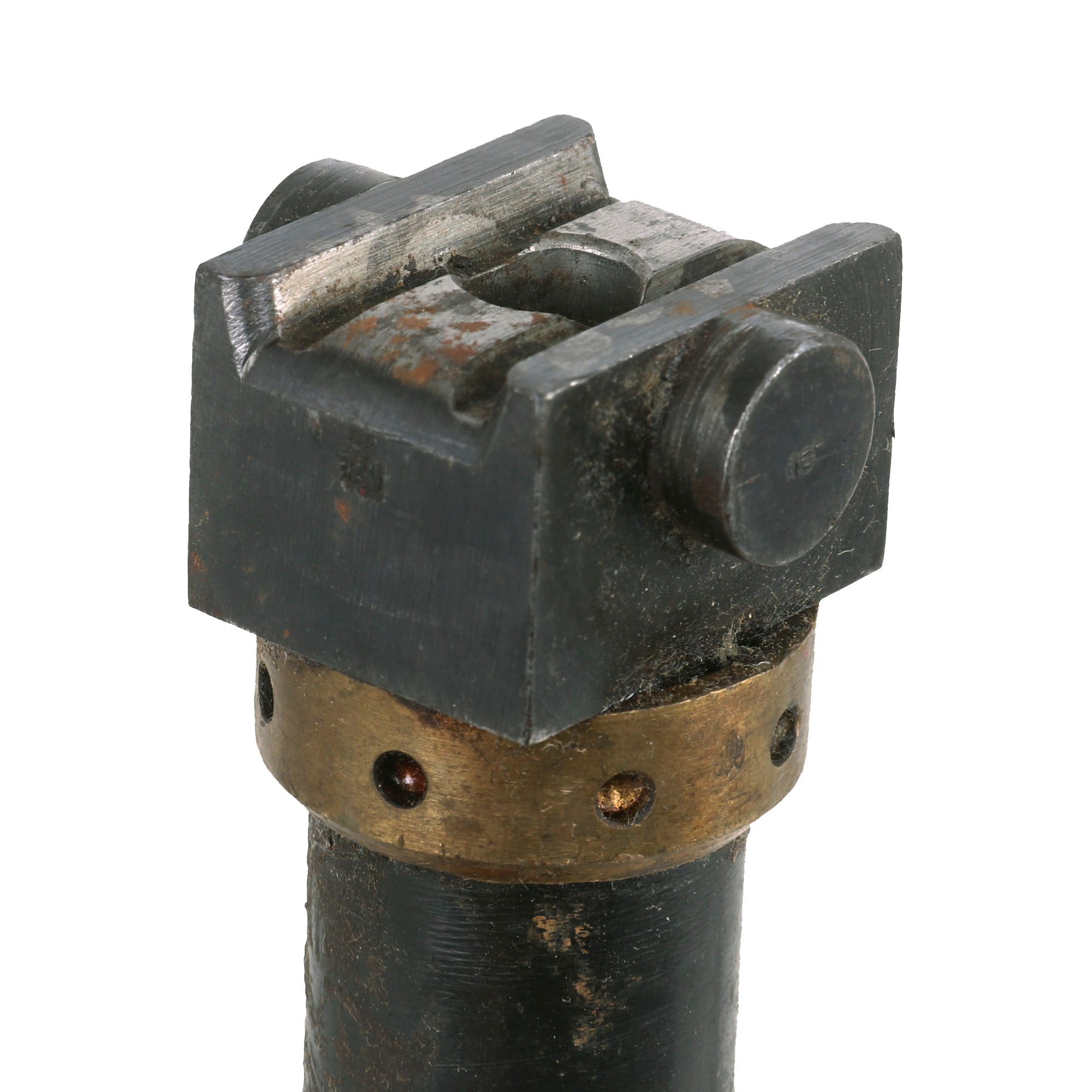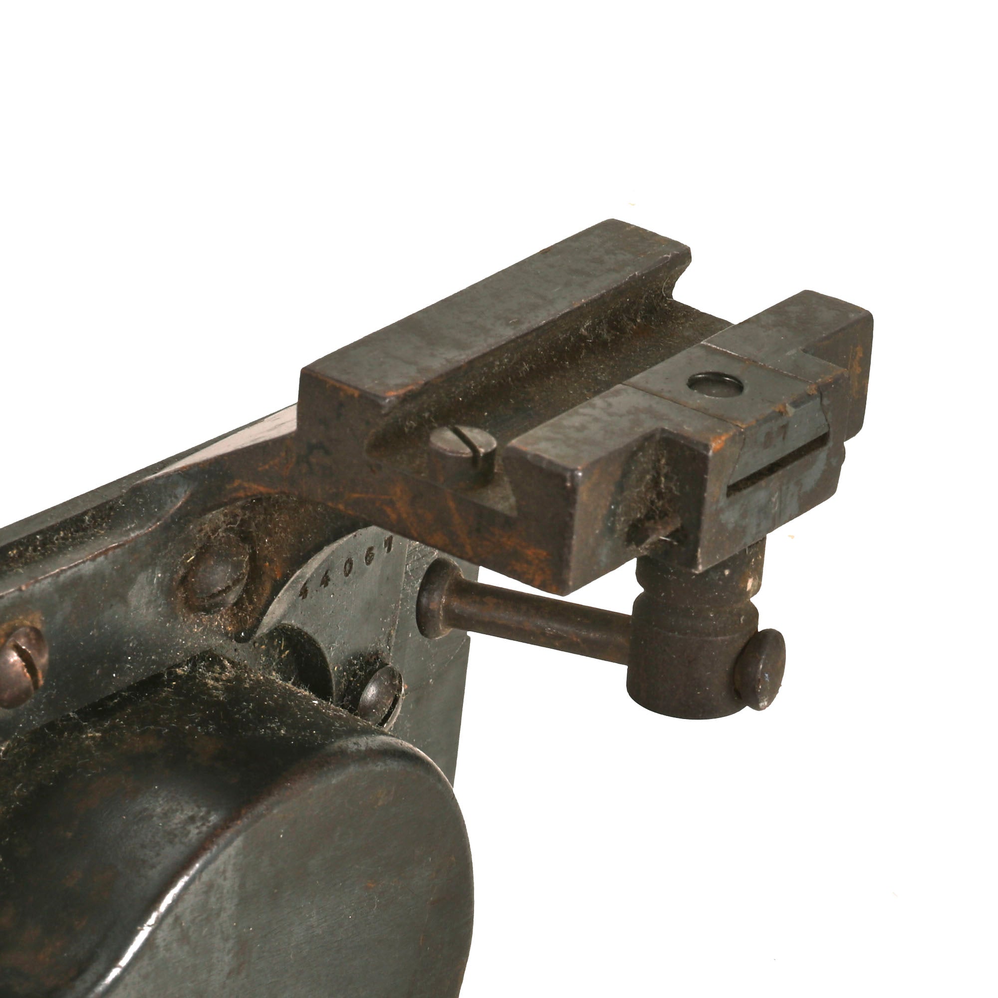 We checked the spade grip, and the trigger still works correctly, and BOTH of the original oil brushes are still intact, stored inside of the lovely wooden grips. The water jacket is in great shape, still retaining a good amount of the wartime camouflage paint that had been applied. The left side plate still has the fusee cover mounted, and the spring is still inside, though we do not know if the crank connector is present.