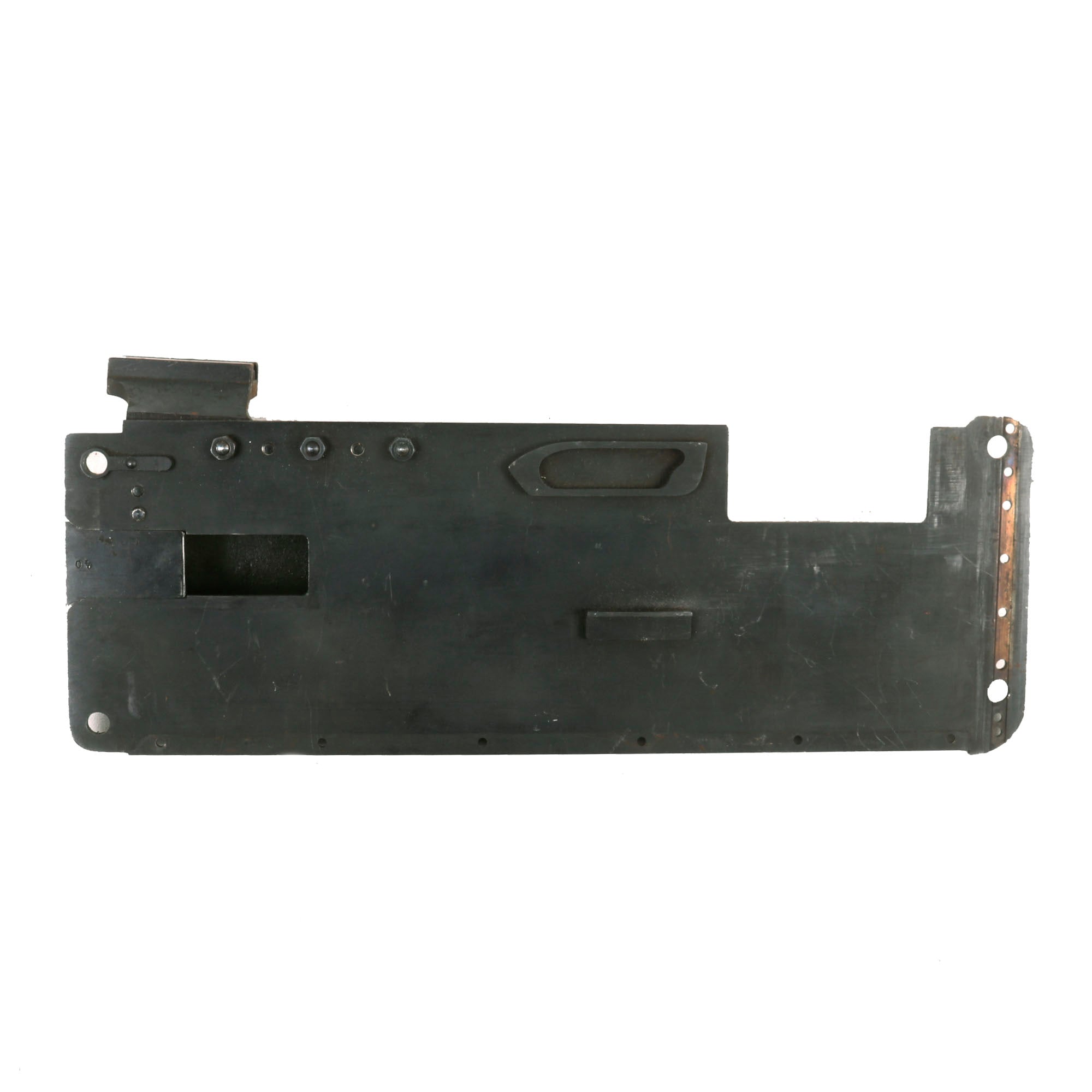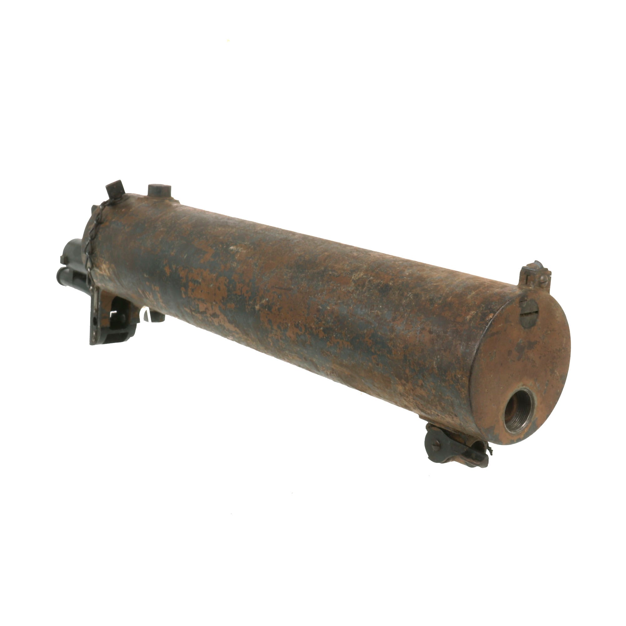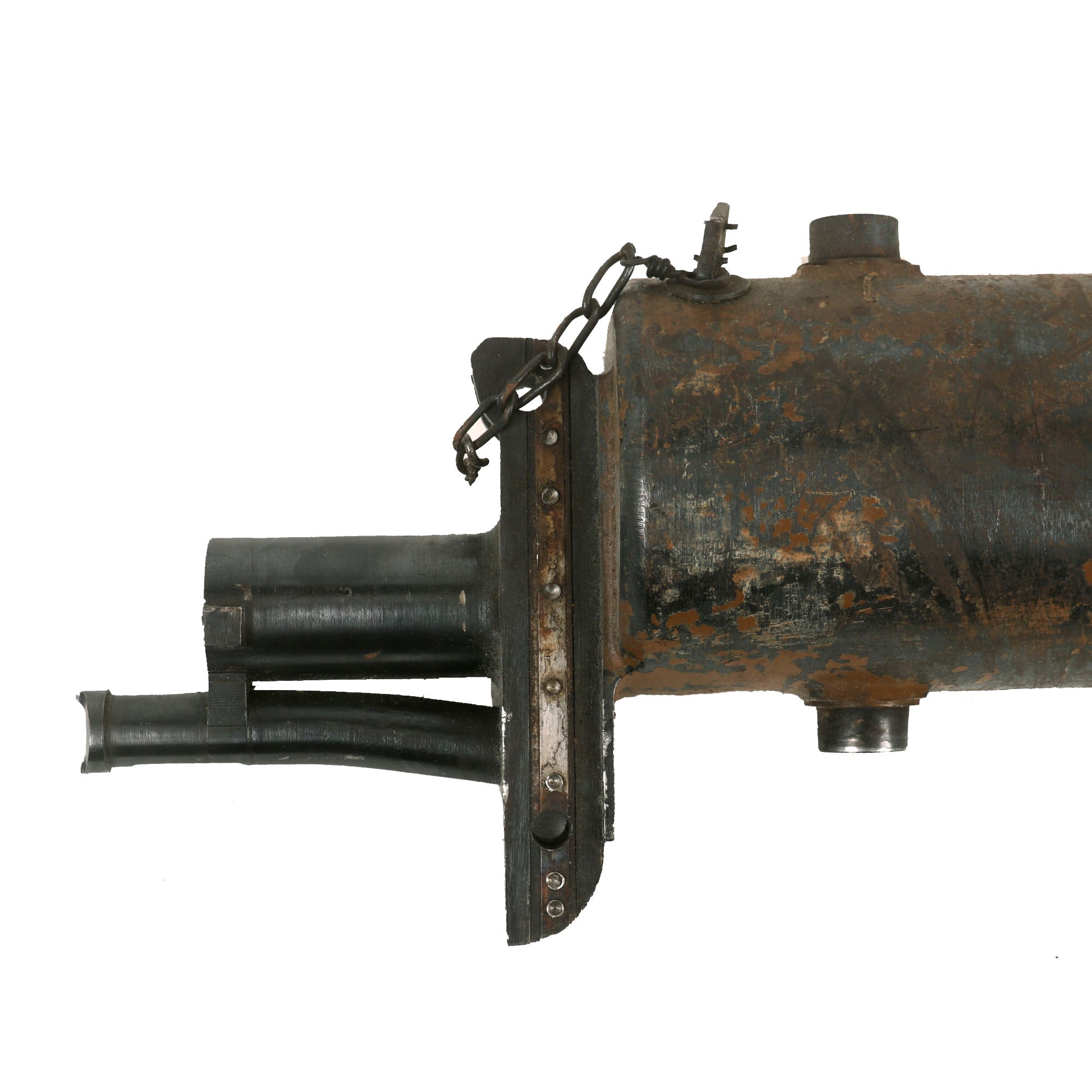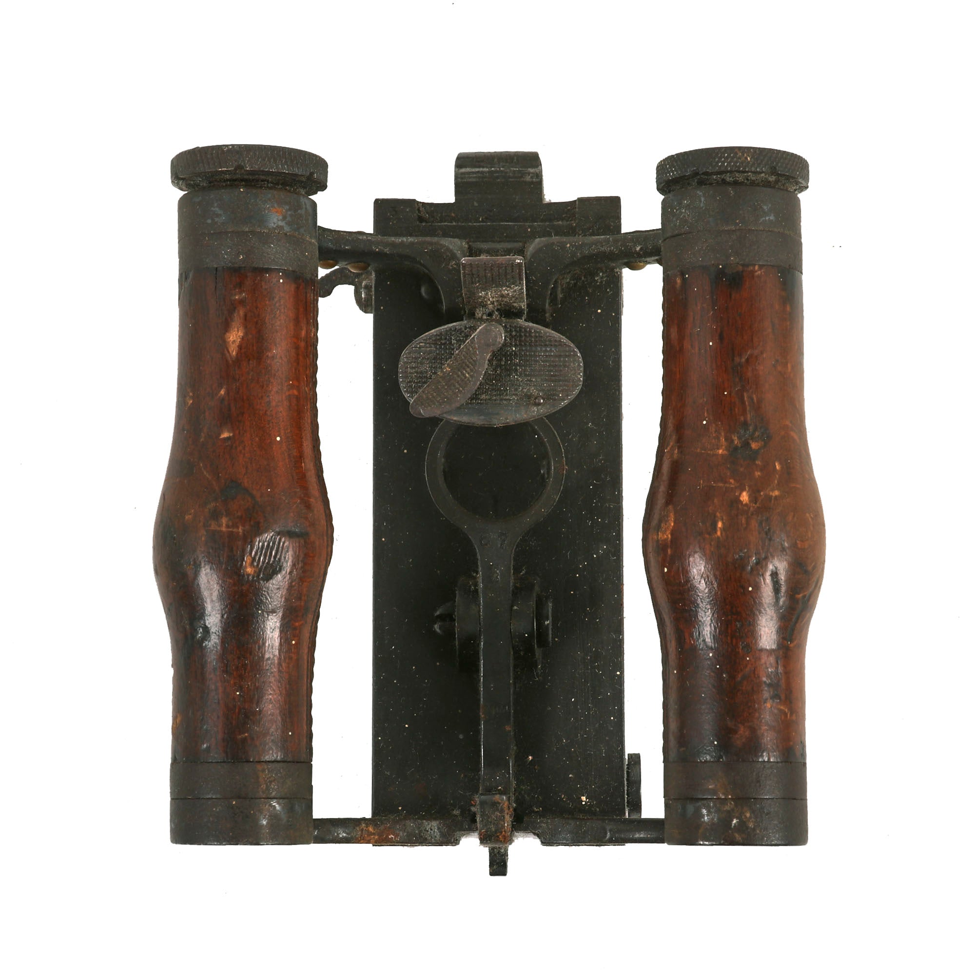 We checked the spade grip, and the trigger still works correctly, and BOTH of the original oil brushes are still intact, stored inside of the lovely wooden grips. The water jacket is in great shape, still retaining a good amount of the wartime camouflage paint that had been applied. The left side plate still has the fusee cover mounted, and the spring is still inside, though we do not know if the crank connector is present.
