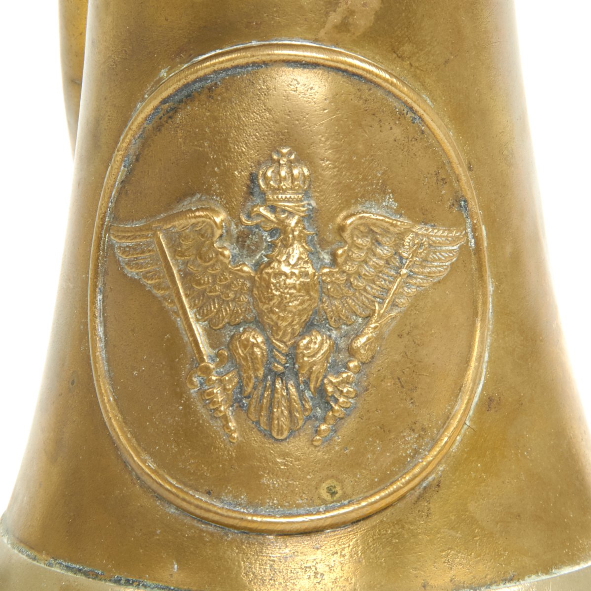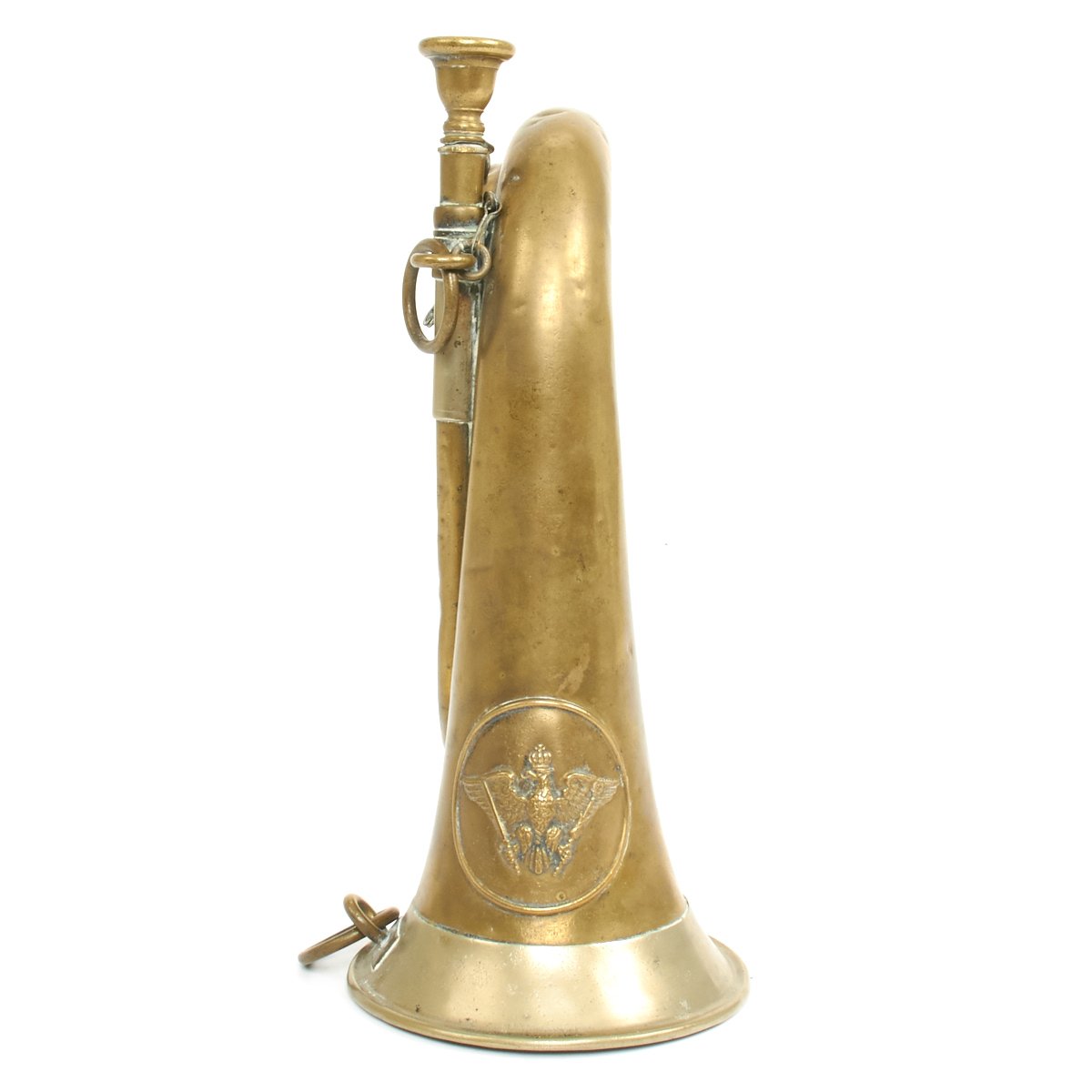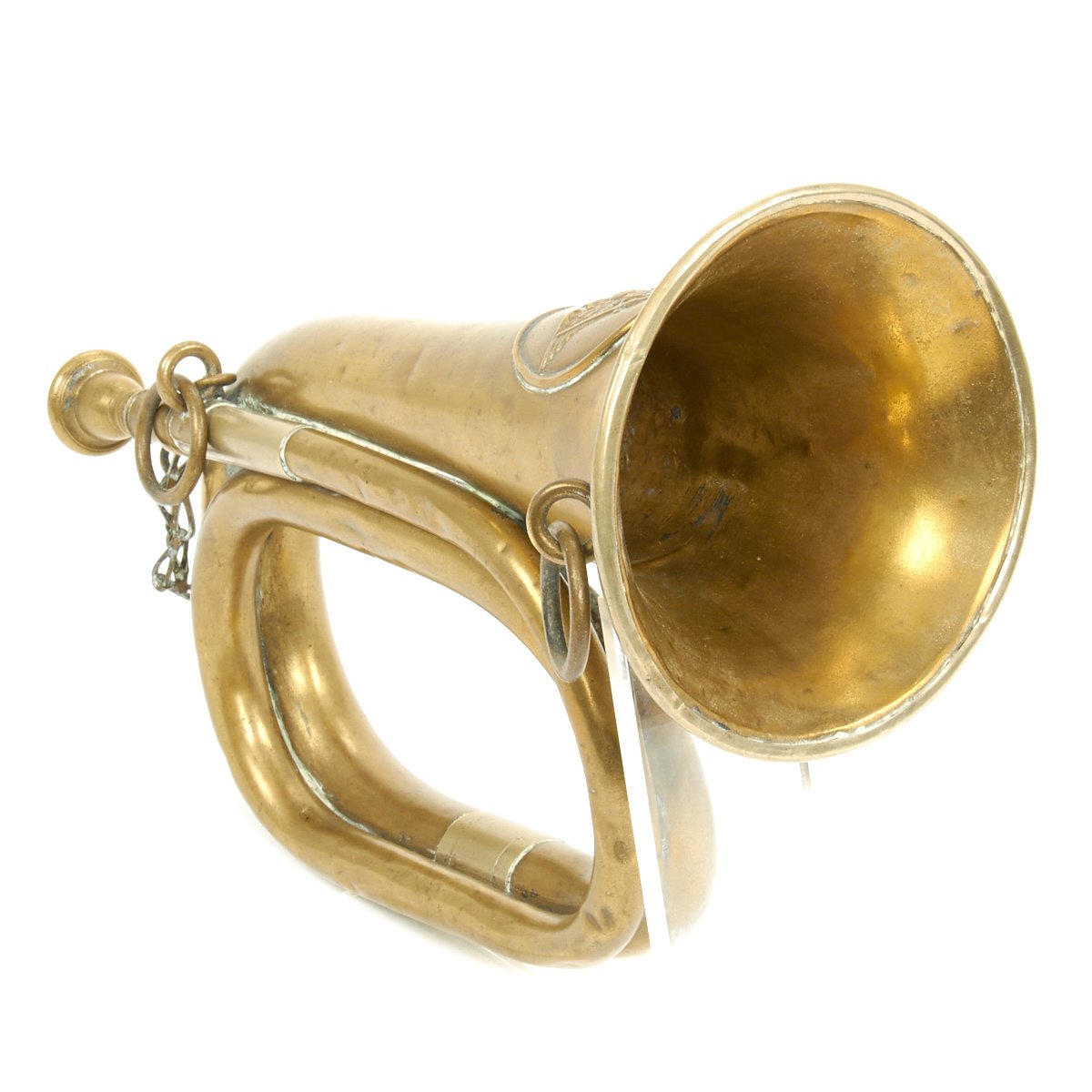 Original Item: Only One Available. This German Military bugle is of all brass construction with nickel silver fittings, typical of German brass instruments. Showing use, it bears substantial dents with some scrapes but is absolutely authentic. It comes complete with its original mouth piece and two suspension rings and with a pleasant tarnished finish overall. The brass mouthpiece chain, so often missing, is present and in great condition.
