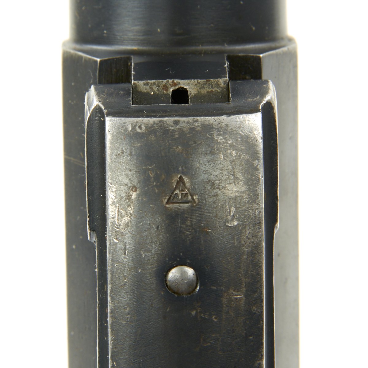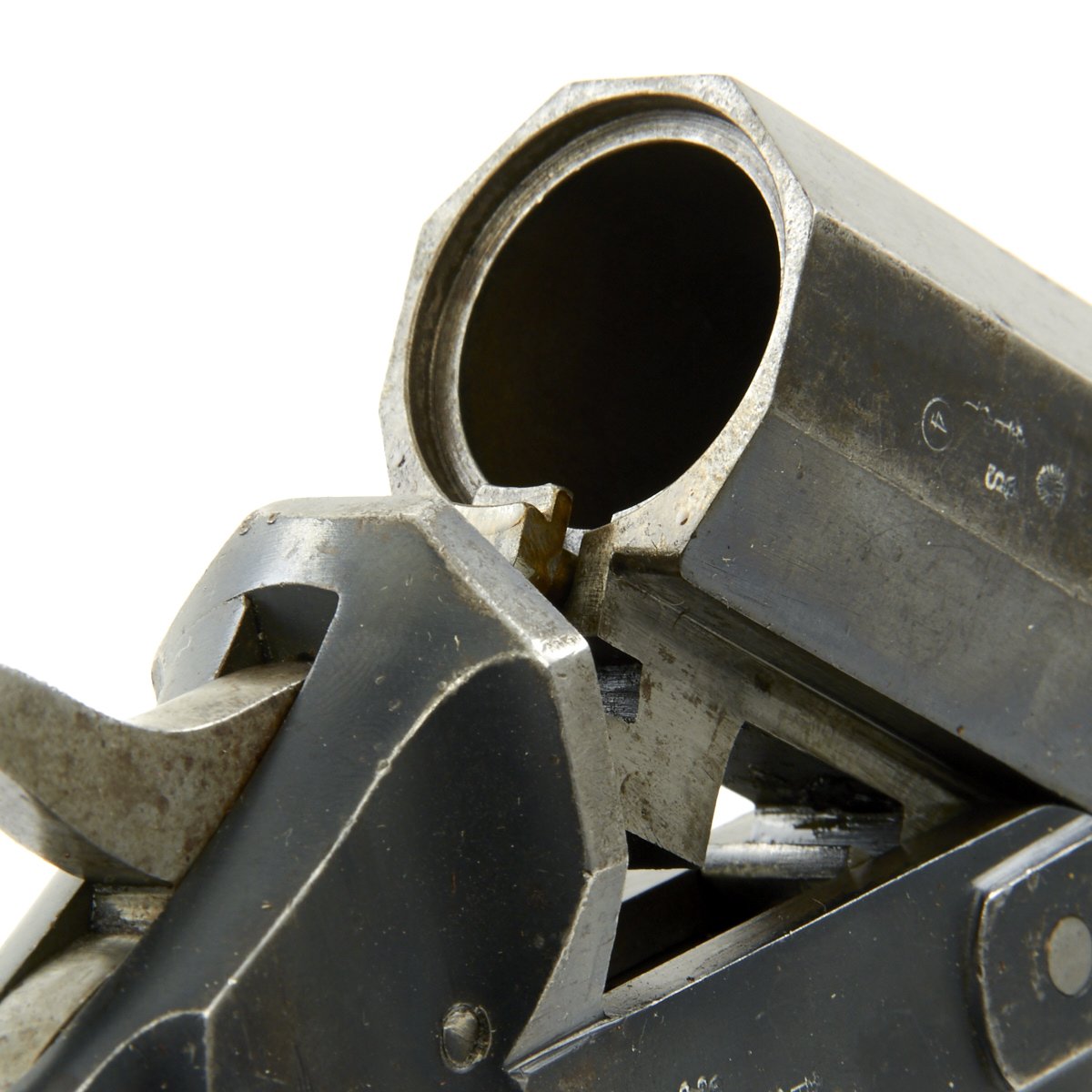 Original Item: Only One Available. This is a very good condition WWI Imperial German Model 1894 Hebel flare pistol. These were manufactured by many different companies, not all of which can be identified from the markings along. This example is serial marked 14916 on the left side of the frame and on the underside of the barrel latch. Also the screws and pins are mostly marked with shortened serial number 16. There is a maker mark next to the serial number, which we have seen before, but unfortunately have not identified. There are multiple small proof marks (faded) on the right side of frame and barrel. Metal finish is a nice worn blue with some areas of pitting near the muzzle and on the right side of the breech. The wood grips have original finish and a good tight fit with some normal handling marks. Lanyard ring is still present (rare). Mechanically tight and excellent.