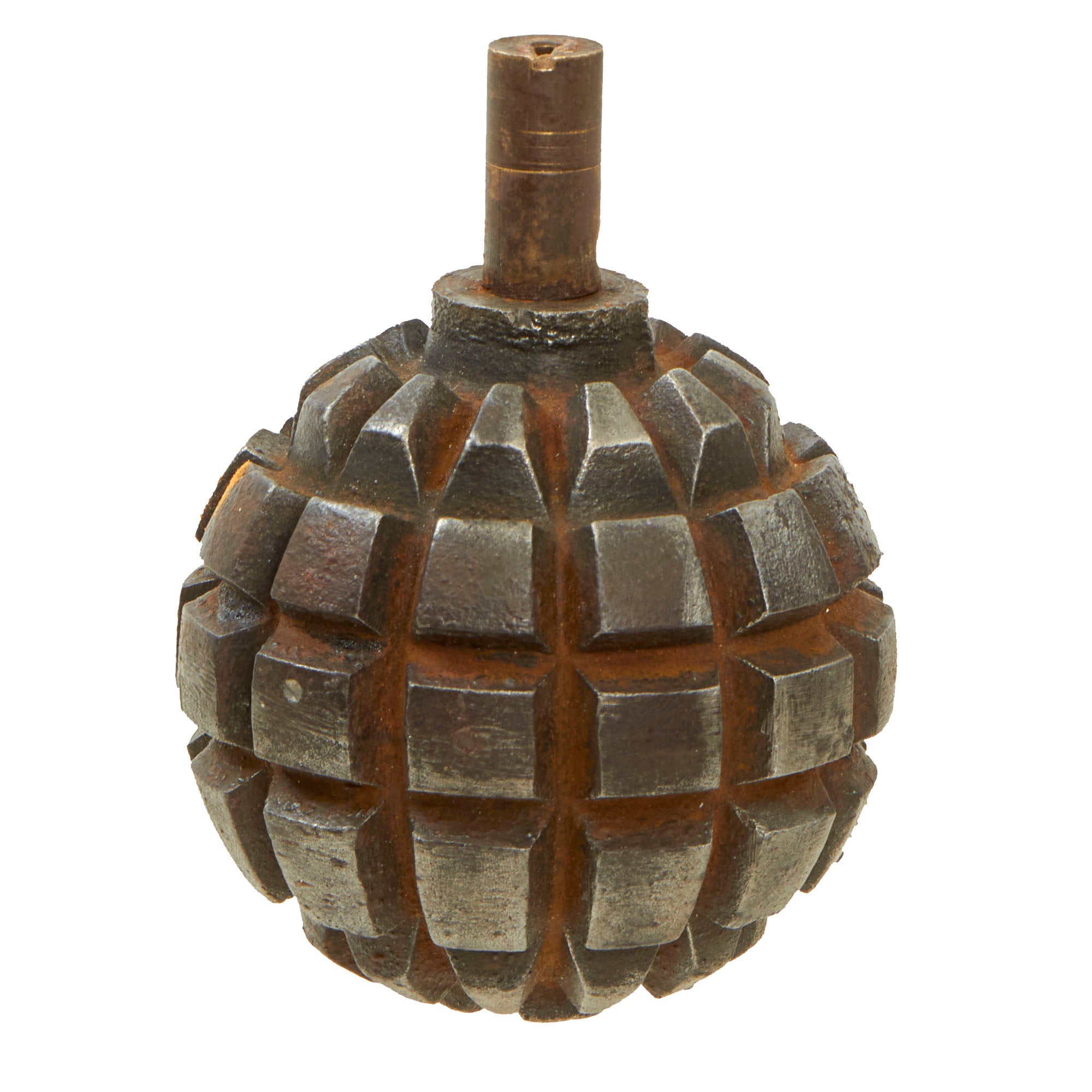 This example is quite nice though it most definitely was cleaned of any surface corrosion which removed the lacquered finish. It still has an original deactivated friction-ignited fuze, without the pull wire. The zinc M1915 traction fuze assembly still screws out, with the detonator stalk showing some corrosion. Highly desirable, and sure to be the centerpiece of any grenade collection!