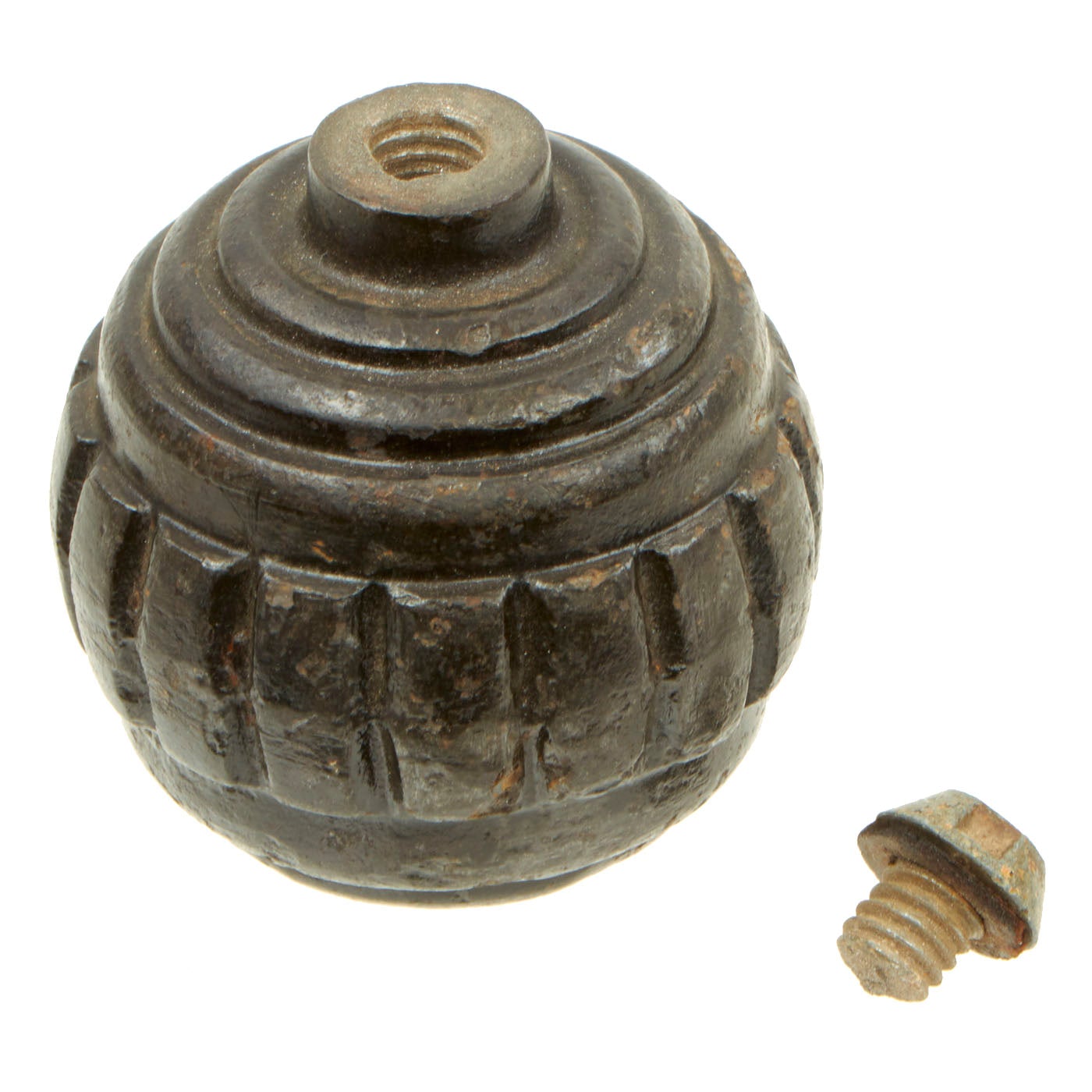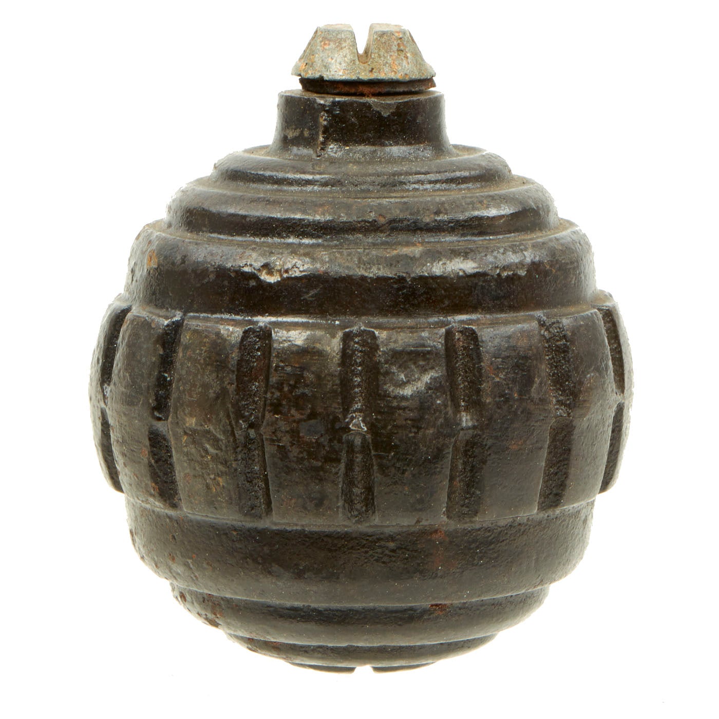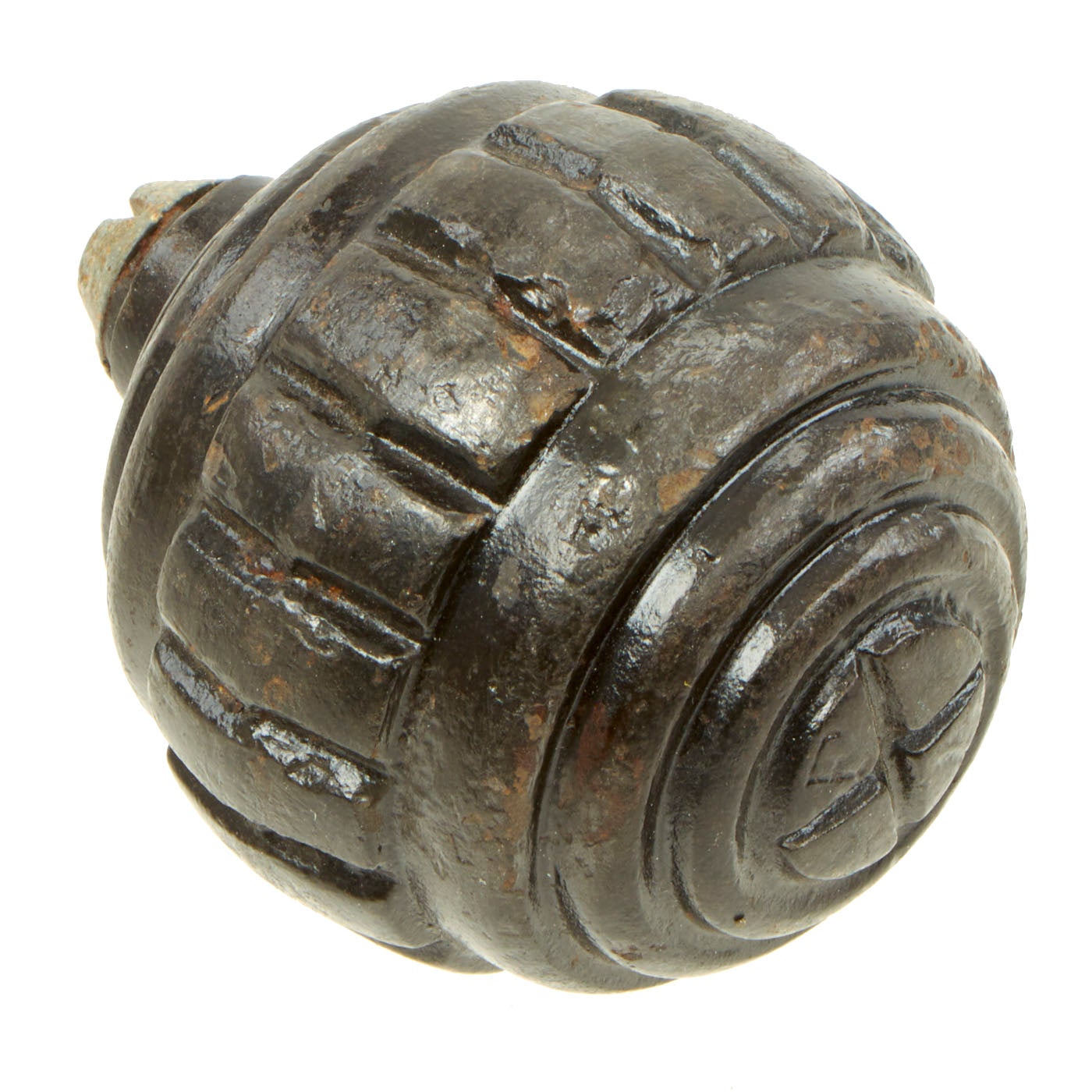 Original Item: Only One Available. The Kugelhandgranate ("ball hand grenade") is the name given to several models of hand thrown fragmentation grenades manufactured in WWI Germany. This example is known as the Model 1915 n/A (neuer Art = newer model). In 1915 this simplified fragmentation pattern of the 1913 Kugel grenade had been adopted, in order to reduce production time. The only difference was the grooved pattern on the top and bottom of the exterior, and they were otherwise identical in specification.
