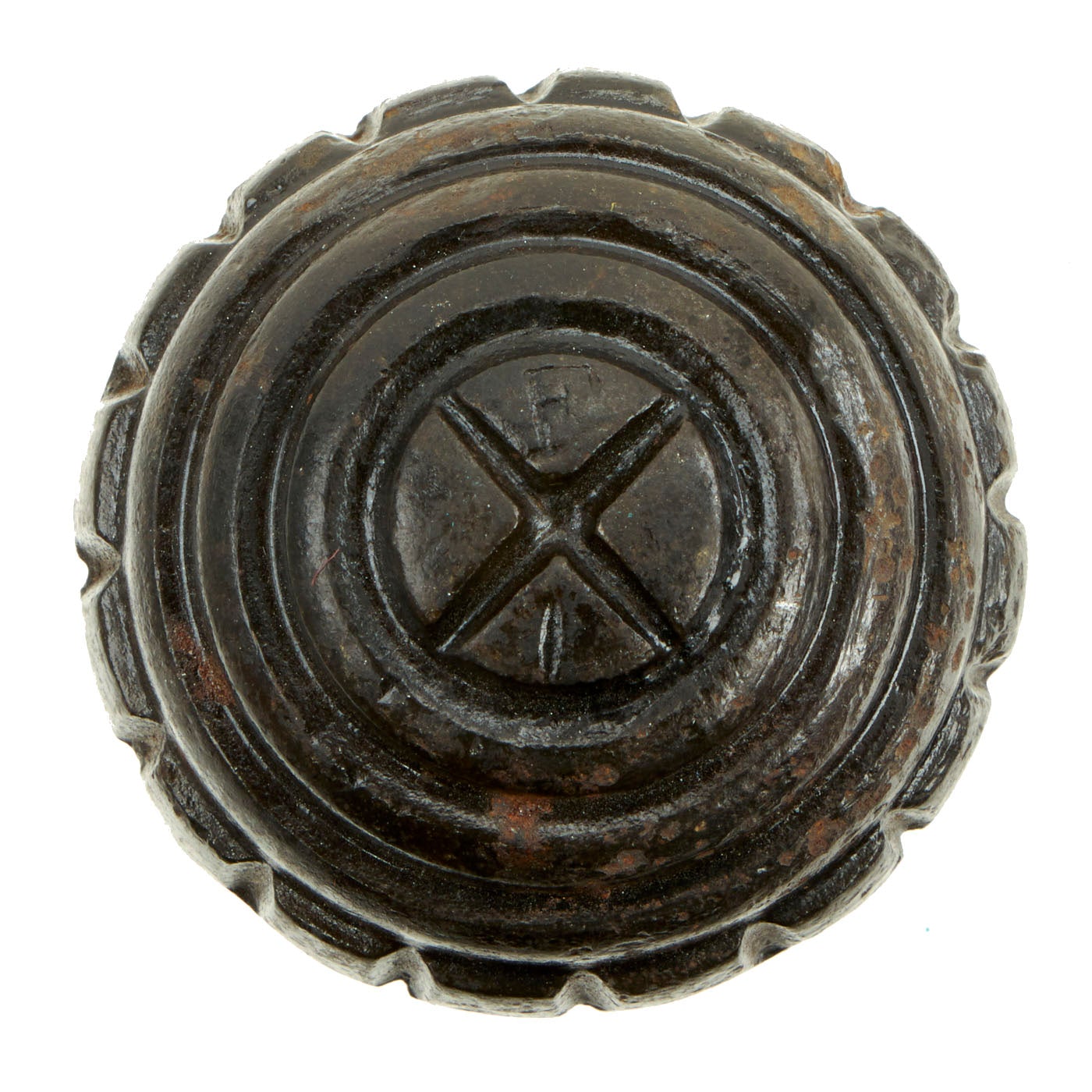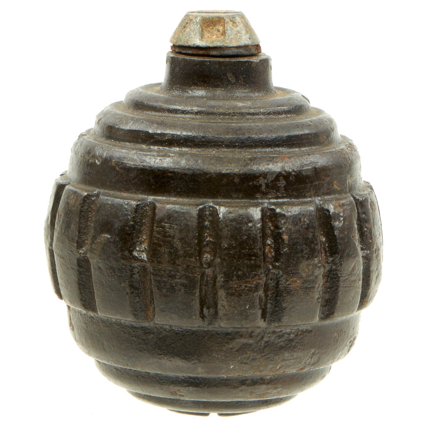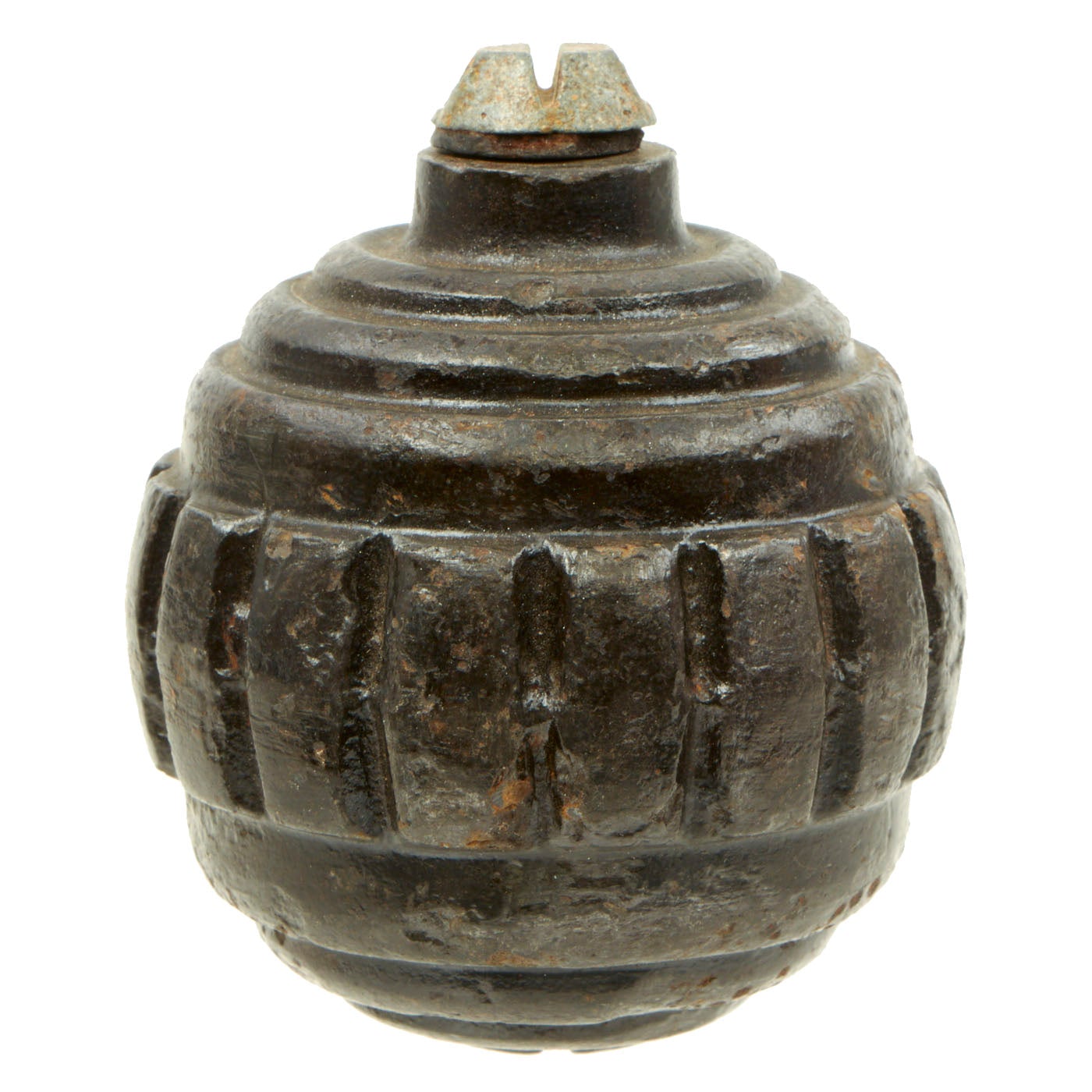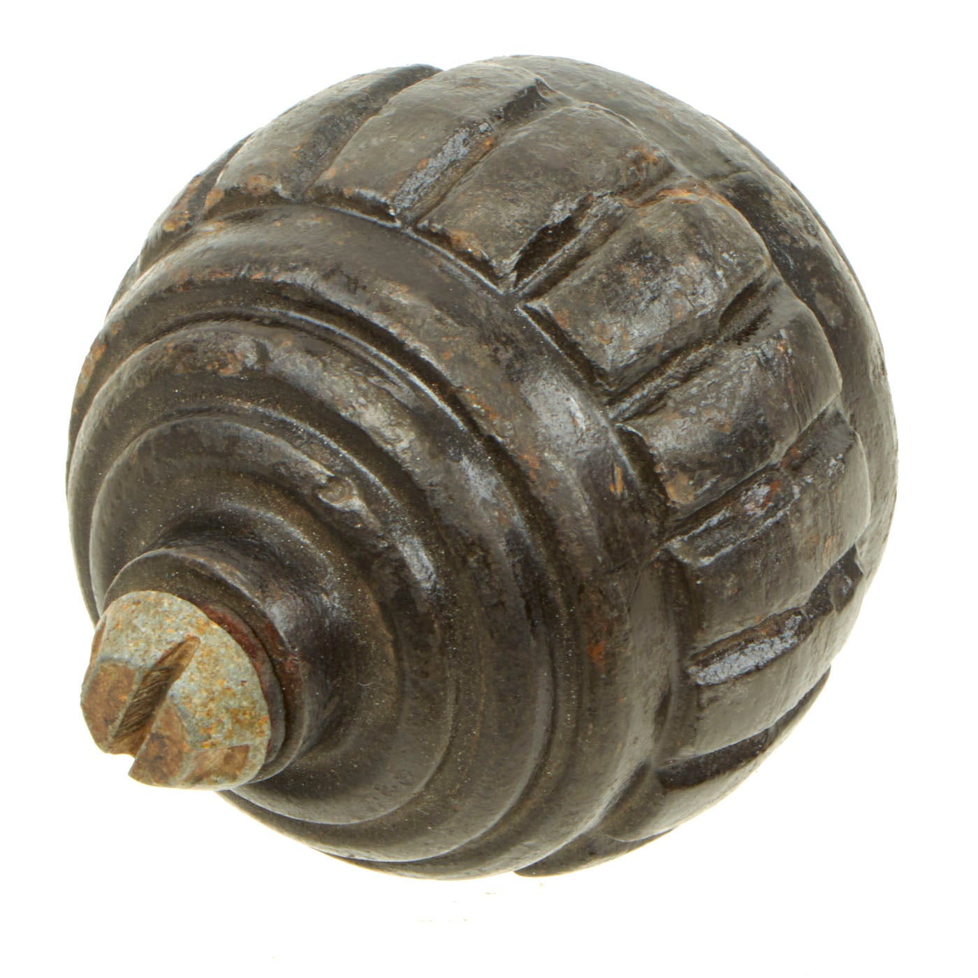 Original Item: Only One Available. The Kugelhandgranate ("ball hand grenade") is the name given to several models of hand thrown fragmentation grenades manufactured in WWI Germany. This example is known as the Model 1915 n/A (neuer Art = newer model). In 1915 this simplified fragmentation pattern of the 1913 Kugel grenade had been adopted, in order to reduce production time. The only difference was the grooved pattern on the top and bottom of the exterior, and they were otherwise identical in specification.