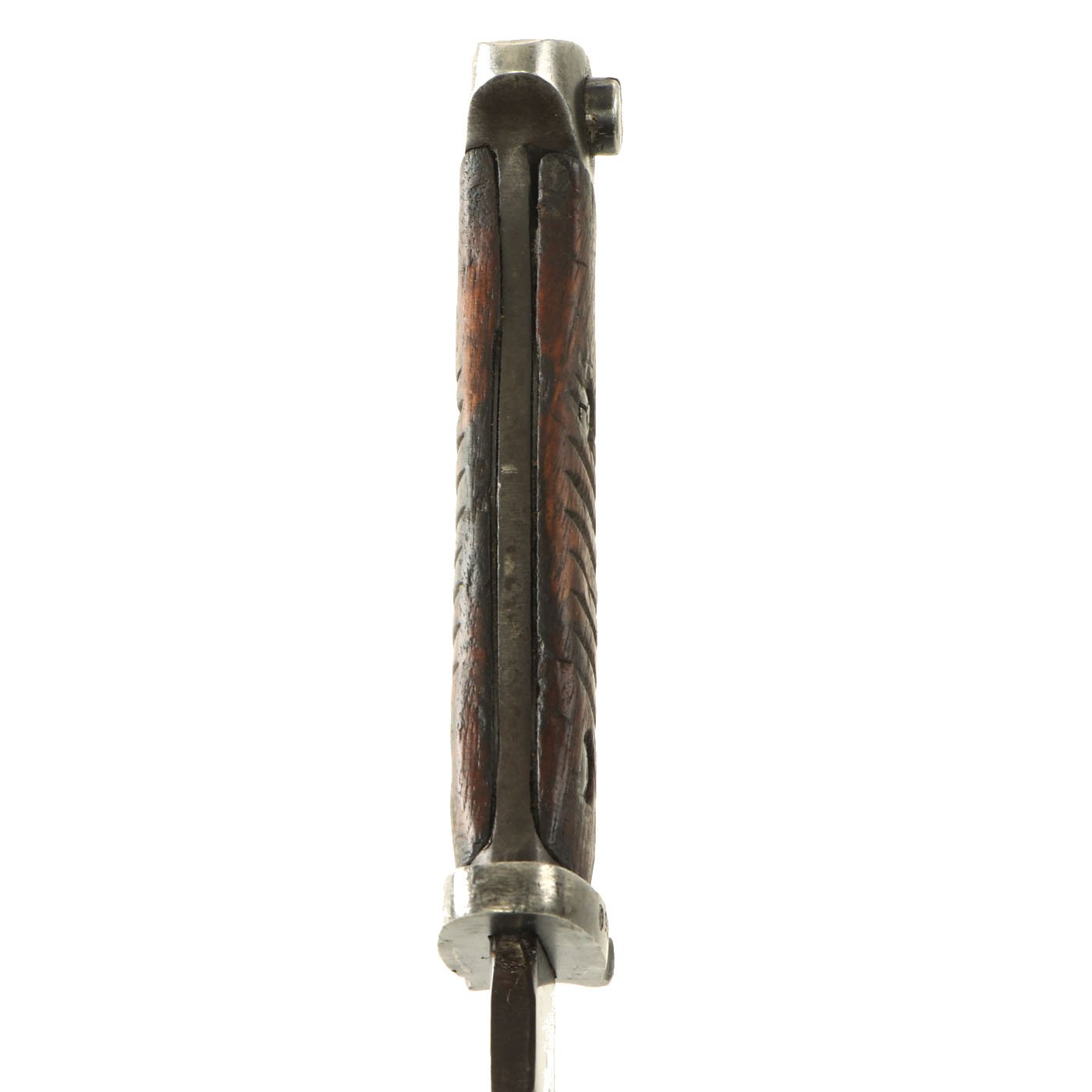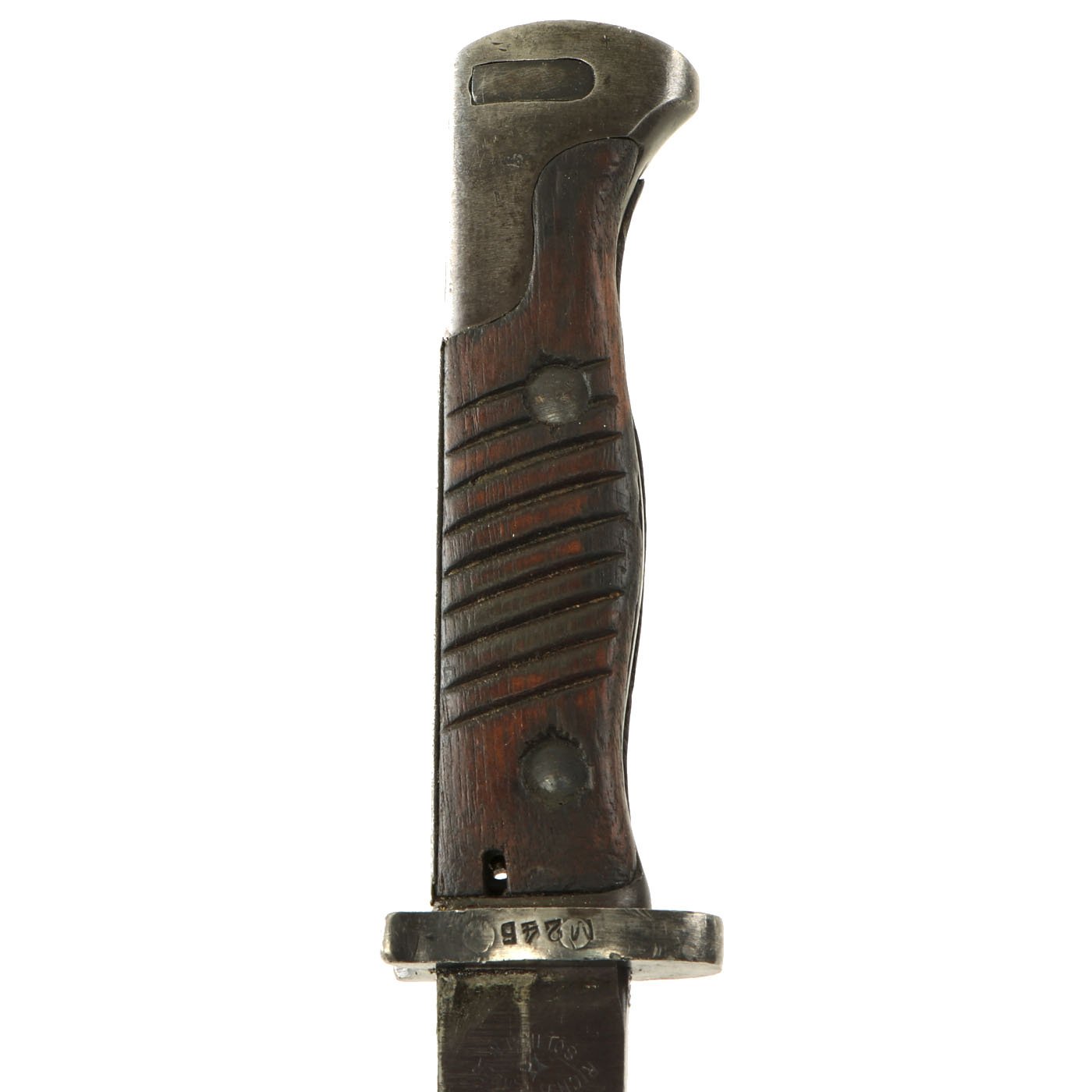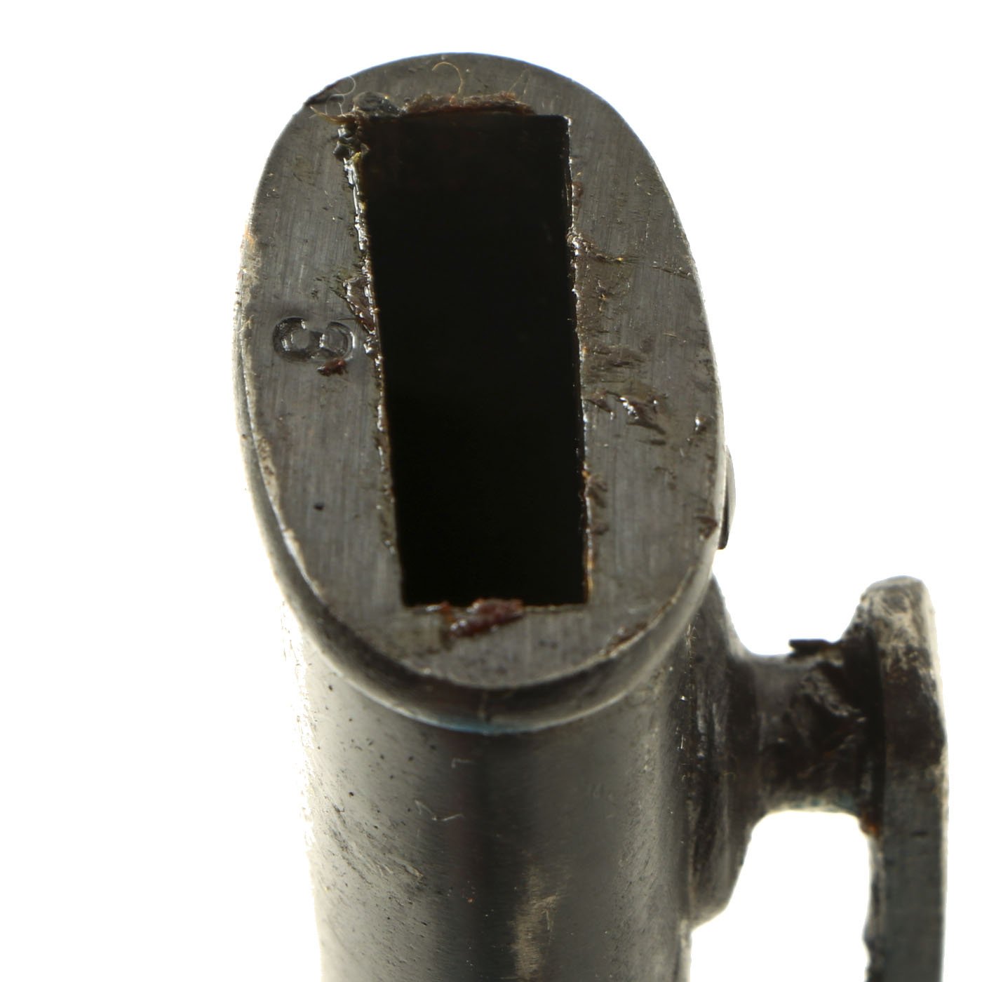 As originally manufactured, these featured a heavy 14.5-inch steel blade with distinct bulge toward the point, giving extra weight and power to the business end, known as a "butcher blade". However, this example was modified post at arsenal circa 1924 to have more standard thinner blade. The blade was reprofiled and reblued, which unfortunately has made the markings somewhat faint. The cross guard was also minimized to be closer to the standard 98K bayonet. These became known as the M98/05/24 Bayonet.