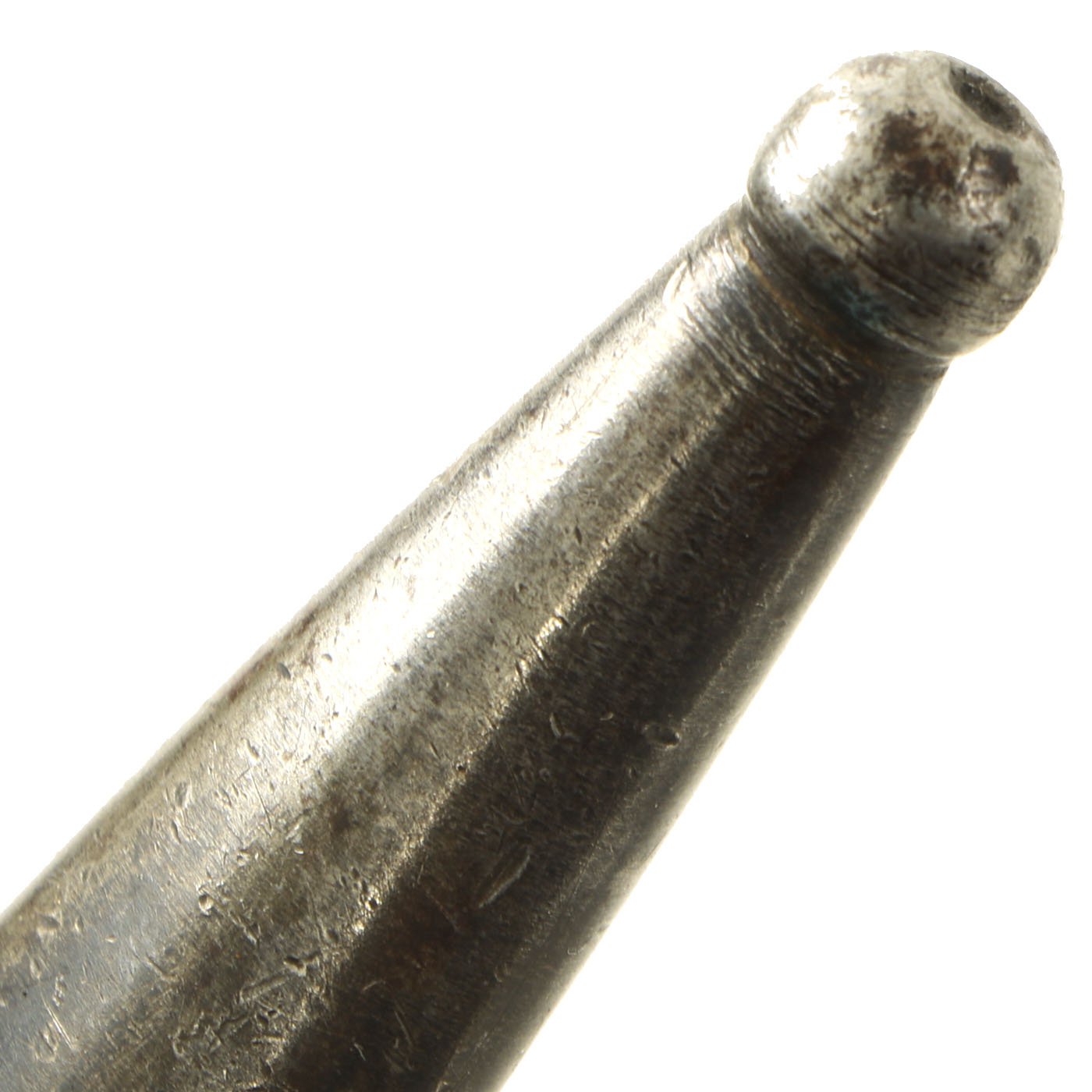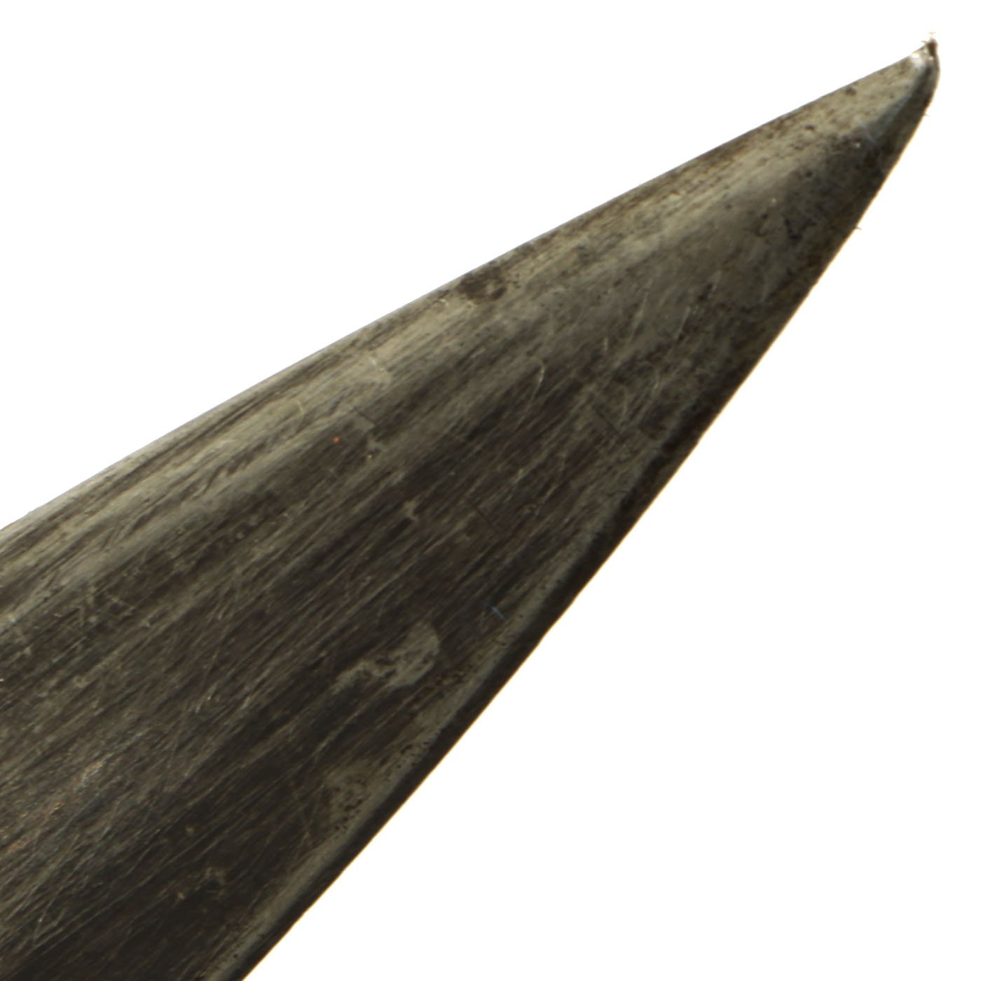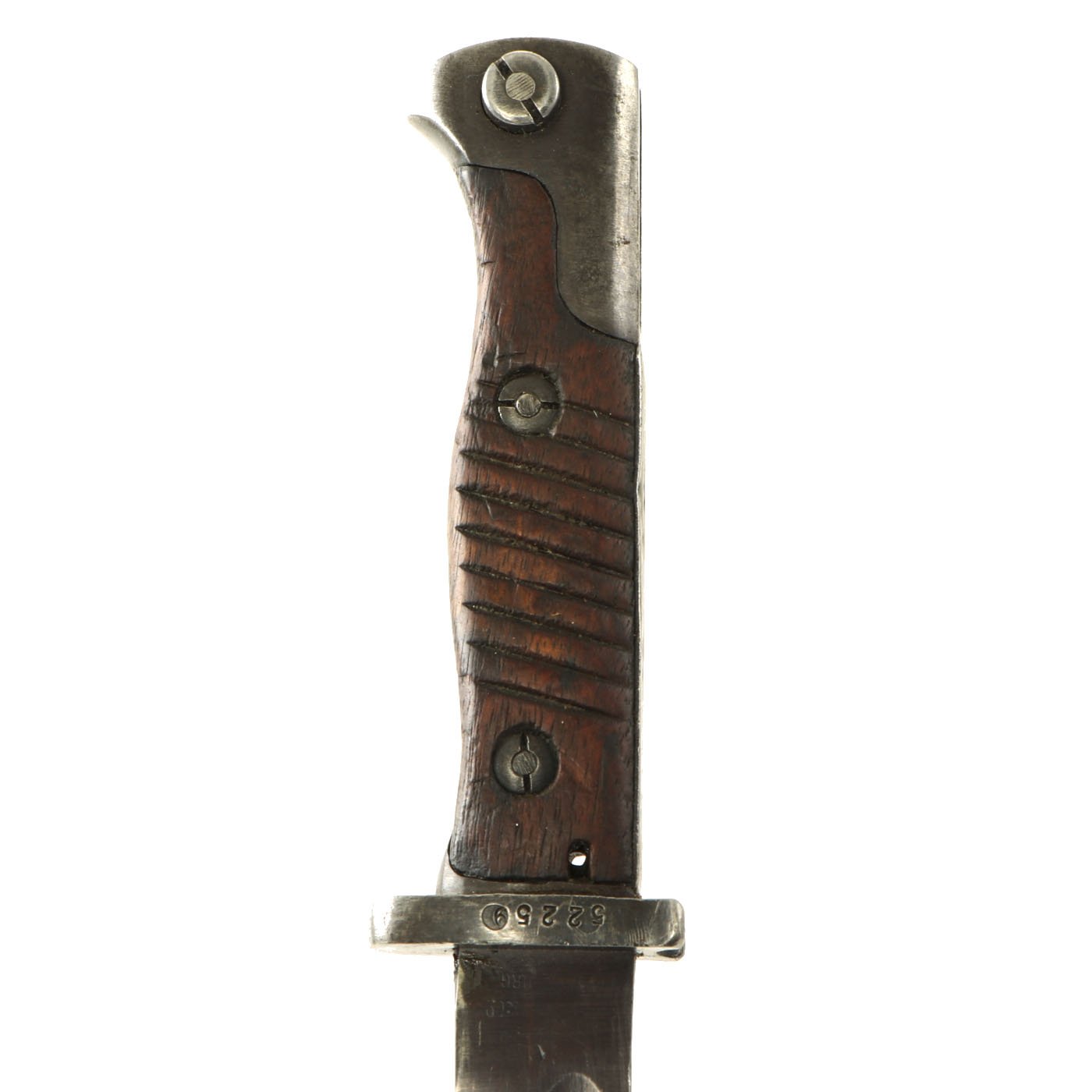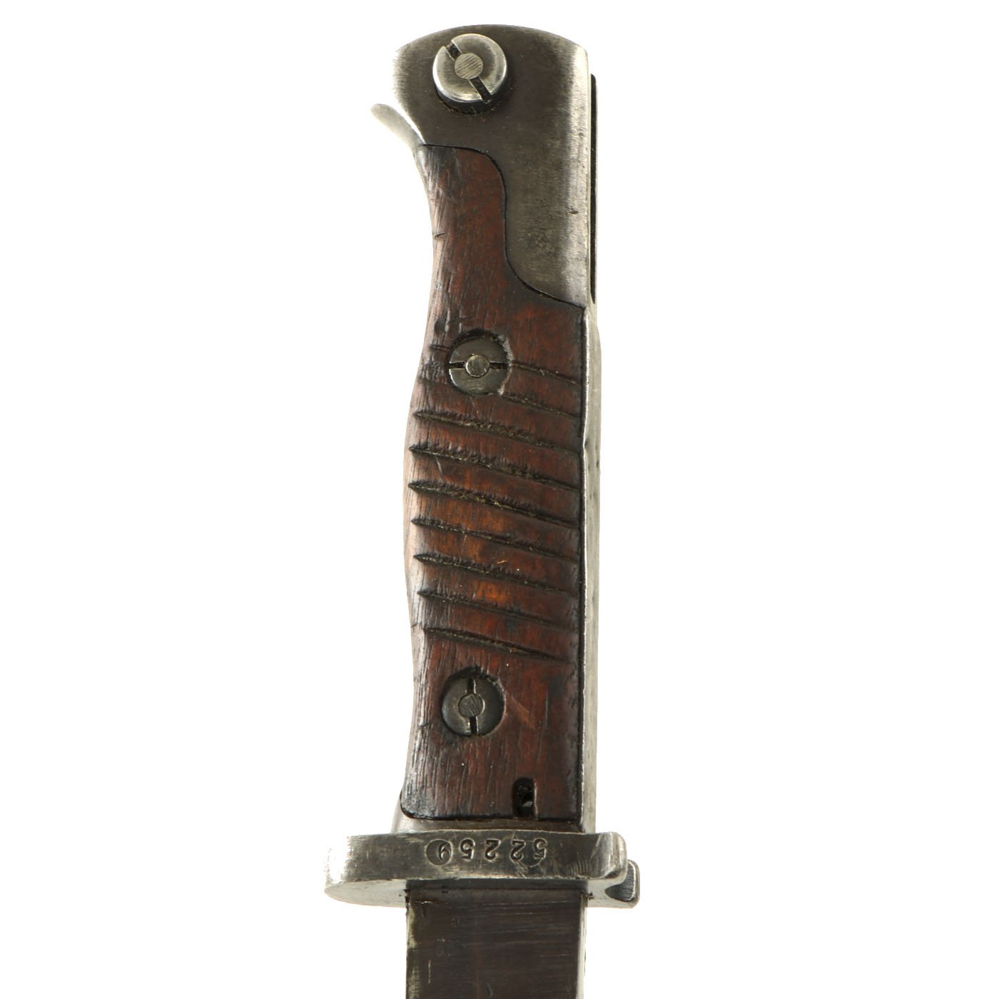 As originally manufactured, these featured a heavy 14.5-inch steel blade with distinct bulge toward the point, giving extra weight and power to the business end, known as a "butcher blade". However, this example was modified post at arsenal circa 1924 to have more standard thinner blade. The blade was reprofiled and reblued, which unfortunately has made the markings somewhat faint. The cross guard was also minimized to be closer to the standard 98K bayonet. These became known as the M98/05/24 Bayonet.