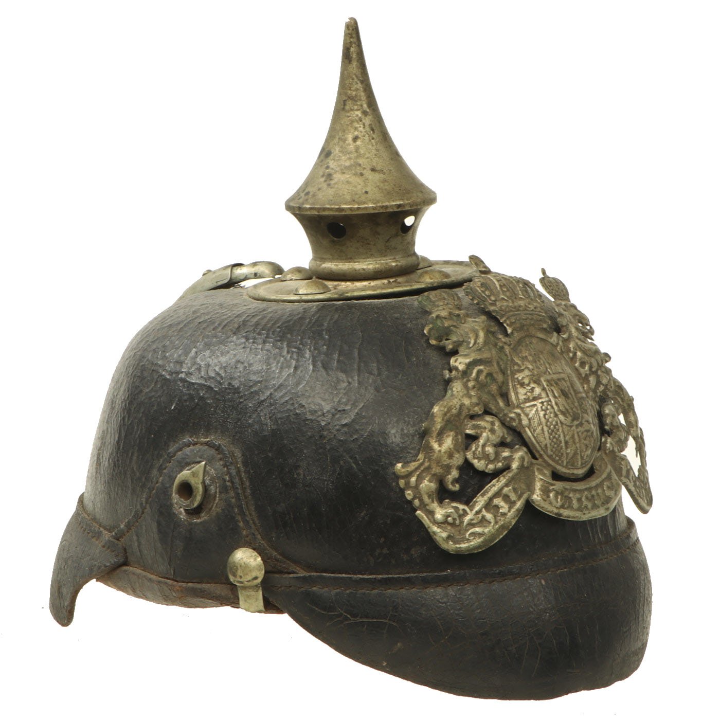 Original Item: Only One Available. This is a traditional German first world war Bavarian Mannschaften (Other Ranks) brass mounted leather helmet known as a Pickelhaube, for the Foot-troops (Infantry). The M1896 Bavarian Pickelhaube was the final pre-1914 evolution in a long series of spiked helmets, and is very similar to the M1895 Prussian version. The previous M1886 version featured a cruciform spike base on ALL helmets, both enlisted and officer. Bavarian helmets also featured chin scales on all helmets until 1914, even for enlisted men. The helmet also features the much smaller M1896 Wappen, which replaced the extremely large Wappen of the M1886.