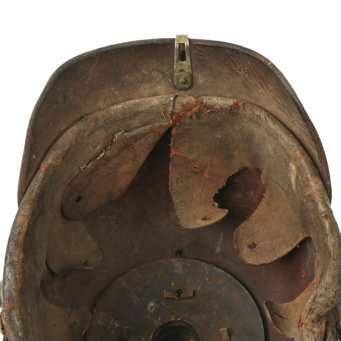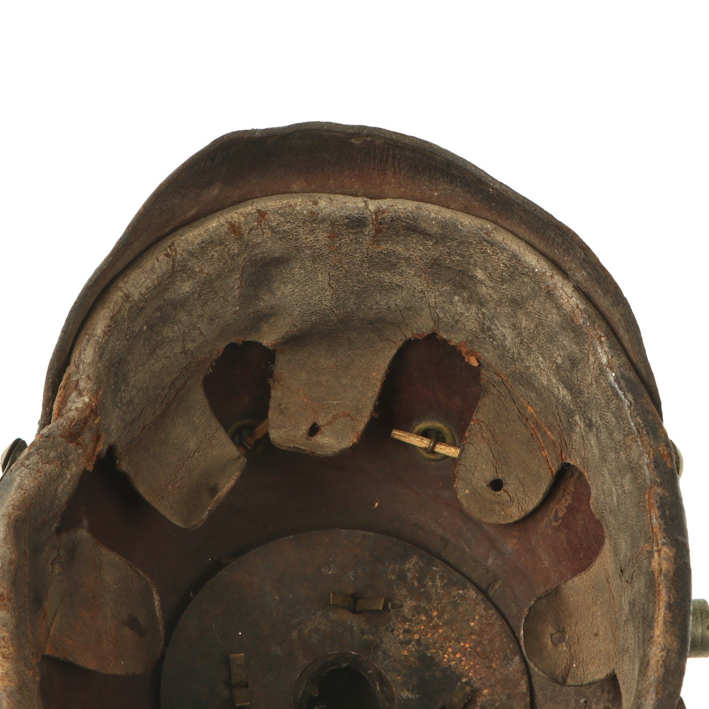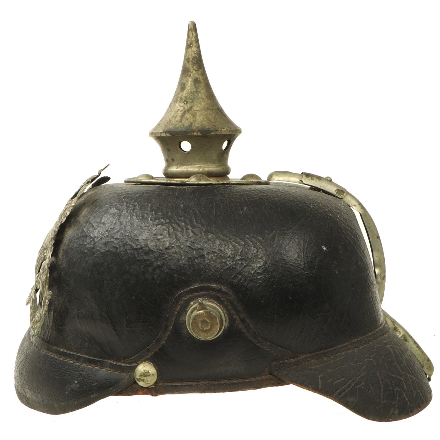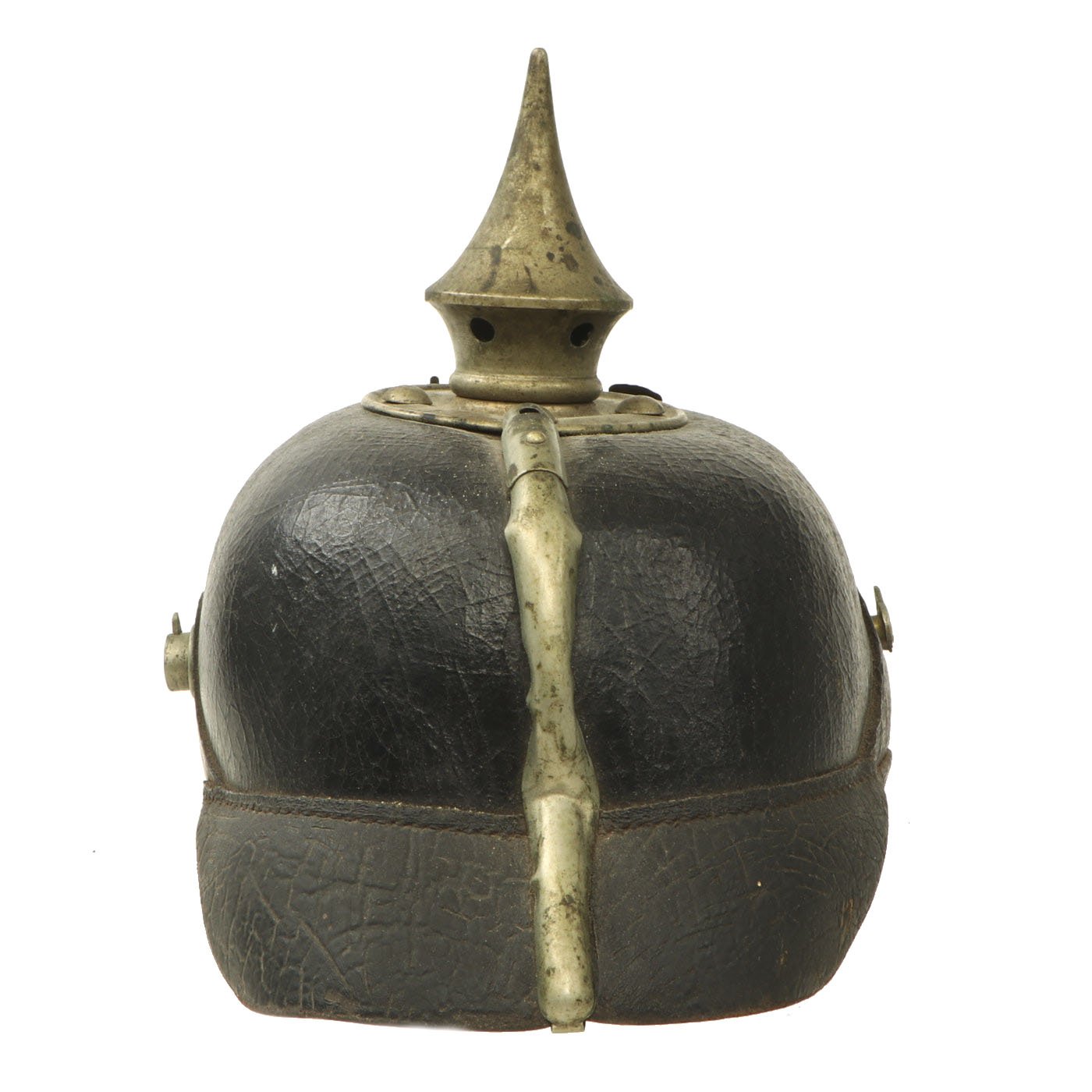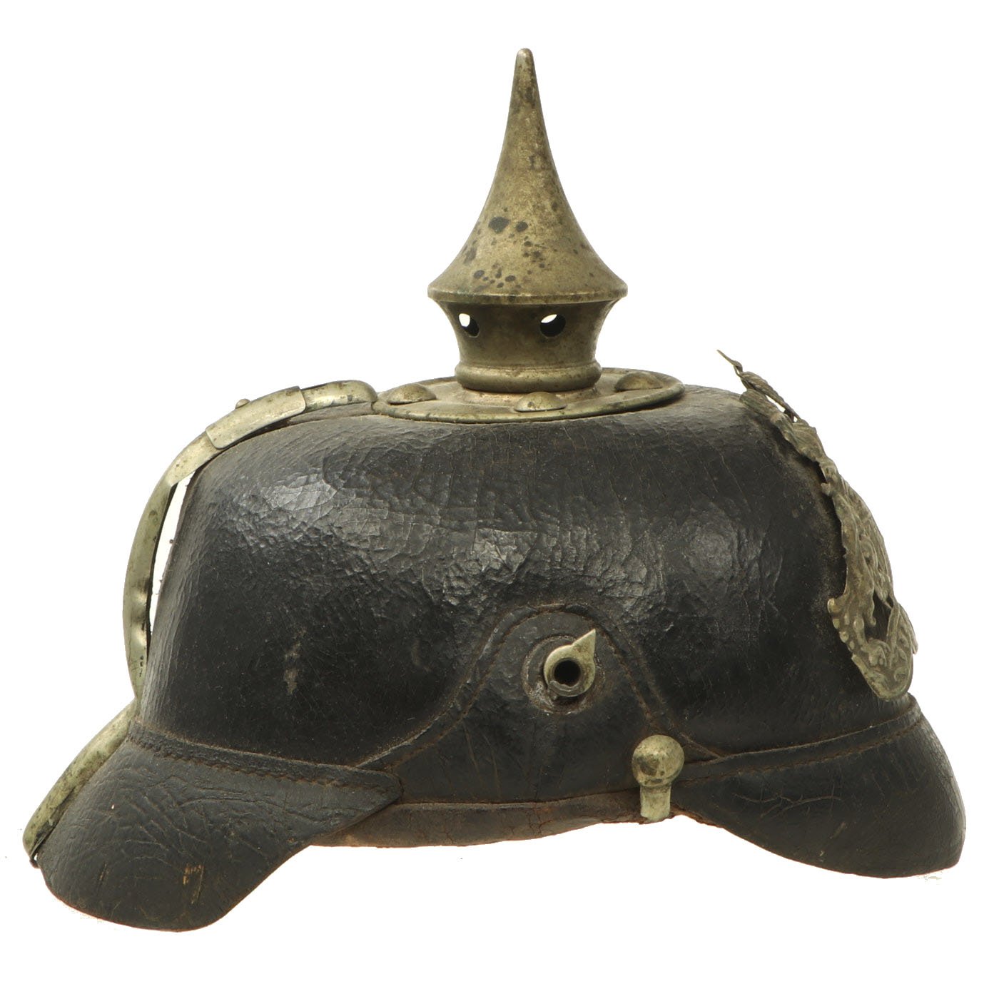 Like all pickelhauben, it was manufactured from boiled leather, lacquered black, and provided with fittings made of brass or German silver, dependent upon the Regt. The protection it offered was very limited and led to the eventual replacement by a steel helmet in 1916.