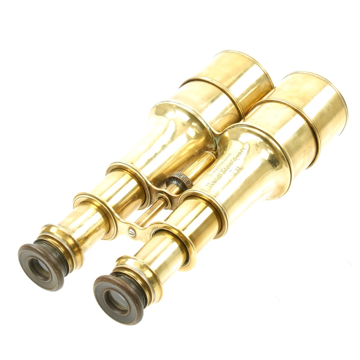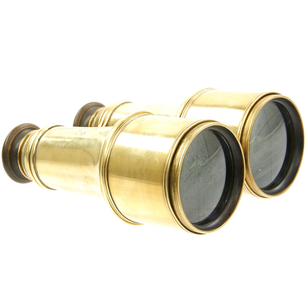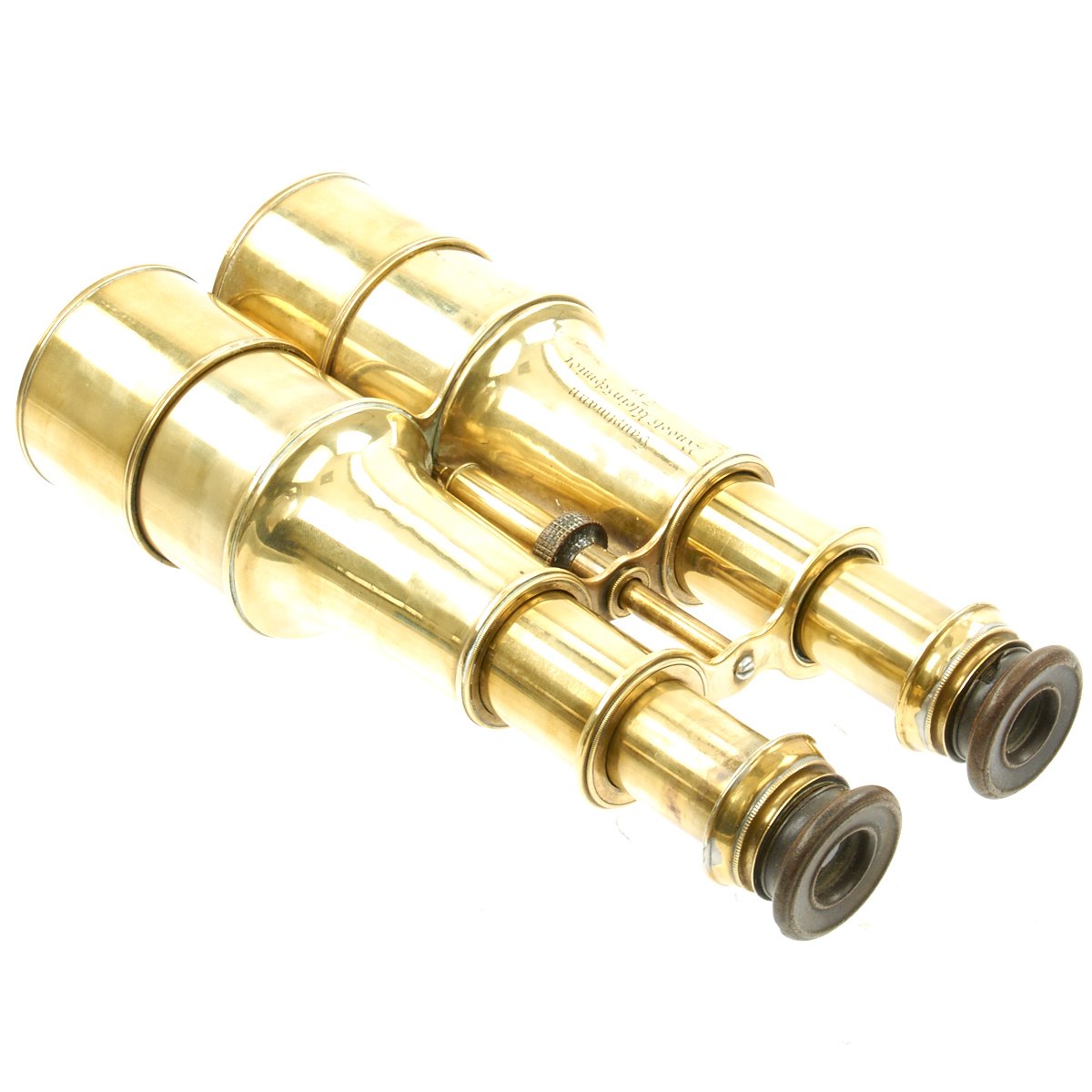 The glasses are in great shape, and are fully functional, with clear optics and smooth operation. They appear to have either wood or some form of resin Eye pieces and one of the brass barrels is engraved with the owner's name: