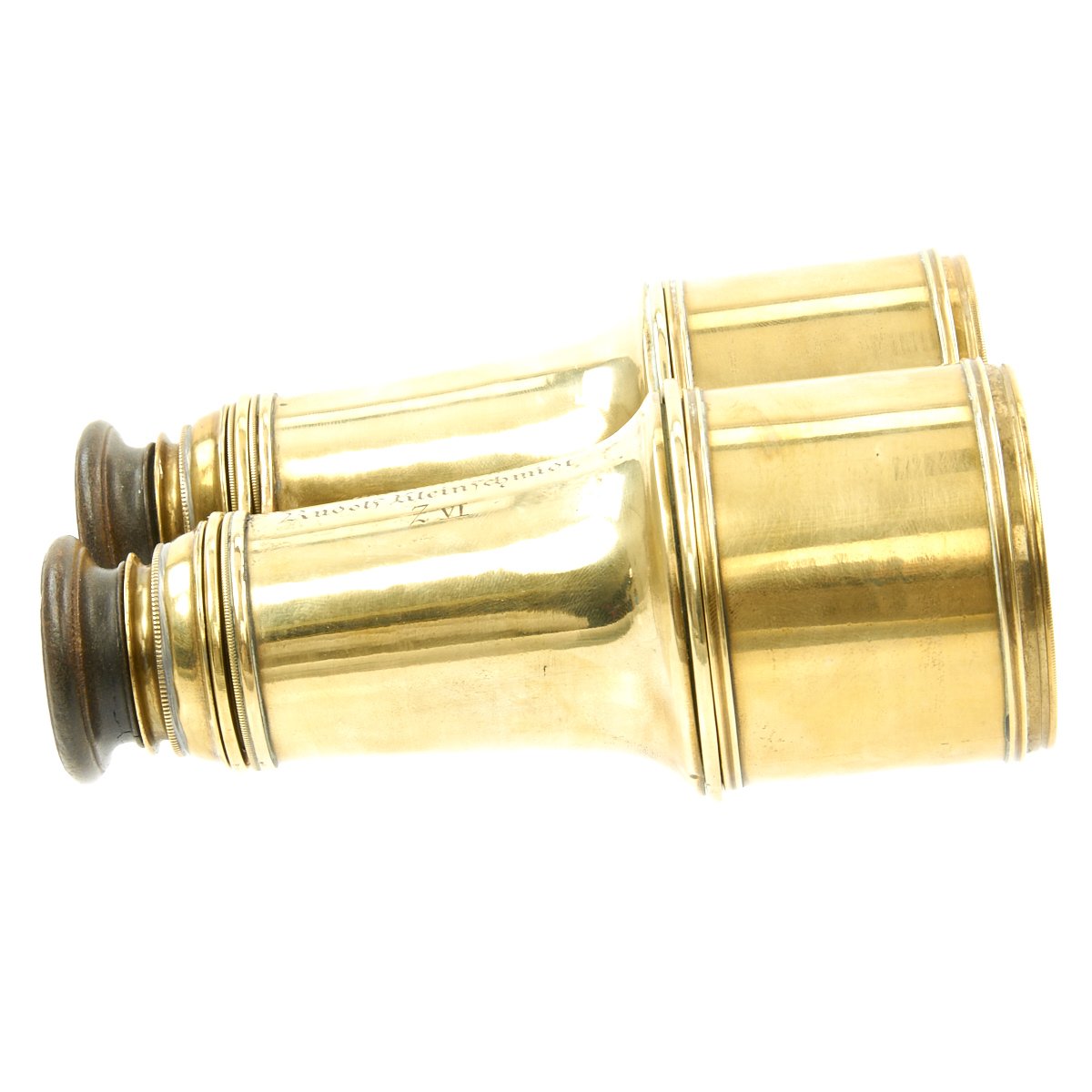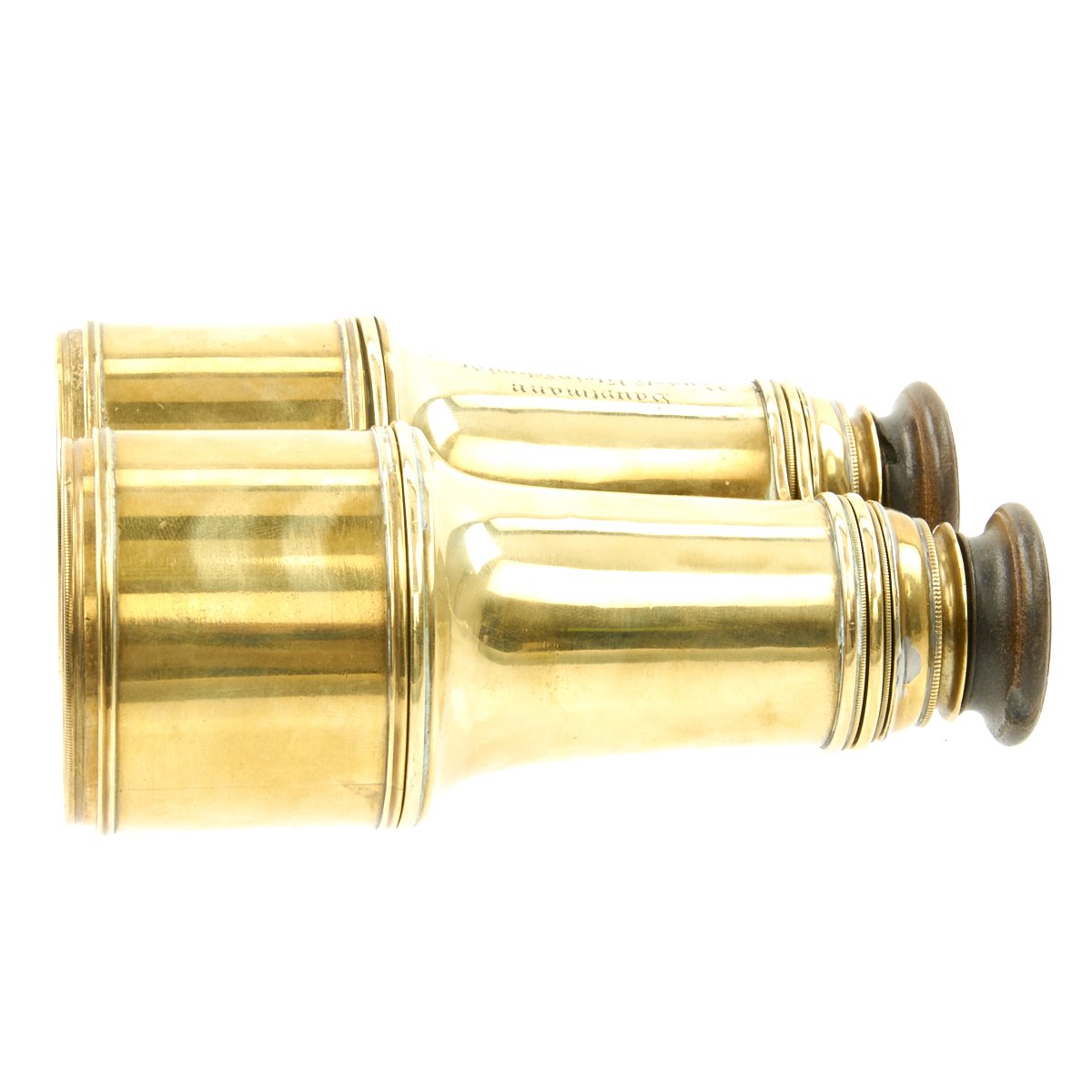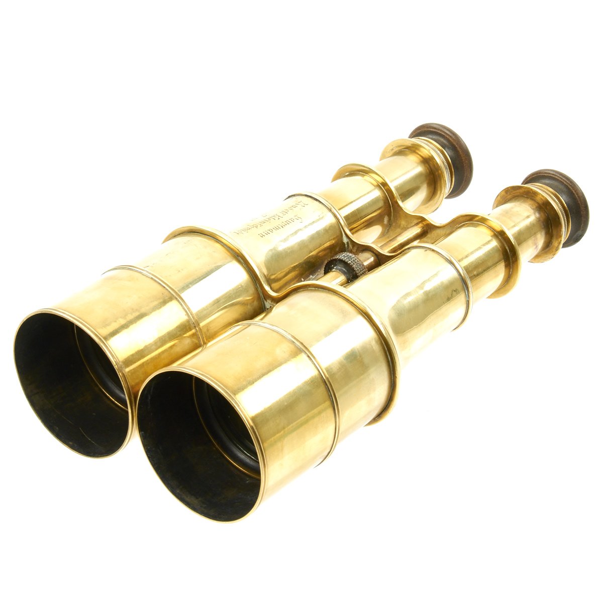 The glasses are in great shape, and are fully functional, with clear optics and smooth operation. They appear to have either wood or some form of resin Eye pieces and one of the brass barrels is engraved with the owner's name: