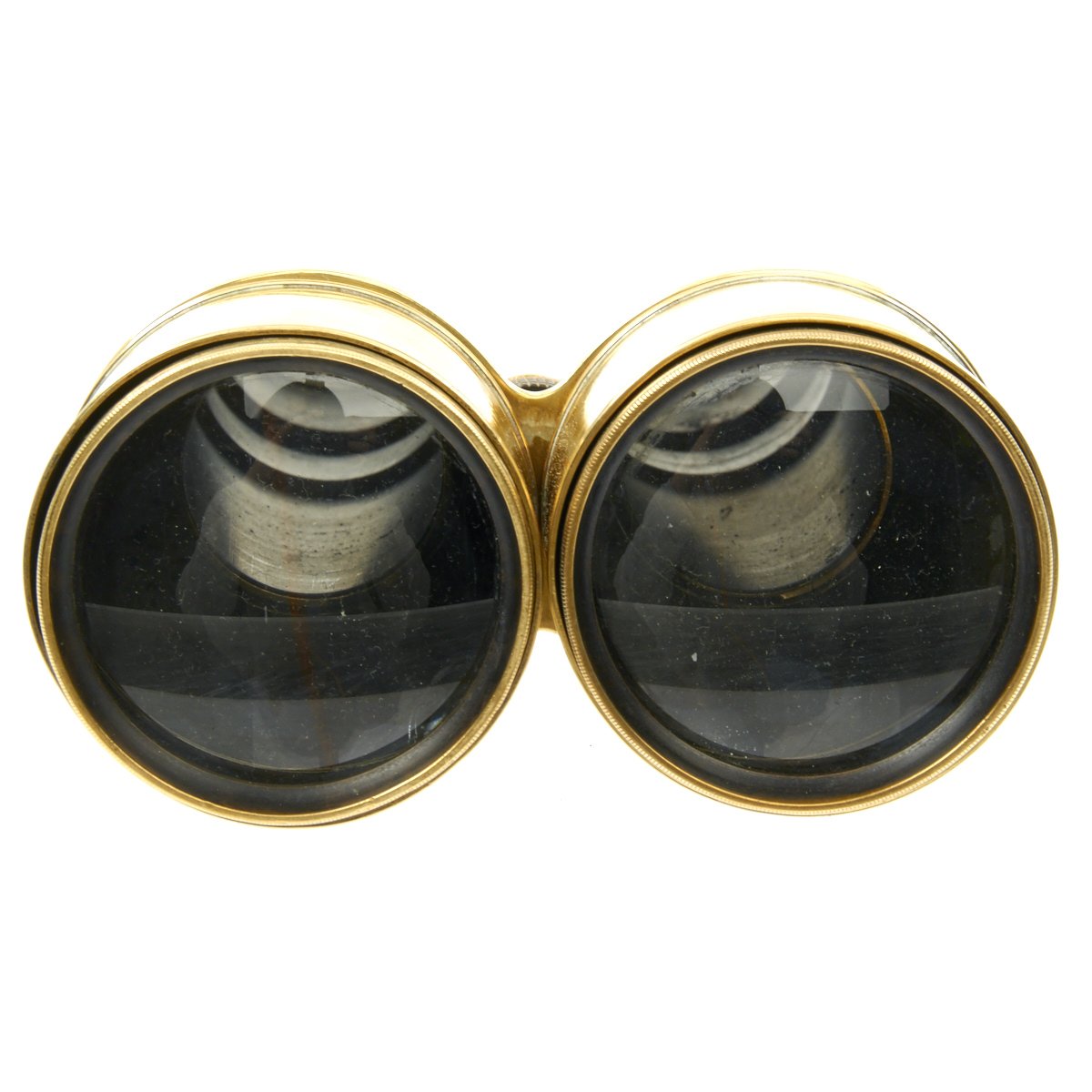 Original Item: One of a Kind Pair. Now these are definitely an interesting design of field glasses, of top quality construction. They measure approximately 6 inches when fully collapsed, and extend to about 9 inches long, having in fact THREE brass barrels. The set closest the eyepieces just pulls out, however the middle draw is controlled with the central wheel. They also have sun shields on both sides, which brings the total length to just over 10 inches.