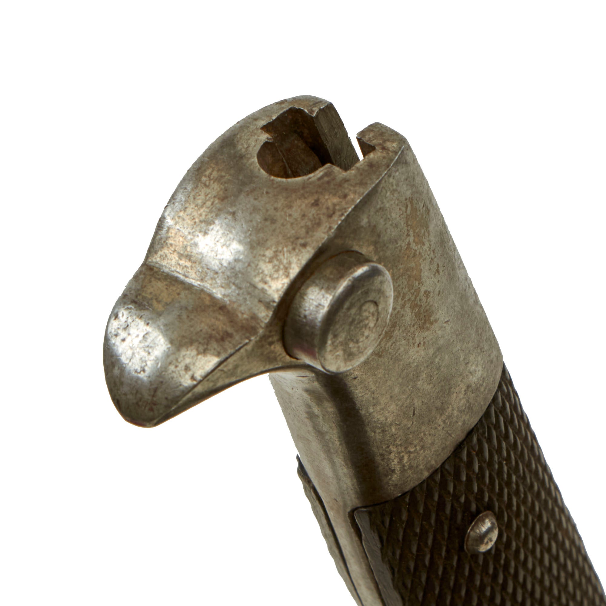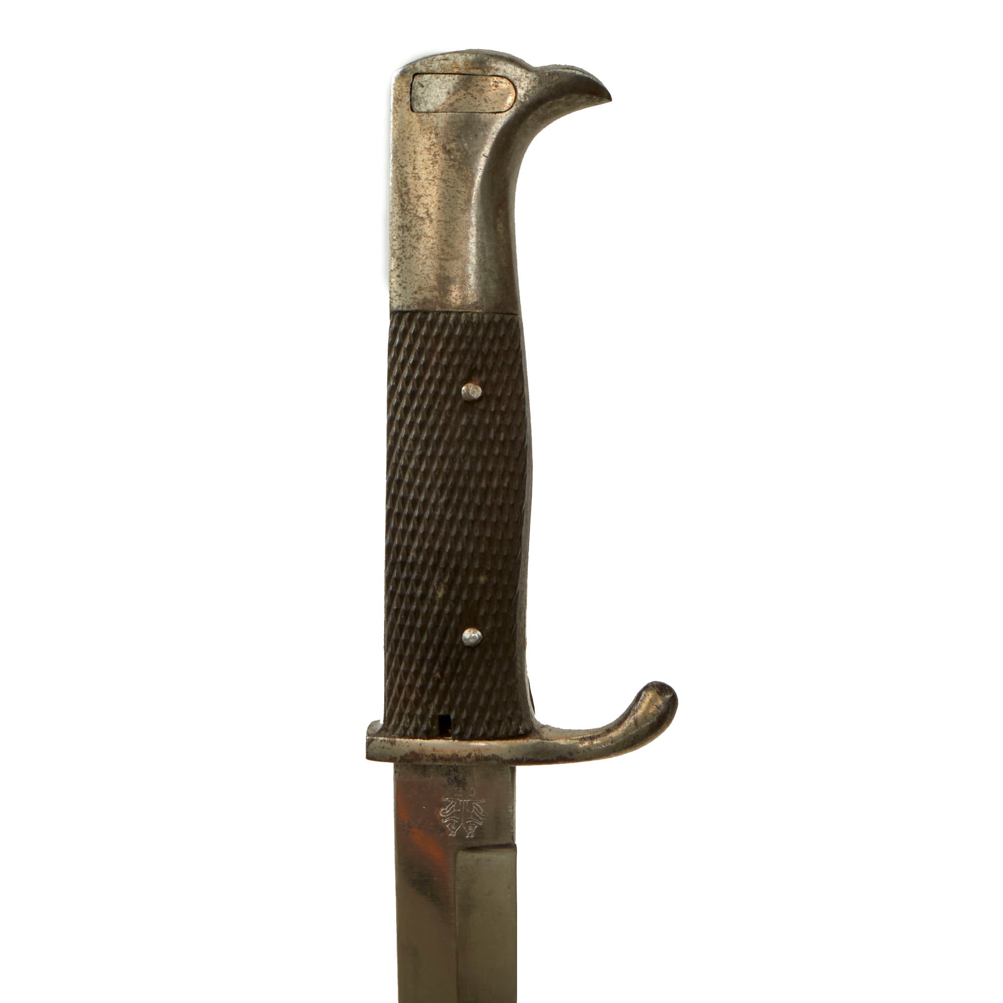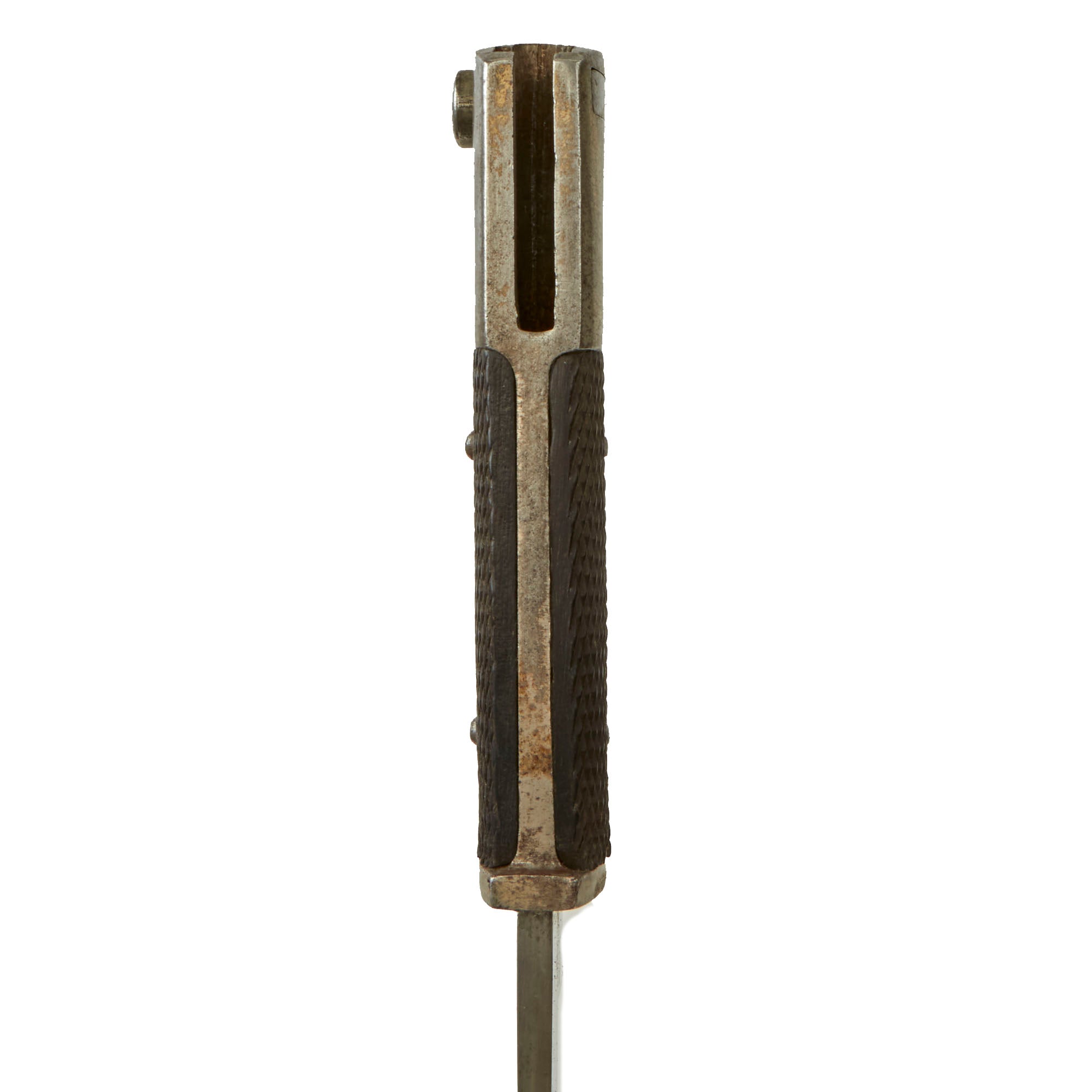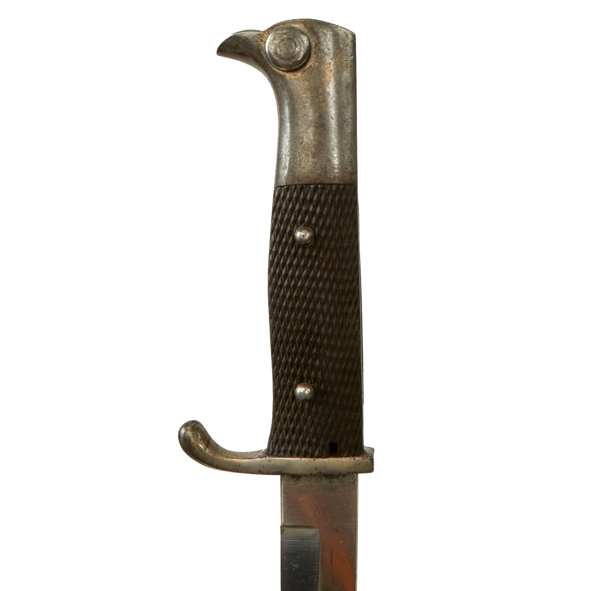 This example has a very nice set of original checkered bakelite grips, held in place by two steel rivets. The bird's head pommel is in good shape, with a lovely oxidized patina, and the bayonet lock is fully functional.