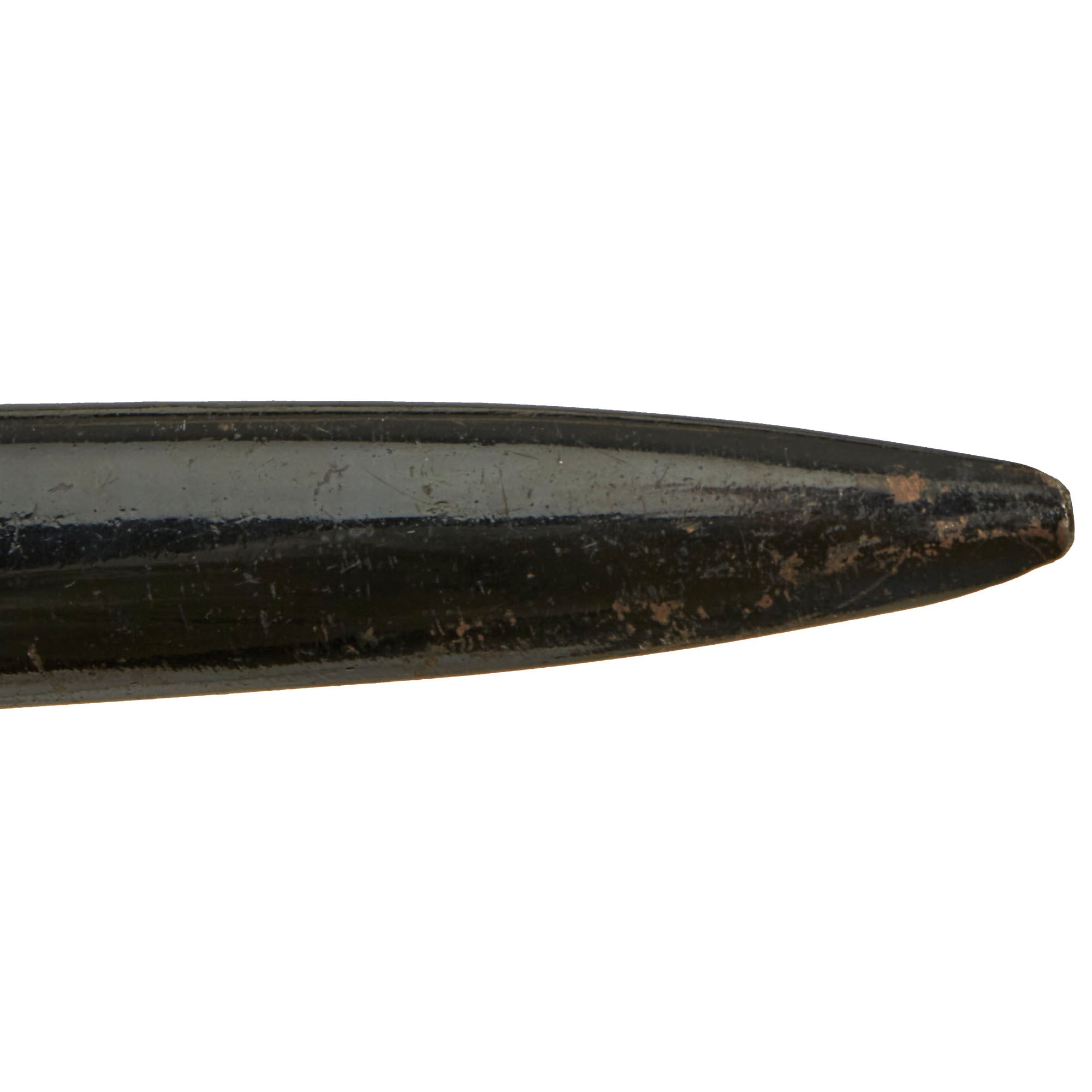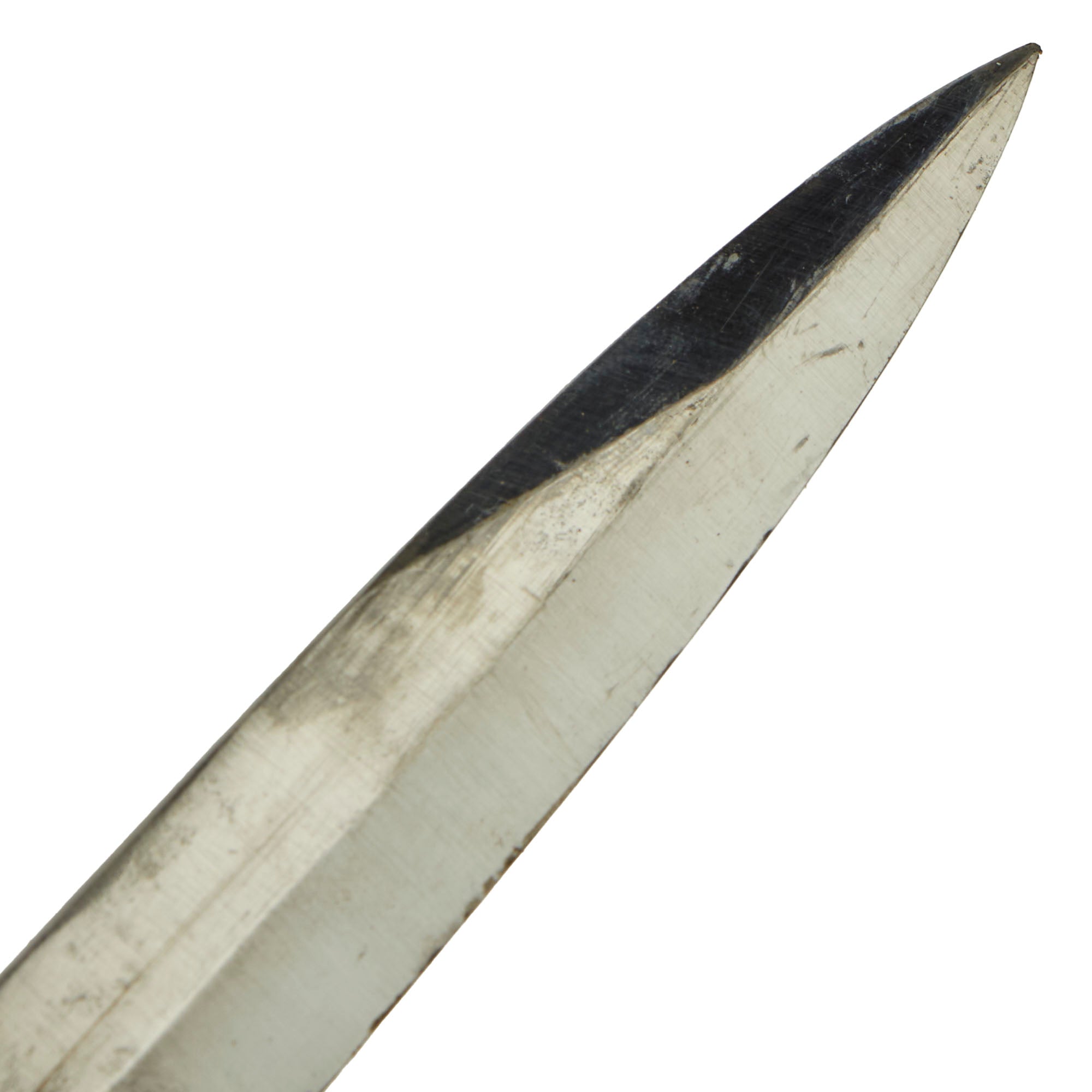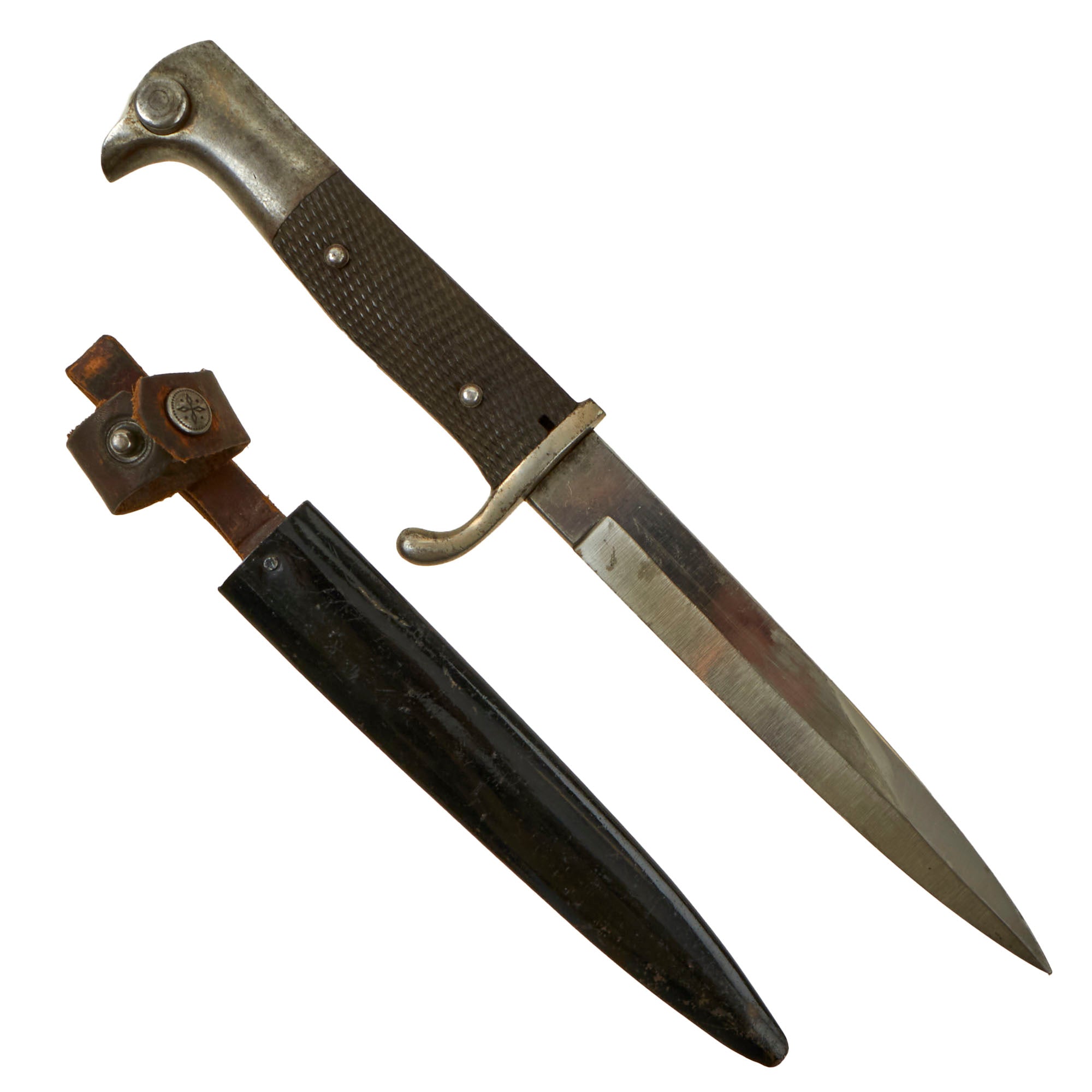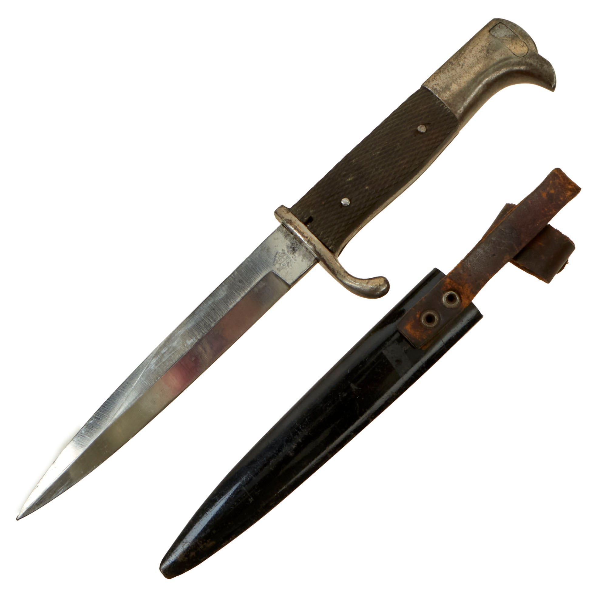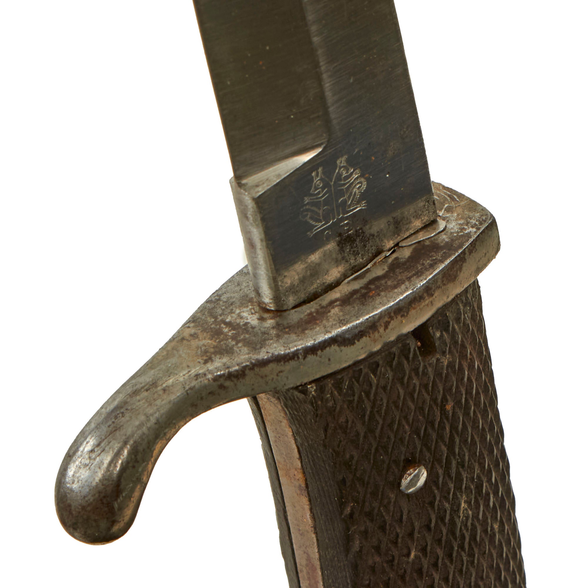This example has a very nice set of original checkered bakelite grips, held in place by two steel rivets. The bird's head pommel is in good shape, with a lovely oxidized patina, and the bayonet lock is fully functional.