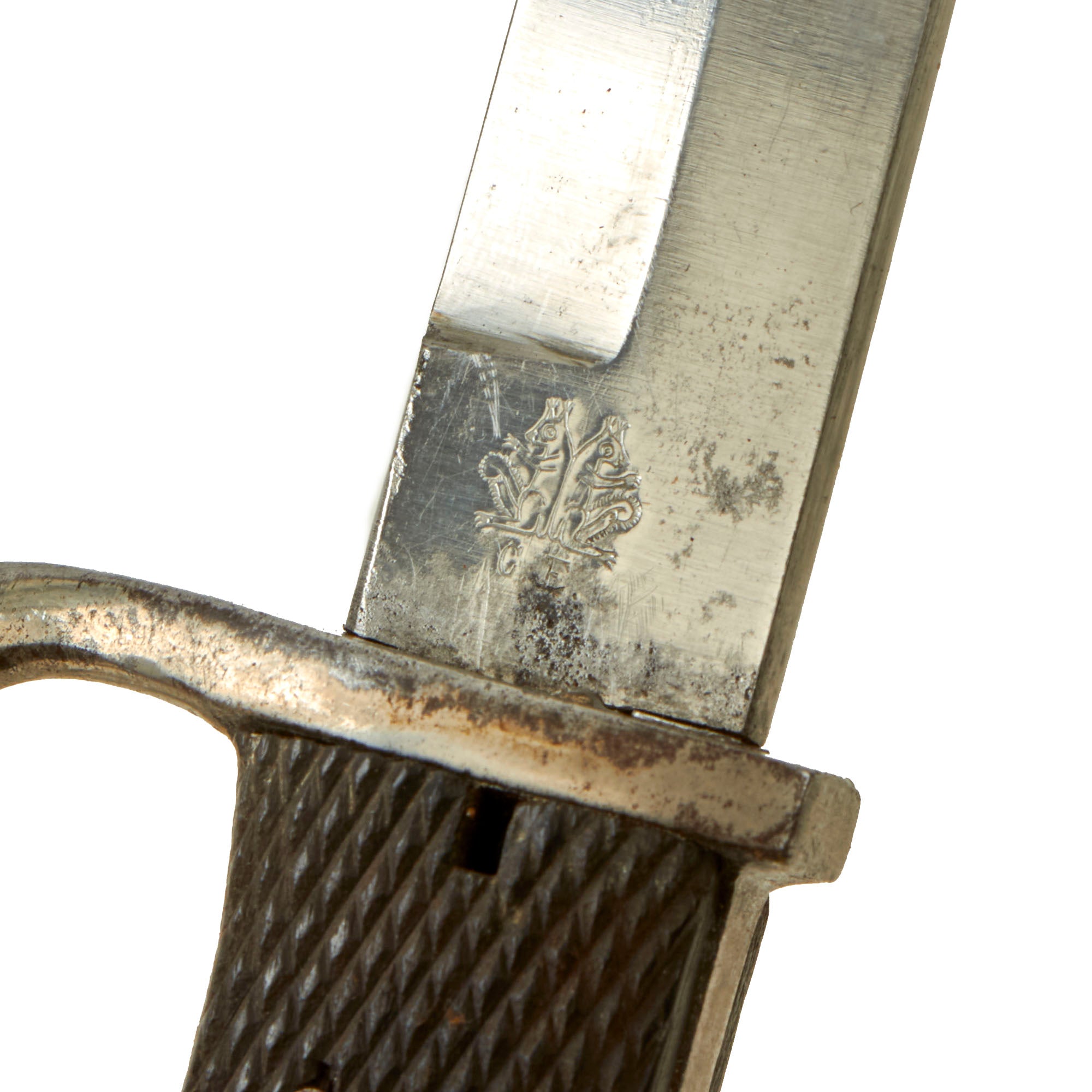 The reverse ricasso is stamped with the Carl Eickhorn "Two Squirrel" trademark over C.E., for manufacture by the legendary firm of Carl Eickhorn, located in Solingen, the "City of Blades" in Western Germany. Per J. Anthony Carter's book GERMAN KNIFE AND SWORD MAKERS, this specific version of the mark was used on swords, "walking out" bayonets, and other similar items after 1906. This is exactly the mark that should be on a WWI Blade.