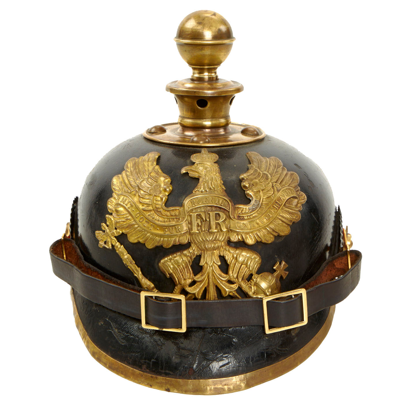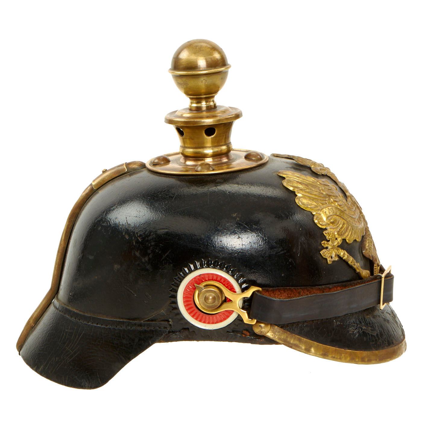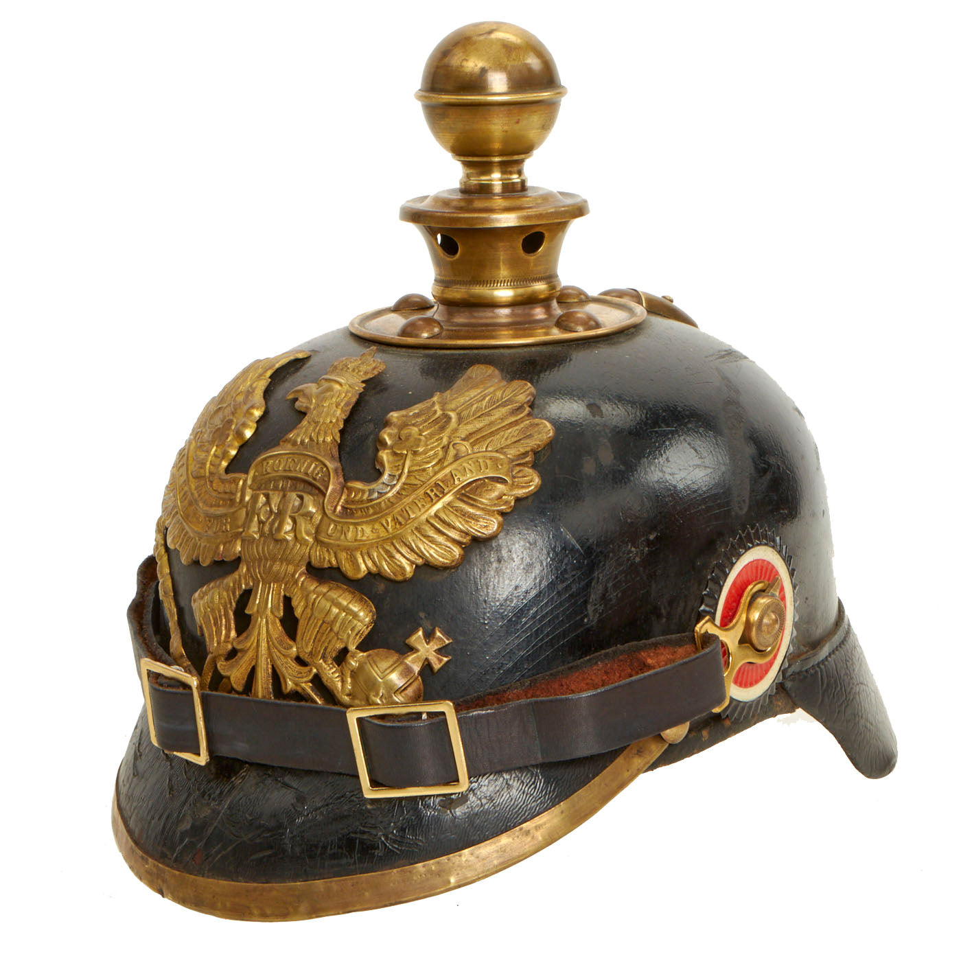 Original Item: Only One Available. This is a very good condition Imperial Prussian Artillery enlisted man's Mannschaften (other ranks) pickelhaube (pointed hood). On this version of the Pickelhaube, a ball representing a cannon ball replaced the usual spike, leading this to be referred to as an Artillerie Kugelhelm (Artillery Ball-Top Helm). The M1895 was the final pre-1914 evolution in a long series of pickelhaube helmets. It displays a lovely condition brass Prussian spread eagle helmet plate and comes complete with original leather liner with only the leather drawstring missing. The helmet retains the correct all brass alloy fittings, and the "ball top" can still unscrew for the addition of a plume if desired.